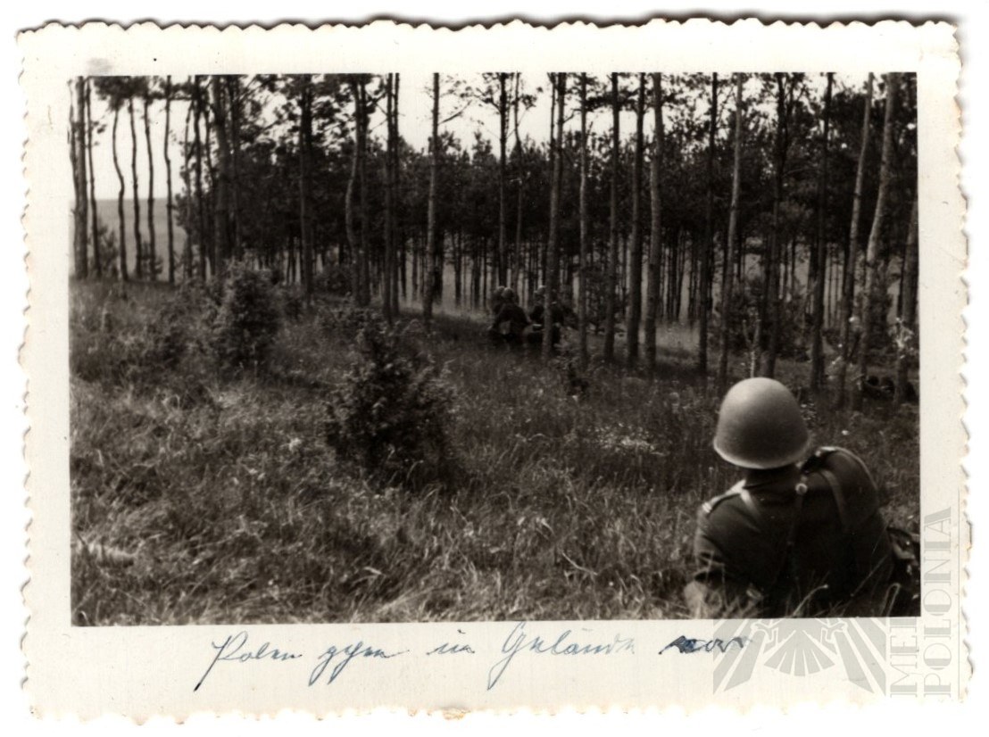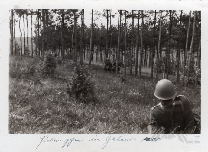 Zdjęcie przedstawiające Polskich żołnierzy w trakcie walki we wrześniu 1939 roku, przenoszącego rannego żołnierza, prawdopodobnie wykonane przez Niemców bezpośrednio po walkach (nieczytelny napis niemiecki).
