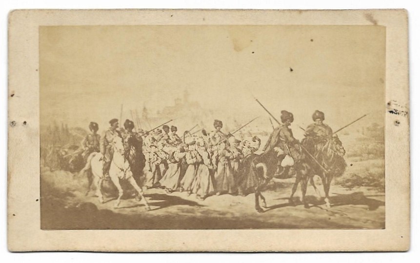 [POWSTANIE styczniowe - scena "Wymarsz z Warszawy rekrutów pod eskortą wojska carskiego. W tle fragment sylwety miasta"]. [po 7 III 1863]. Fotografia form. 5,3x8,9 cm na oryg. podkładzie form. 6,3x10,5 cm.