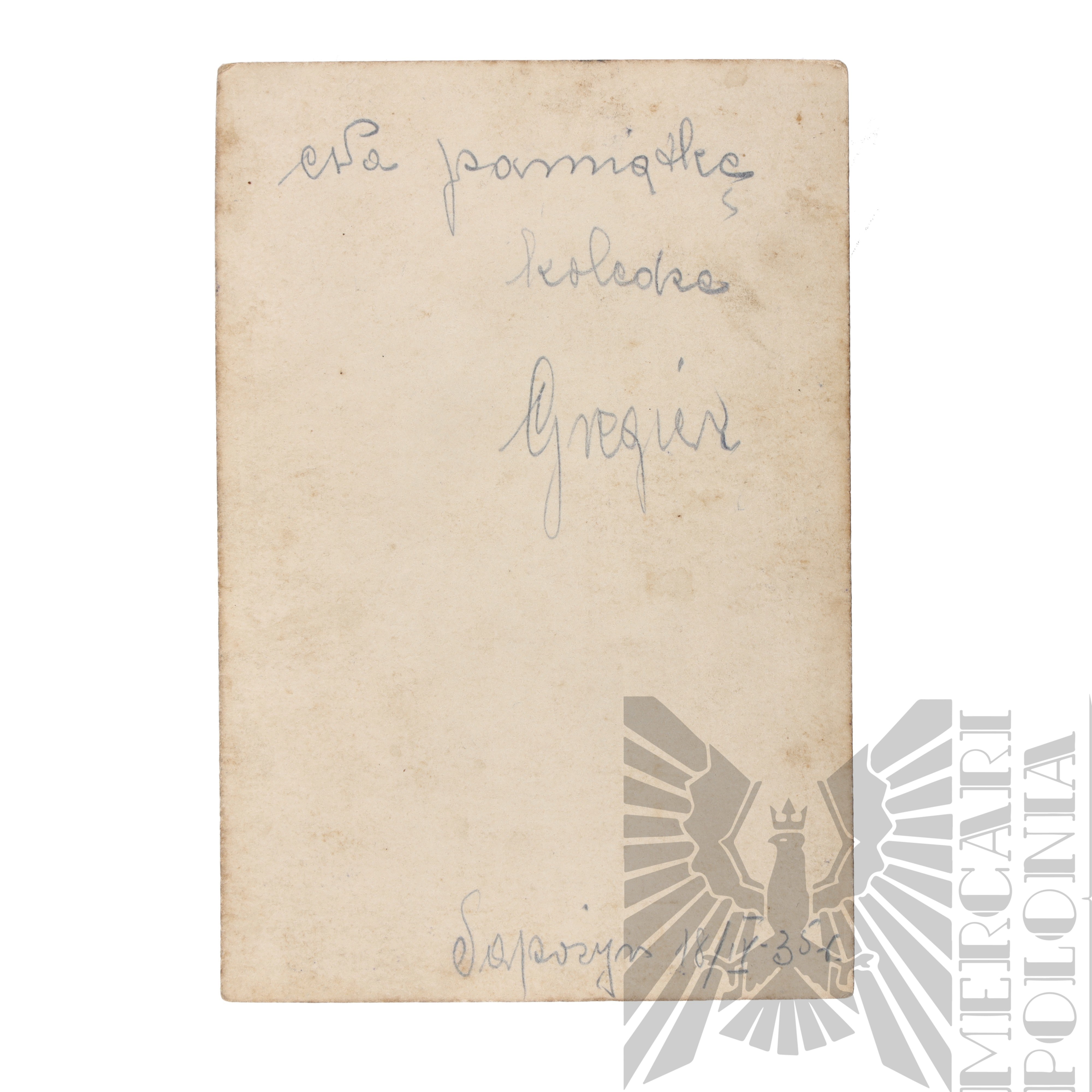 Fotografia żołnierza Korpusu Ochrony Pogranicza, doskonale widoczna czapka tzw. “kopówka”. Na odwrocie fotografii widoczna dedykacja “Na pamiątkę koledze/Sapieżyn 18/IV-35r.”. Fotografia pochodzi z zestawu pamiątek po żołnierzu Korpusu Ochrony Pogranicza Batalion “Hoszcza”.