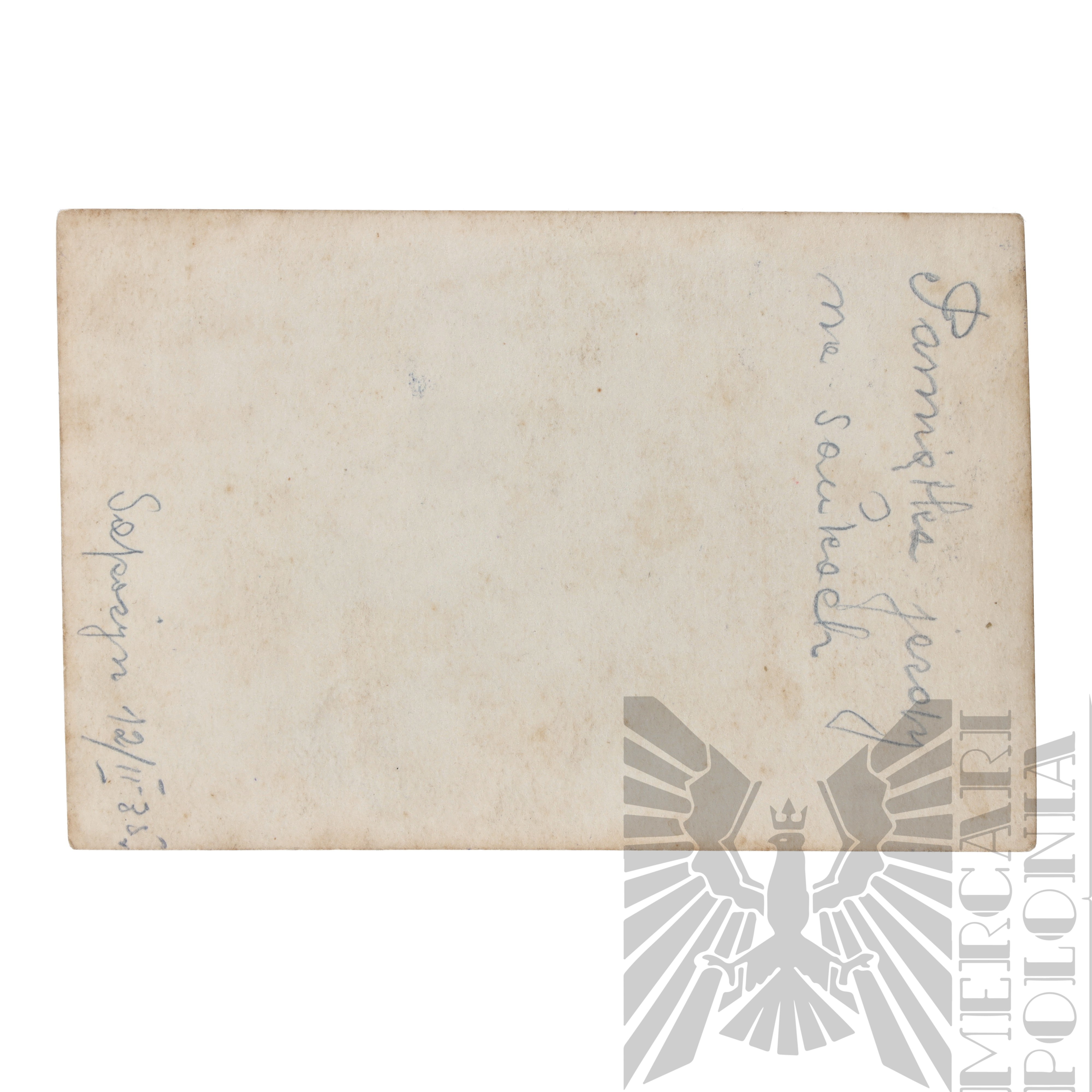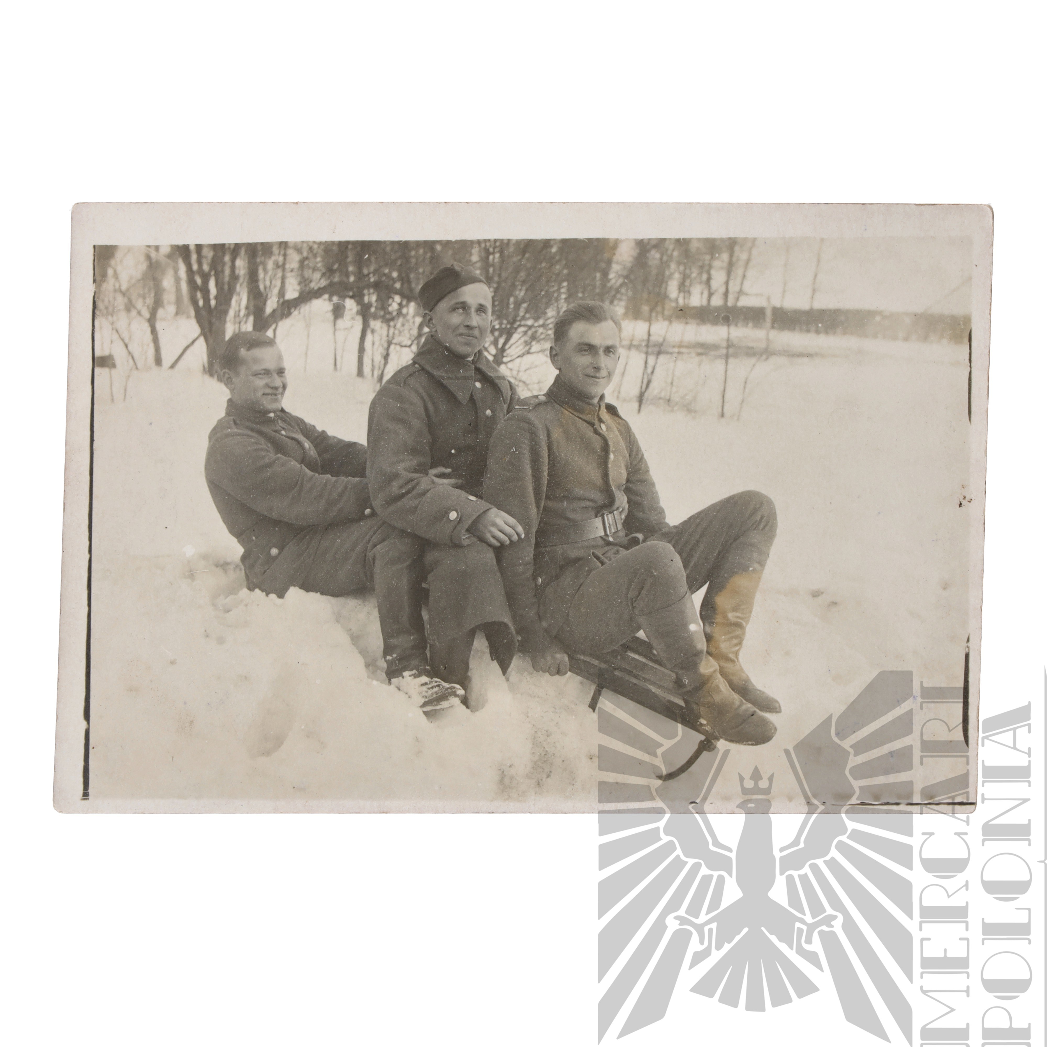 Fotografia żołnierzy Korpusu Ochrony Pogranicza podczas jazdy na sankach. Fotografia opatrzona podpisem “Pamiątka jazdy na sankach/Sapiezyn 12/II35r.”