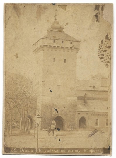 Przedstawia widok na bramę z widoczną po prawej stronie wzniesioną w 1840 dozorcówką i nieistniejącym przejściem dla pieszych. Na dolnym marginesie kliszy nadruk tytułowy: "32. Brama Floryańska od strony Kleparza". Zdjęcie naklejone na kartonowy podkład. Zdjęcie bez winiety reklamowej fotografa, wyblakłe, zaplamione, z ubytkiem prawego górnego narożnika, z zaplamieniami na odwrocie. Podobne ujęcie reprod. w: E. Gaczoł, T. Kwiatkowska "Ignacy Krieger", str. 14.