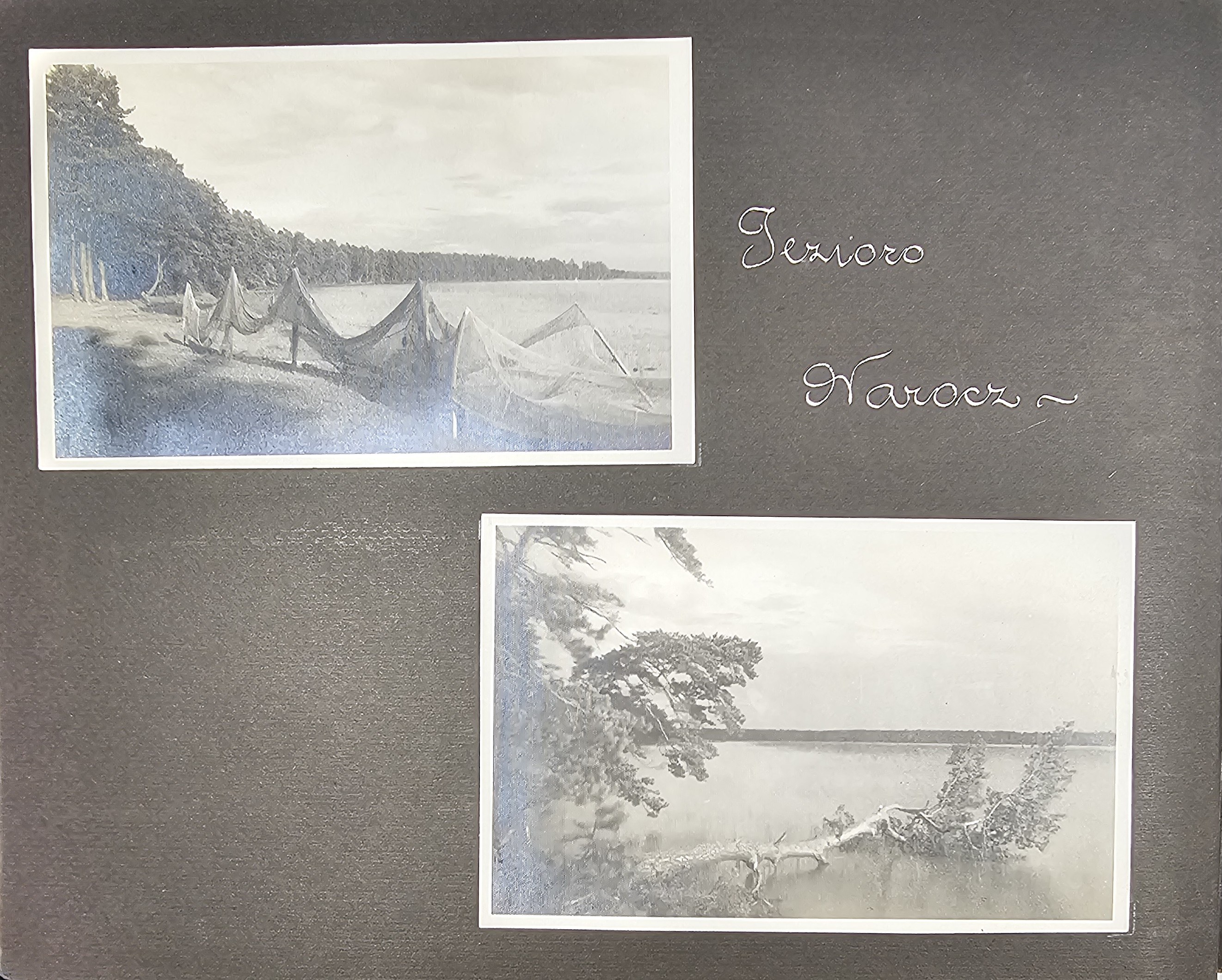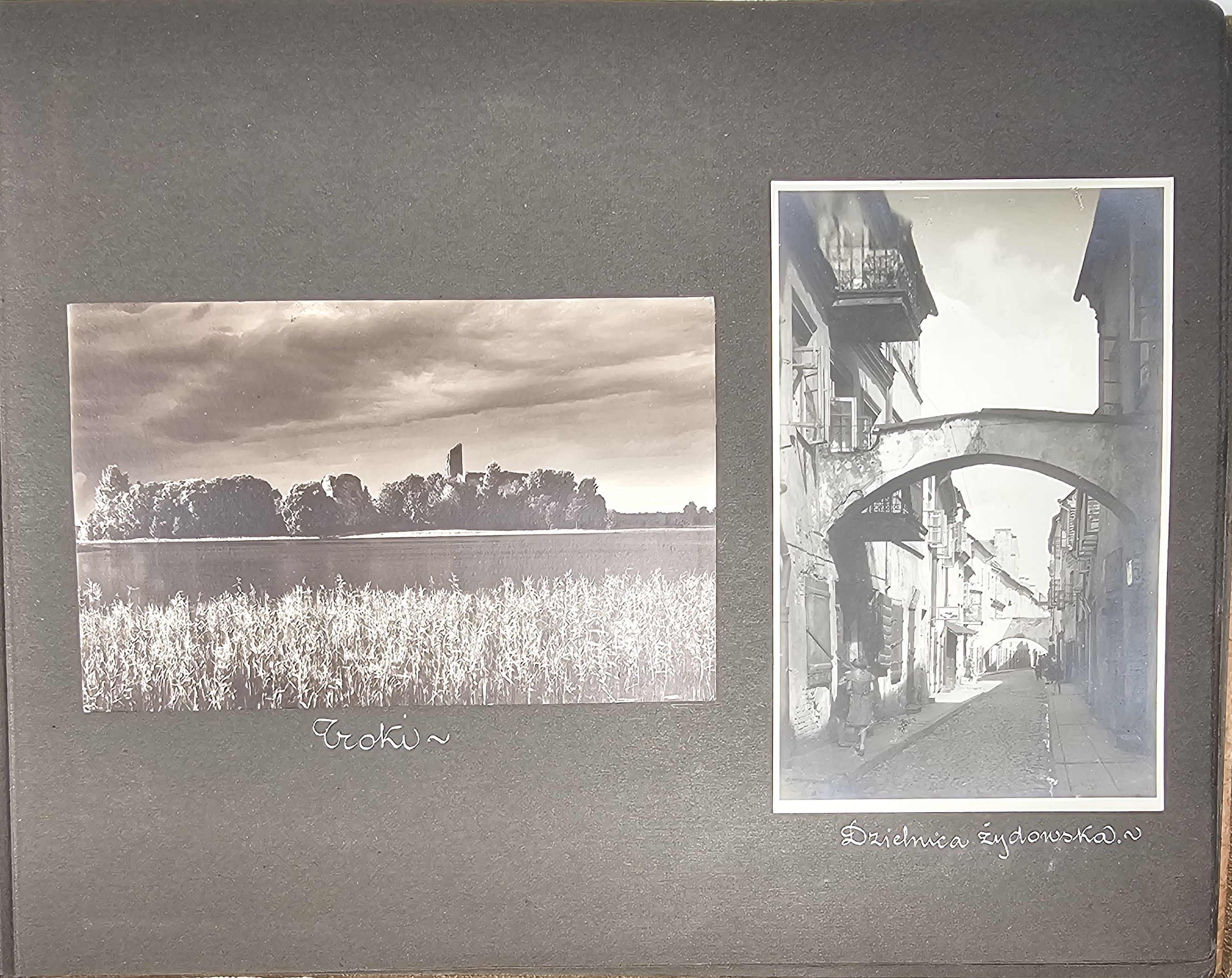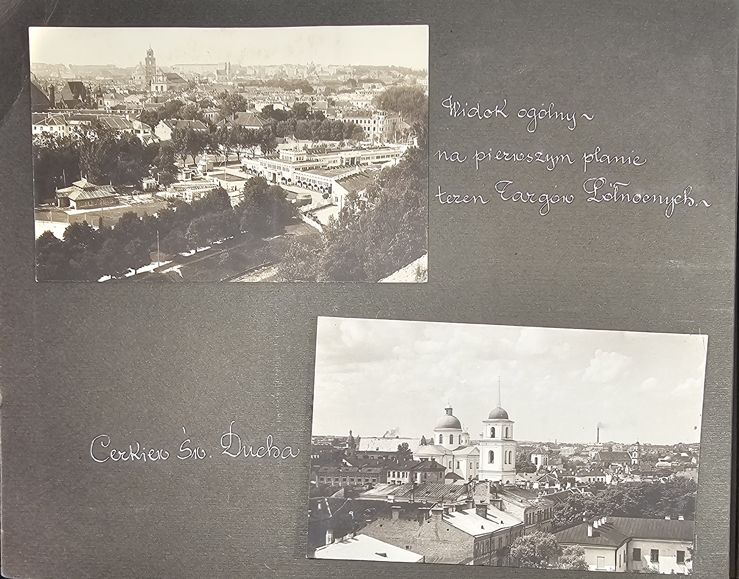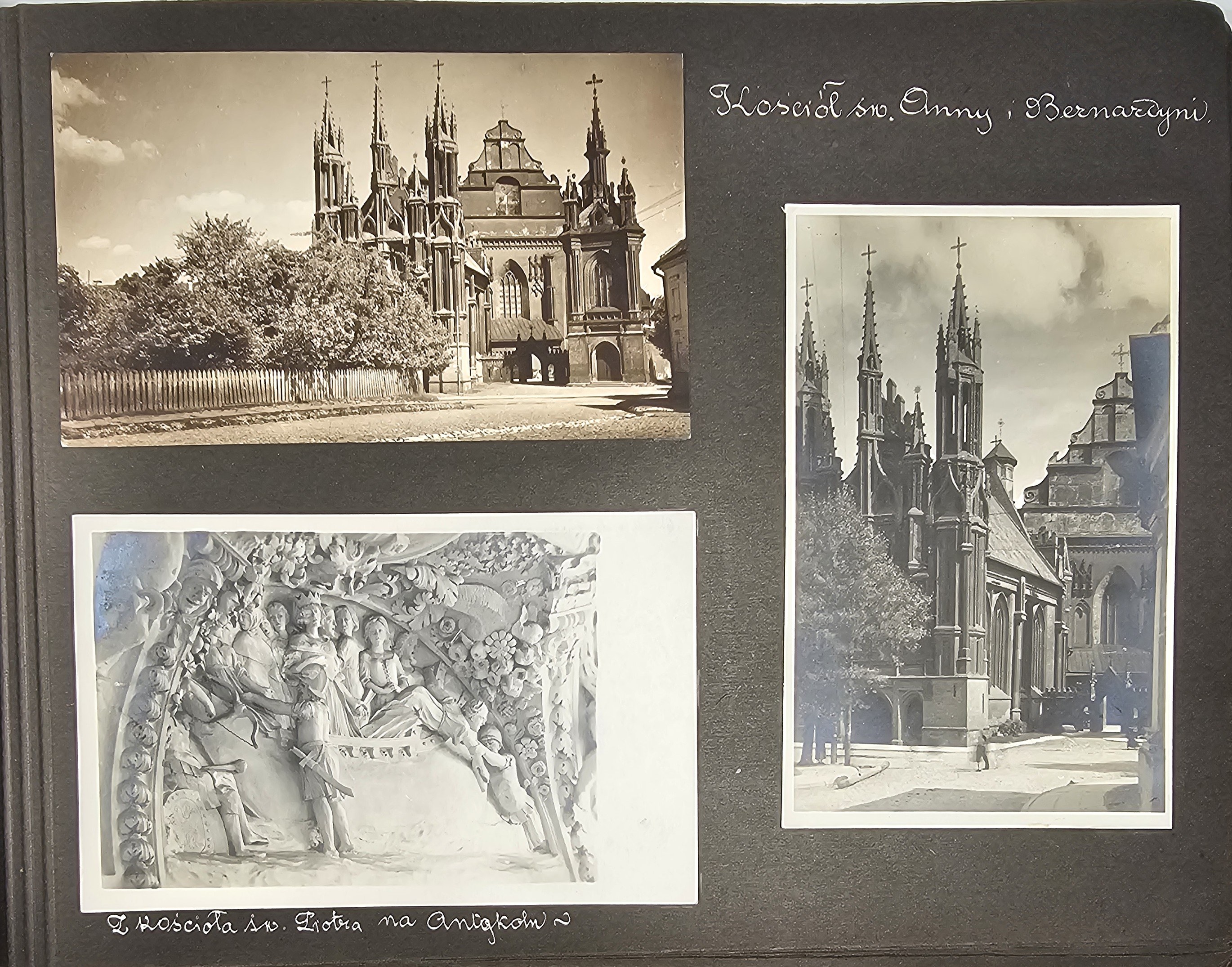 Album o wym. zewn.: 295 x 215 mm, karty o wym.: 260 x 205 mm. 12 kart, 38 o wym. pocztówkowym ok.: 140 x 90 mm oraz 14 fotografii o wym. ok.: 80 x 105 mm, razem 52 fotografie, niektóre sygnowane fot. L. Wysocki, Wilno. Wszystkie fotografie (pocztówki) sfotografowane. Stan dobry.