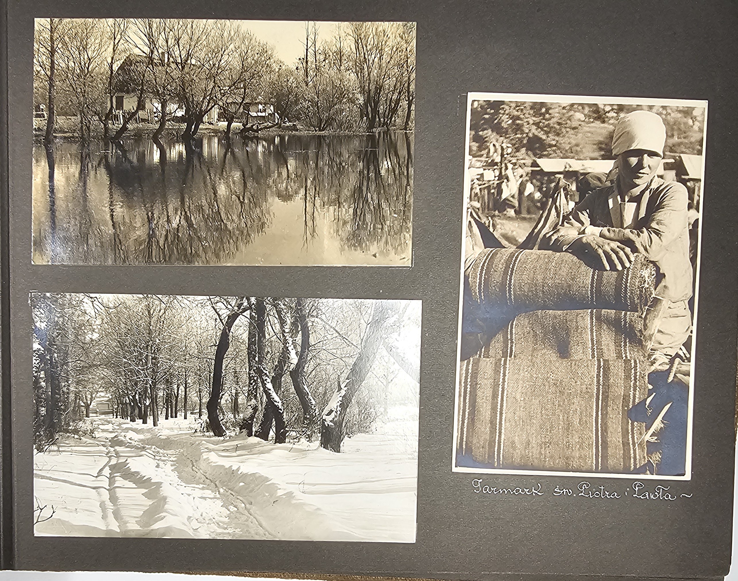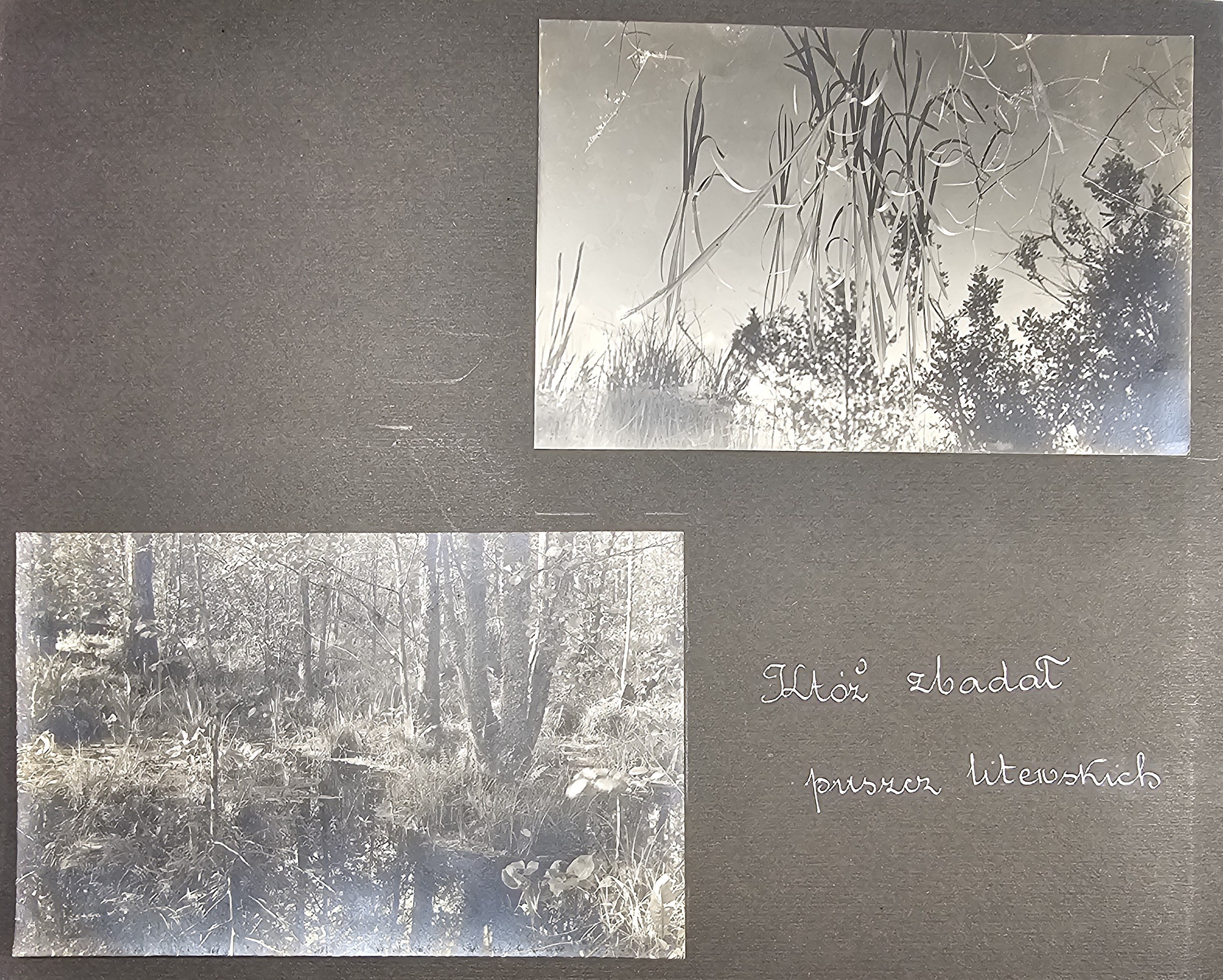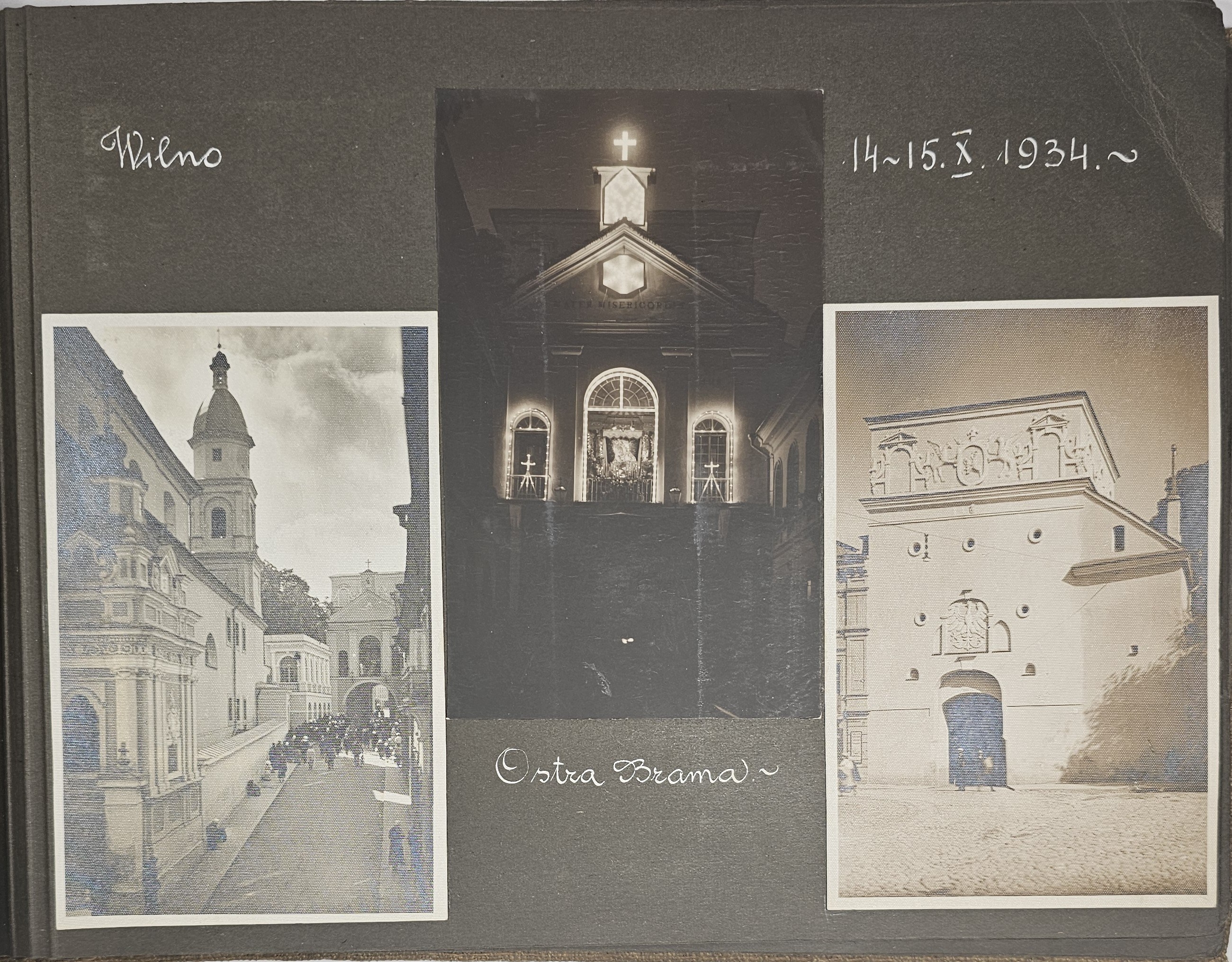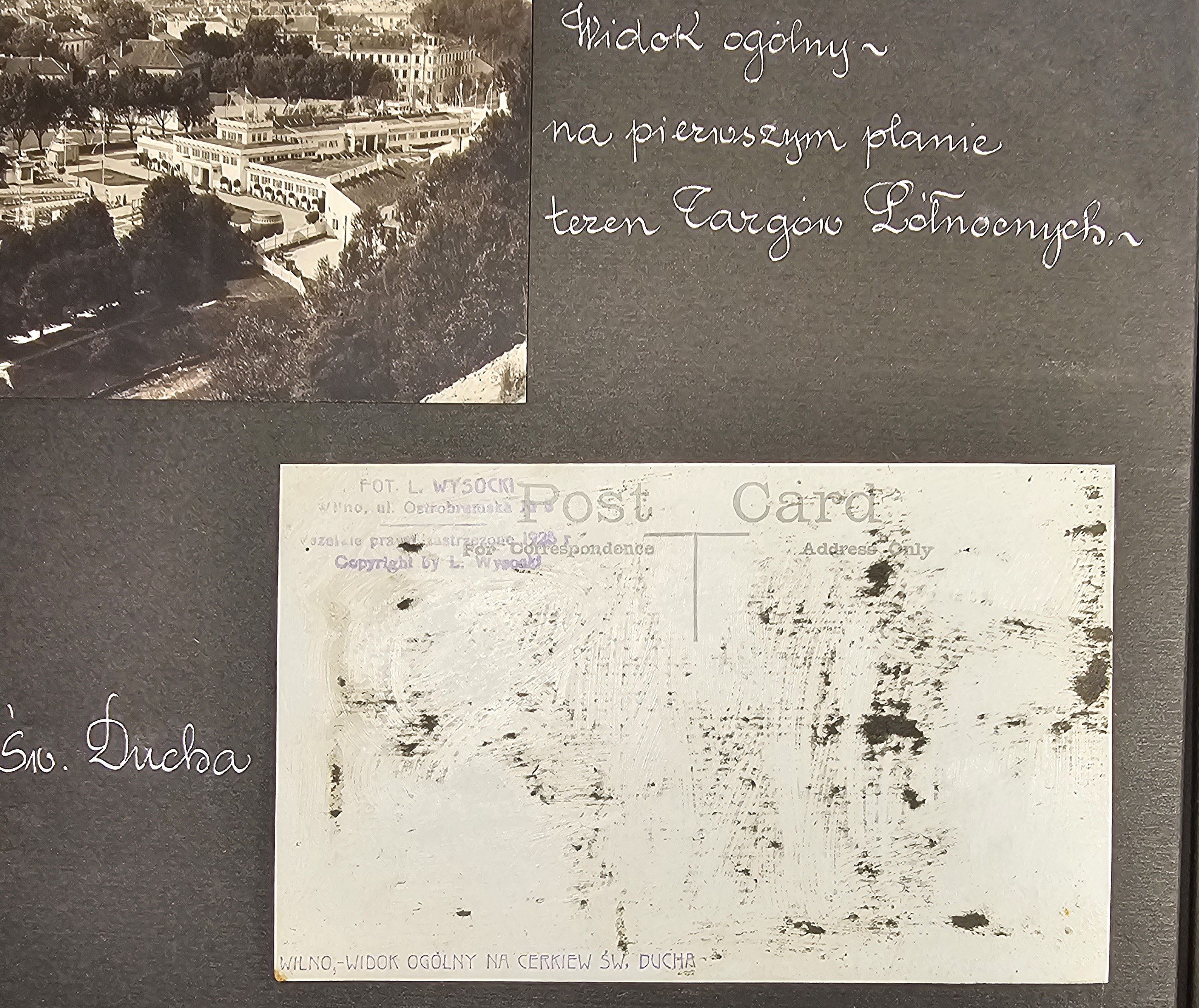 Album o wym. zewn.: 295 x 215 mm, karty o wym.: 260 x 205 mm. 12 kart, 38 o wym. pocztówkowym ok.: 140 x 90 mm oraz 14 fotografii o wym. ok.: 80 x 105 mm, razem 52 fotografie, niektóre sygnowane fot. L. Wysocki, Wilno. Wszystkie fotografie (pocztówki) sfotografowane. Stan dobry.