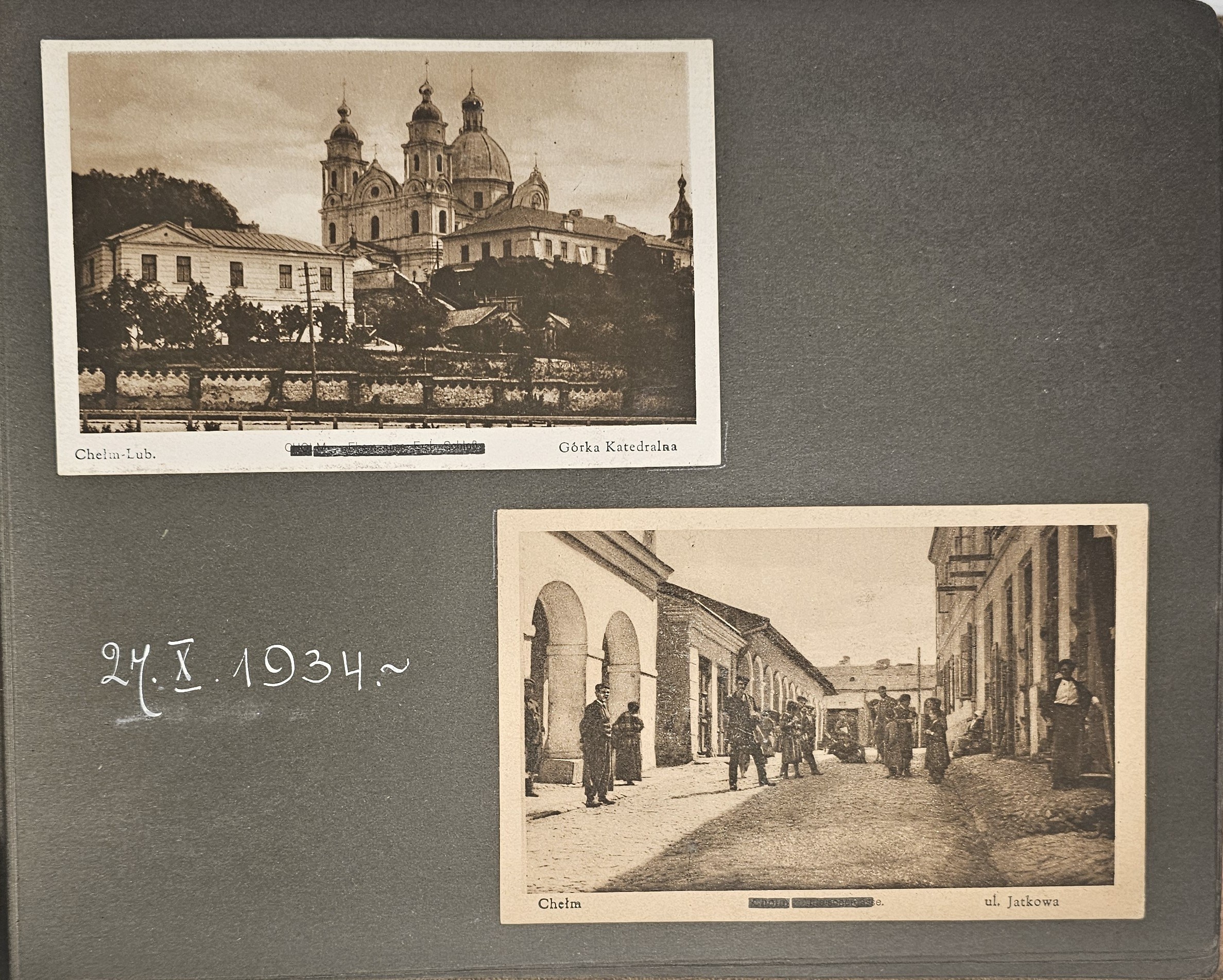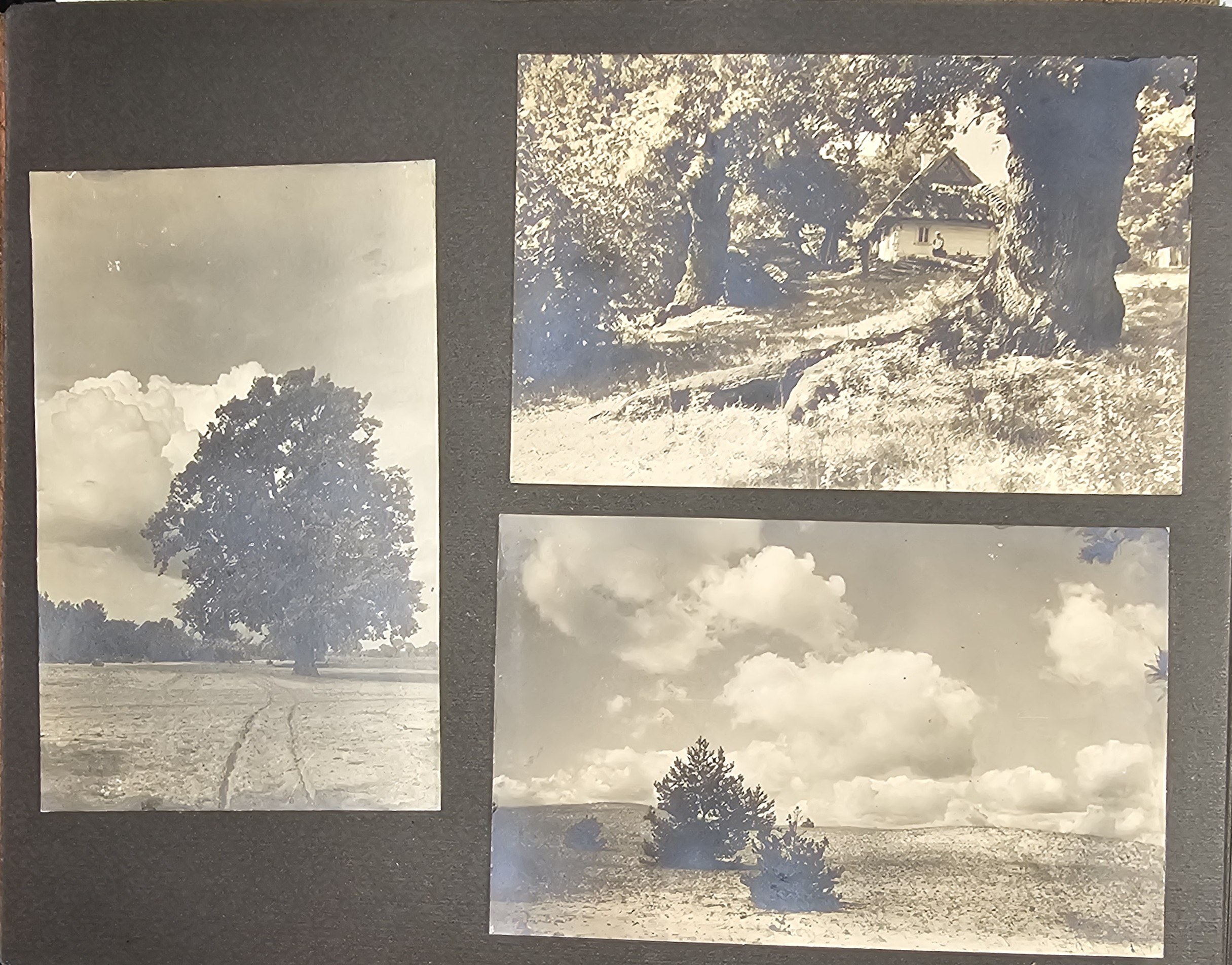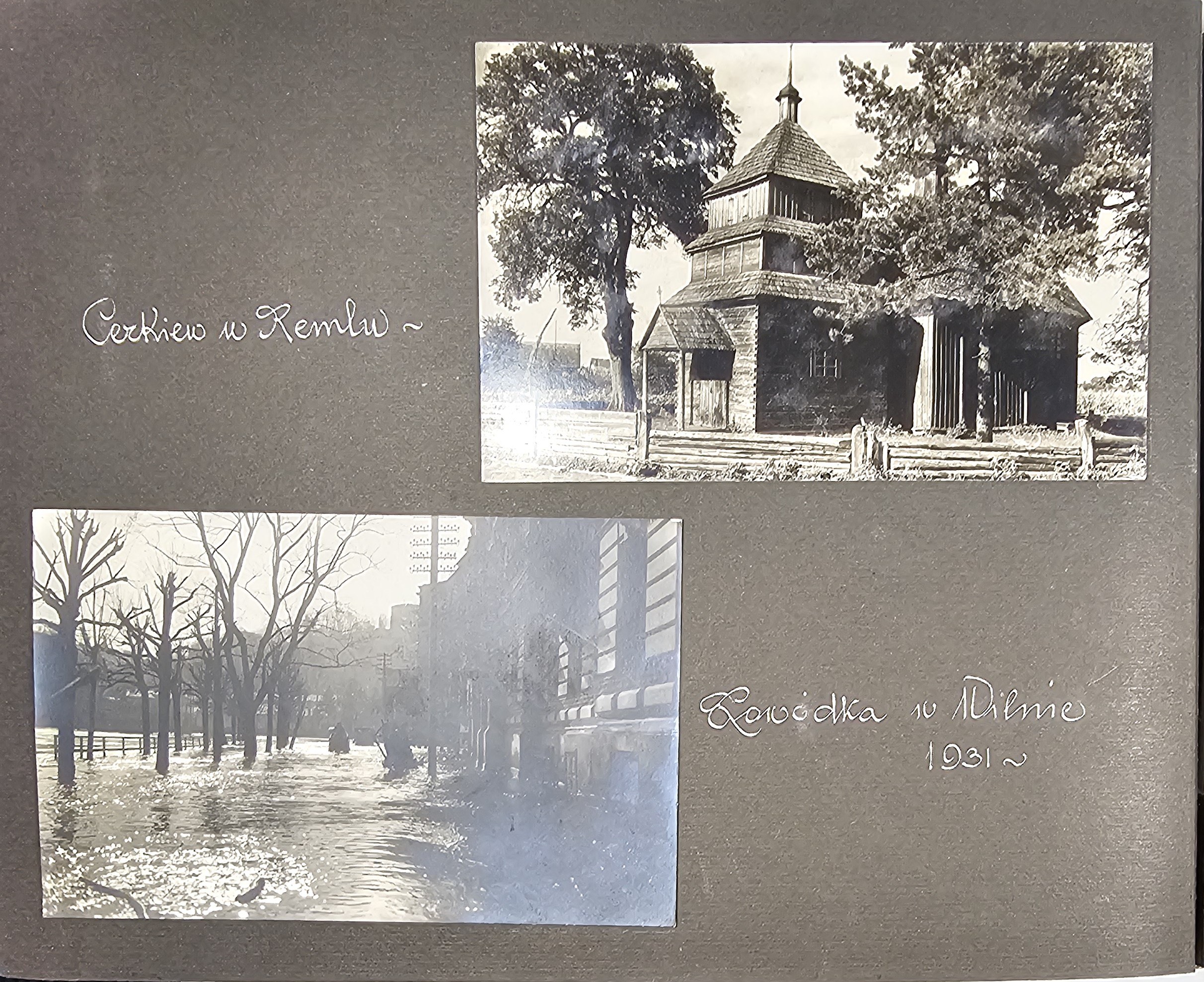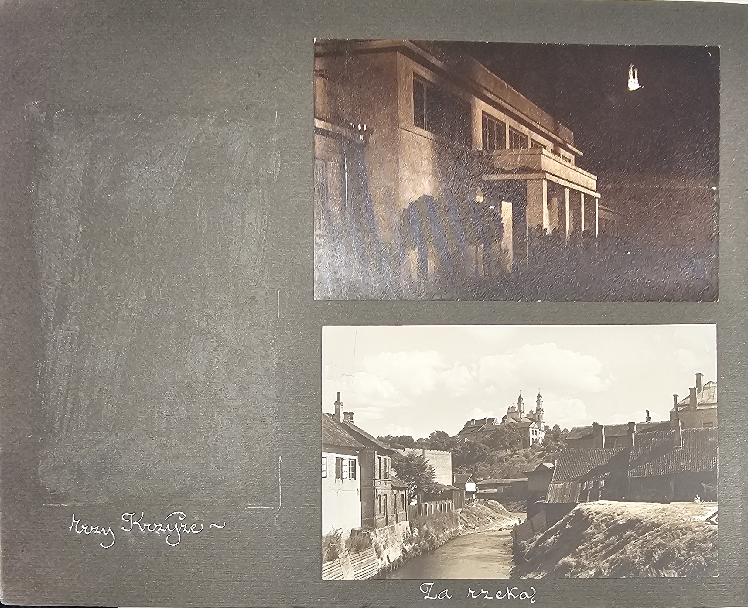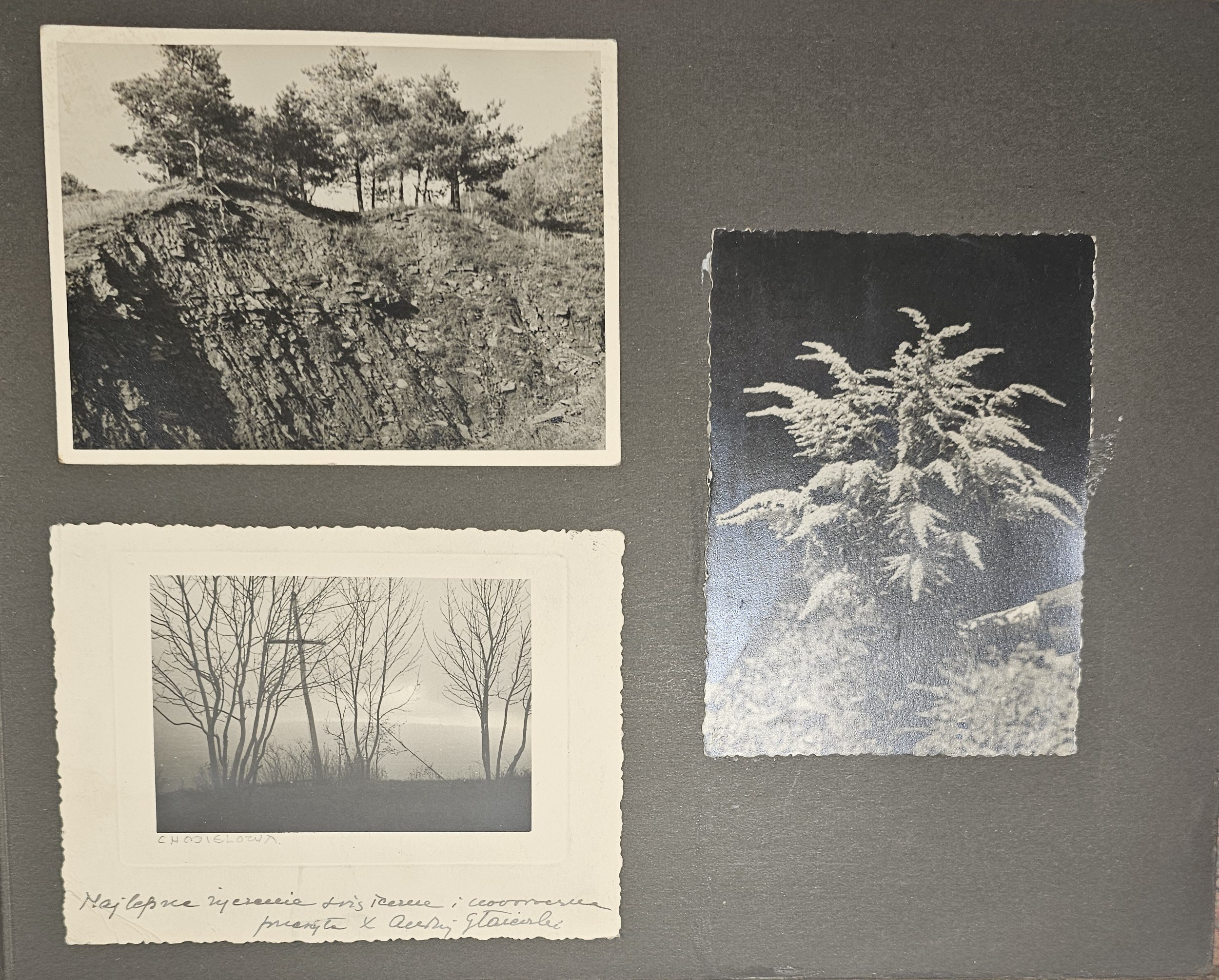 Album o wym. zewn.: 295 x 215 mm, karty o wym.: 260 x 205 mm. 12 kart, 38 o wym. pocztówkowym ok.: 140 x 90 mm oraz 14 fotografii o wym. ok.: 80 x 105 mm, razem 52 fotografie, niektóre sygnowane fot. L. Wysocki, Wilno. Wszystkie fotografie (pocztówki) sfotografowane. Stan dobry.