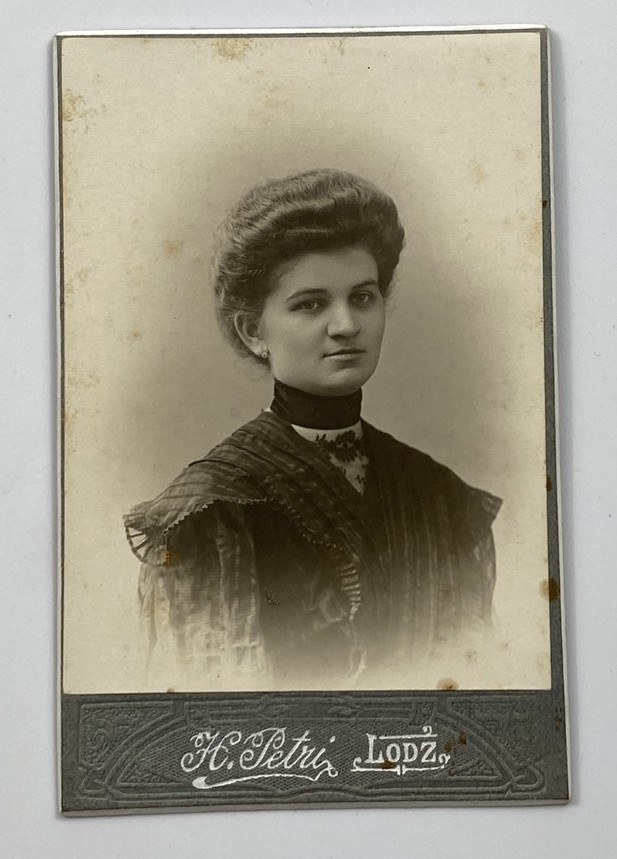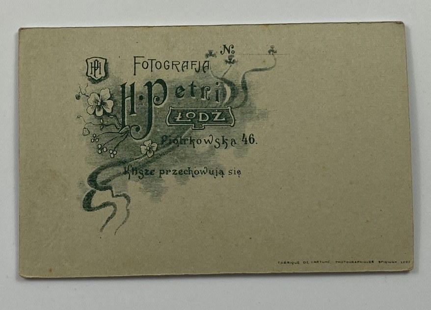 Fotografia portretowa na tekturce firmowej H. Petri Łódź, wymiary 6,5 x 10,5 cm, stan dobry.
