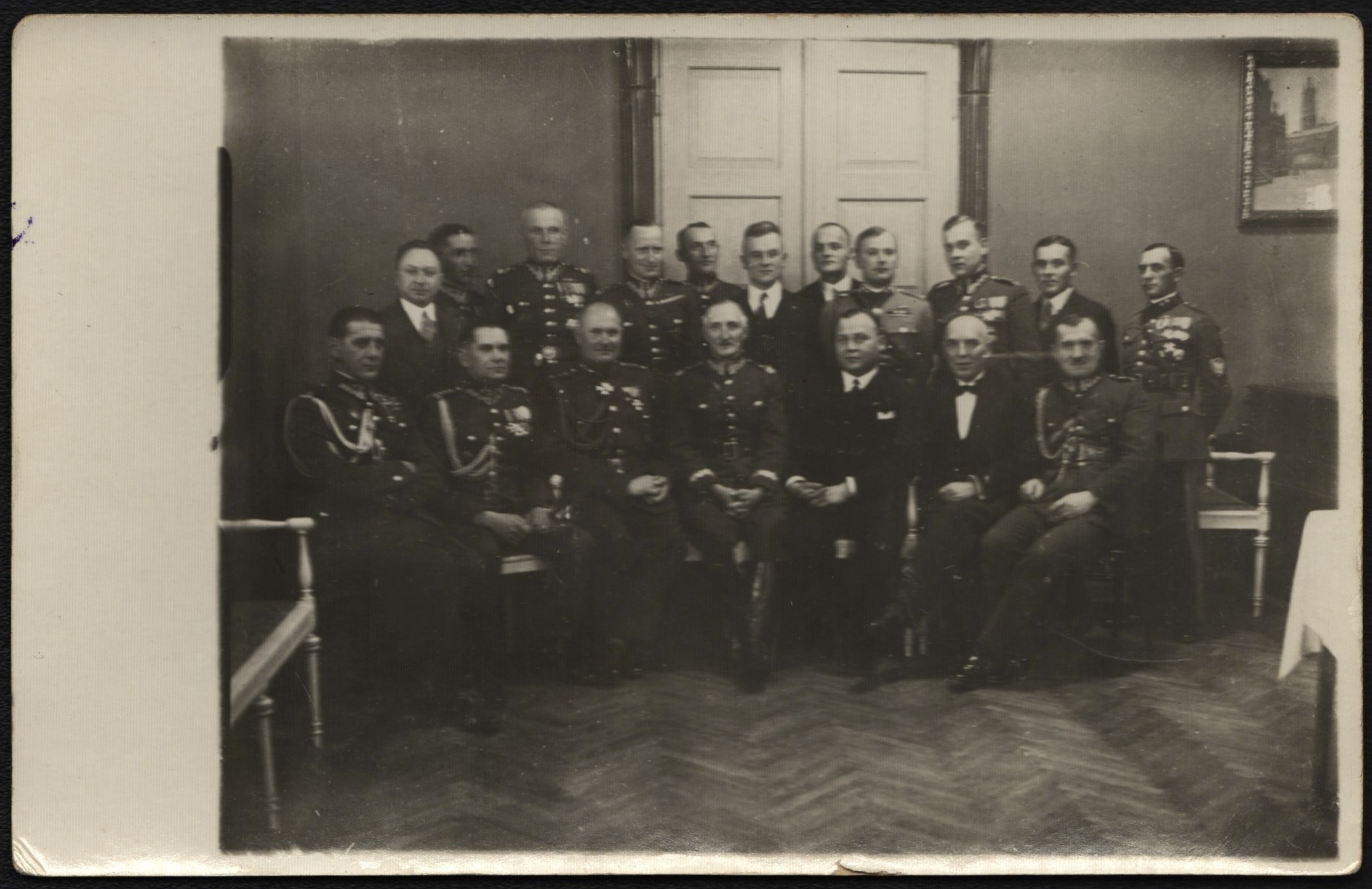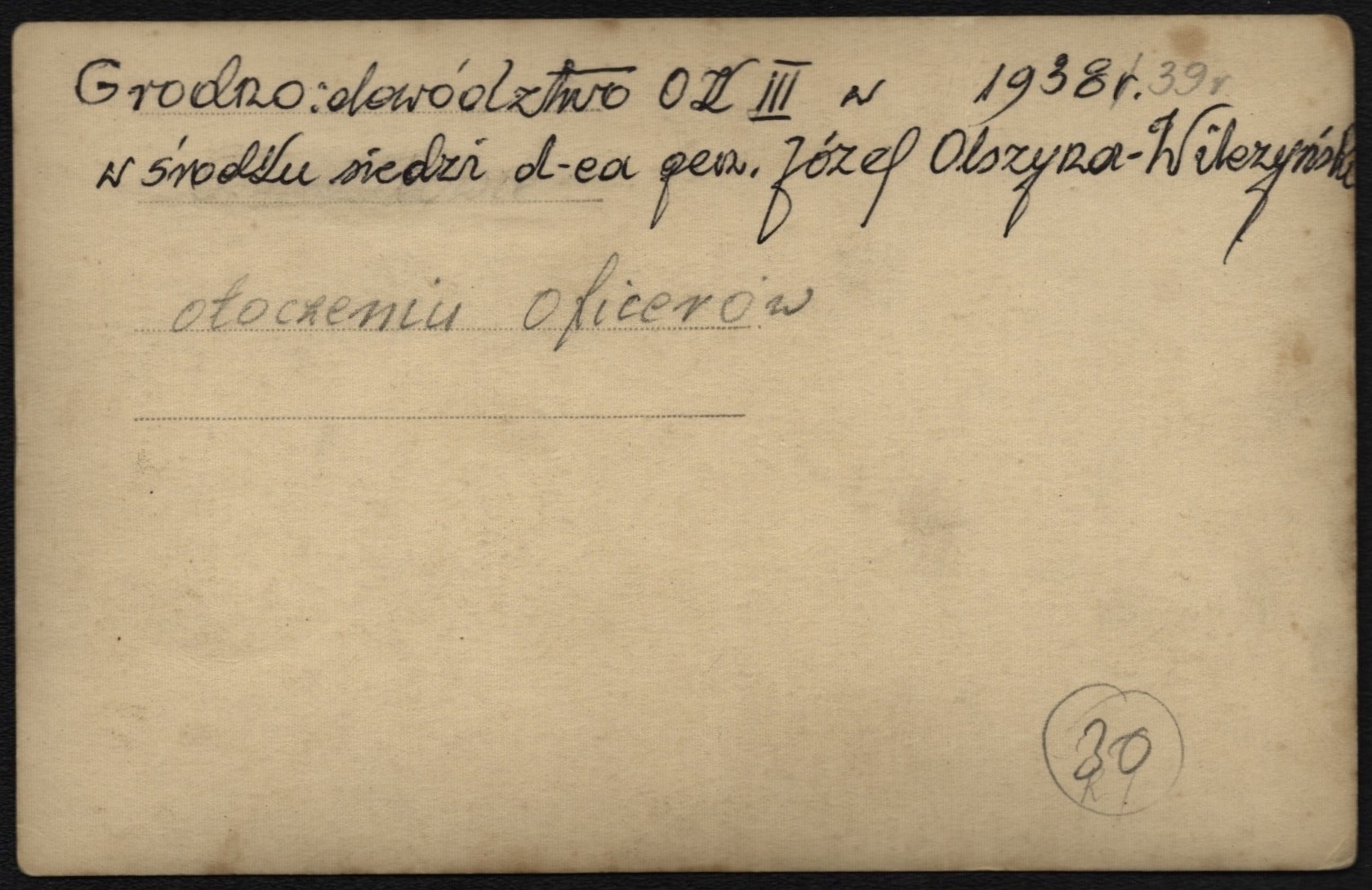 Okręg Korpusu nr III] Fotografia zbiorowa, widoczny d-ca Okręgu Korp. III Grodno, gen. Józef Olszyna-Wieleżyński w otoczeniu oficerów. Grodno 1938 r.