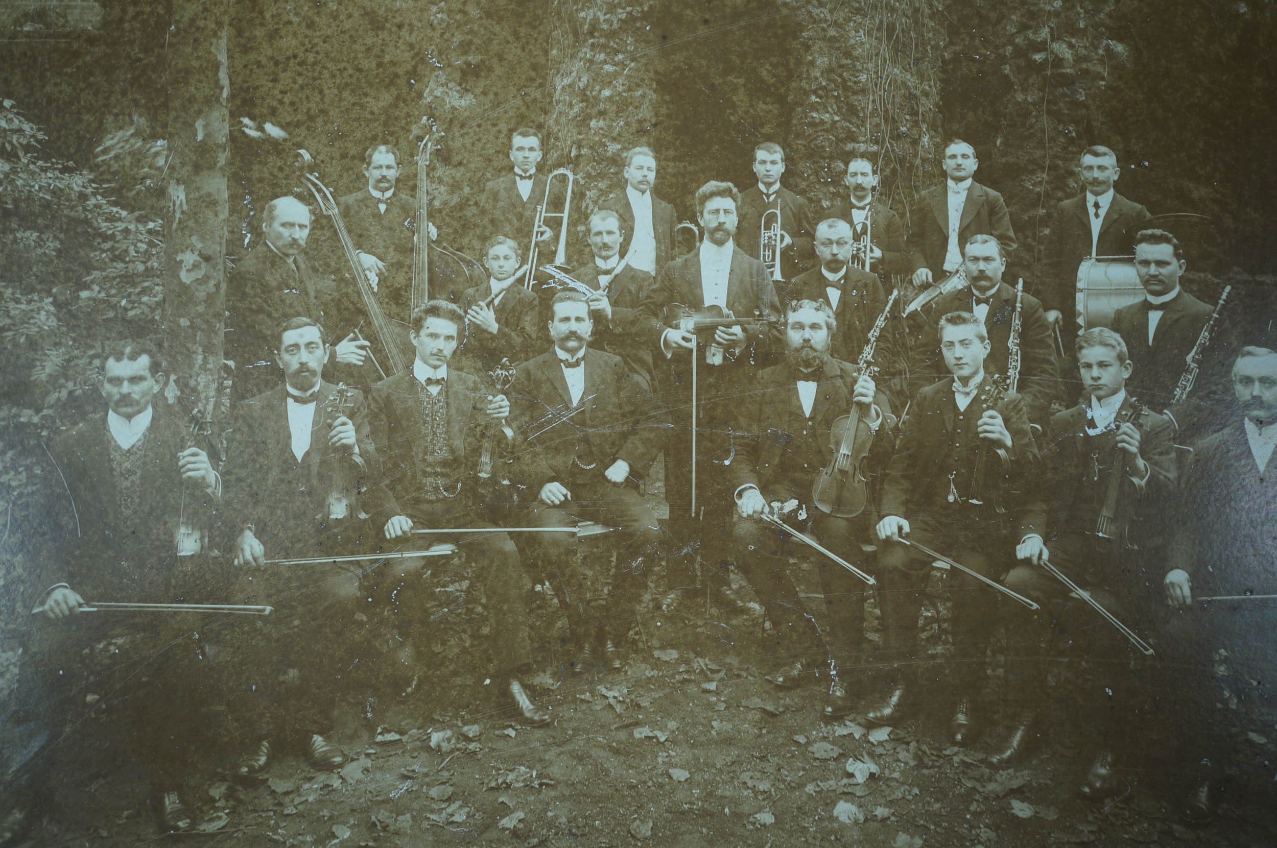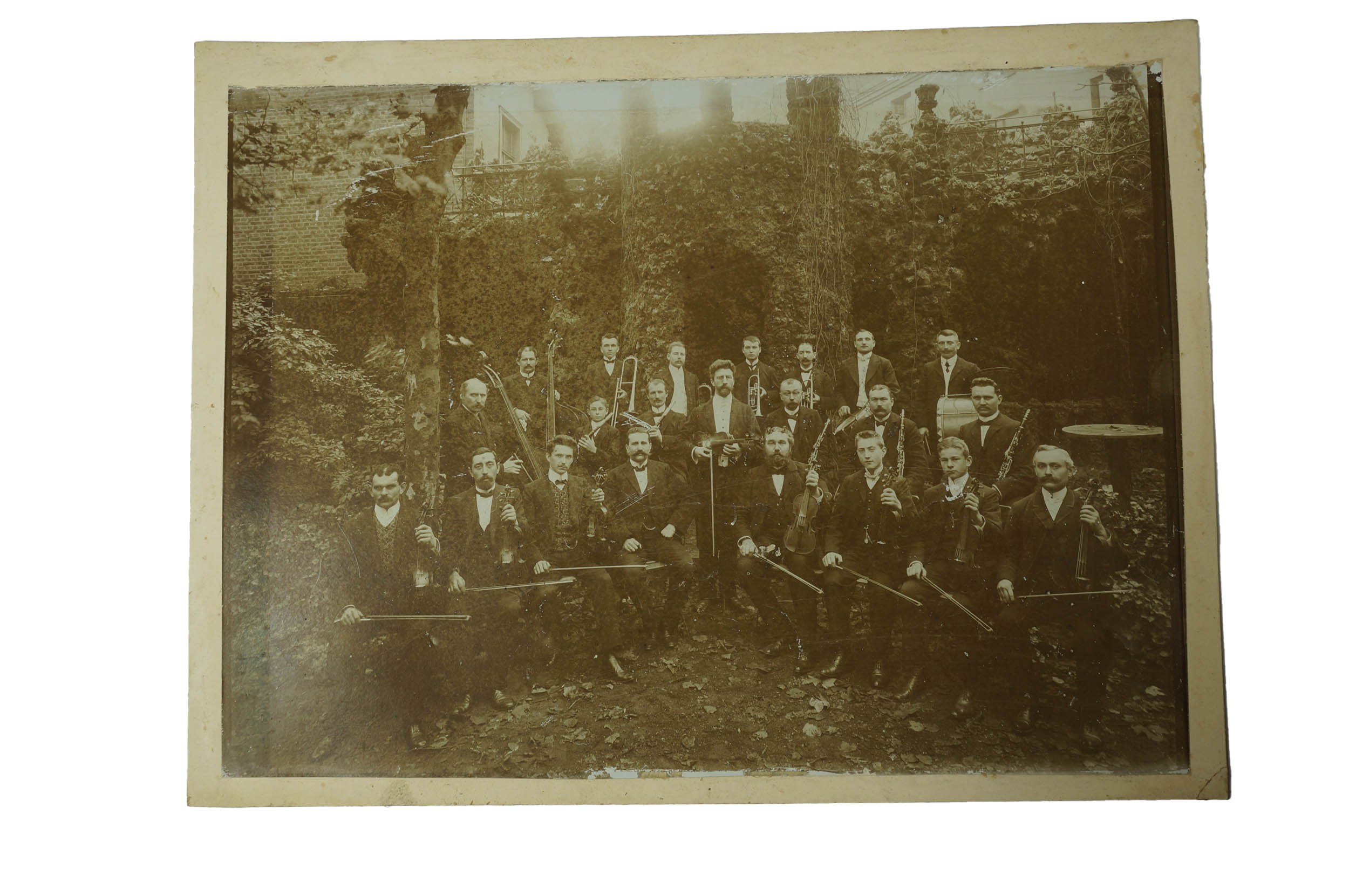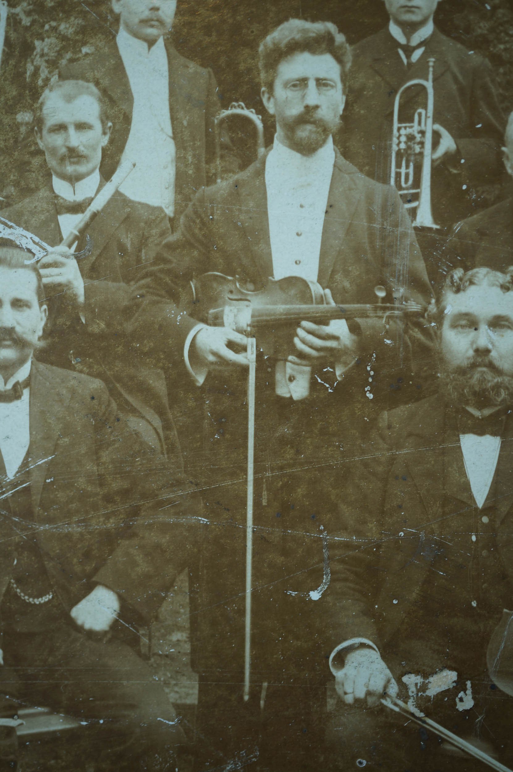 Duża fotografia przedstawiająca orkiestrę przy Warszawskim Towarzystwie Muzycznym [przed 1909r.] w Pałacu Szustera, na zdjęciu [stoi w środku] widoczny Mieczysław Karłowicz [1876-1909] wybitny polski kompozytor i dyrygent, f. 43x32,5cm [karton], 40x29,5cm [fotografia]