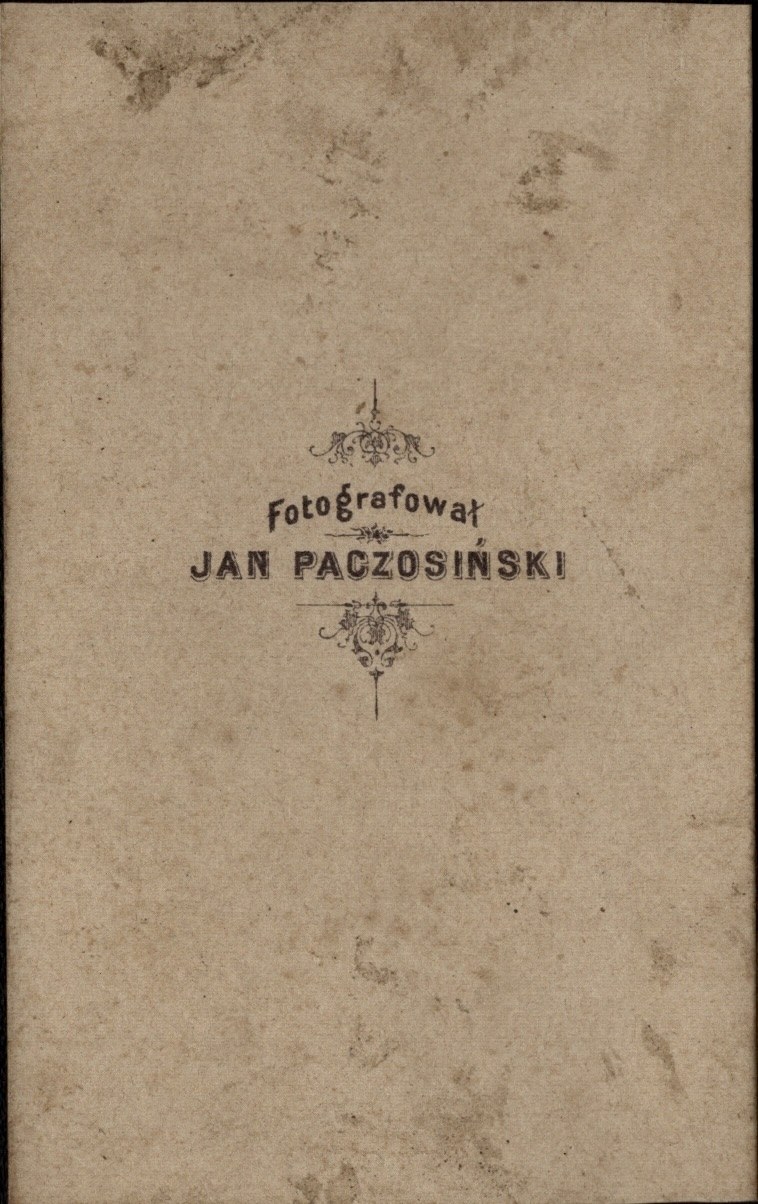 Fotografia albuminowa w form. CDV o wym. 10,3 x 6,3 cm. Na rewersie drukowany napis zakładu: "Fotografował Jan Paczosiński" (w kolorze brązowym). Zabrudzenia awersu i rewersu, ślady podawnym podklejeniu. Nadwątlenia kartoniku. Fotografia po dezynfekcji w komorze Biblioteki Jagiellońskiej.