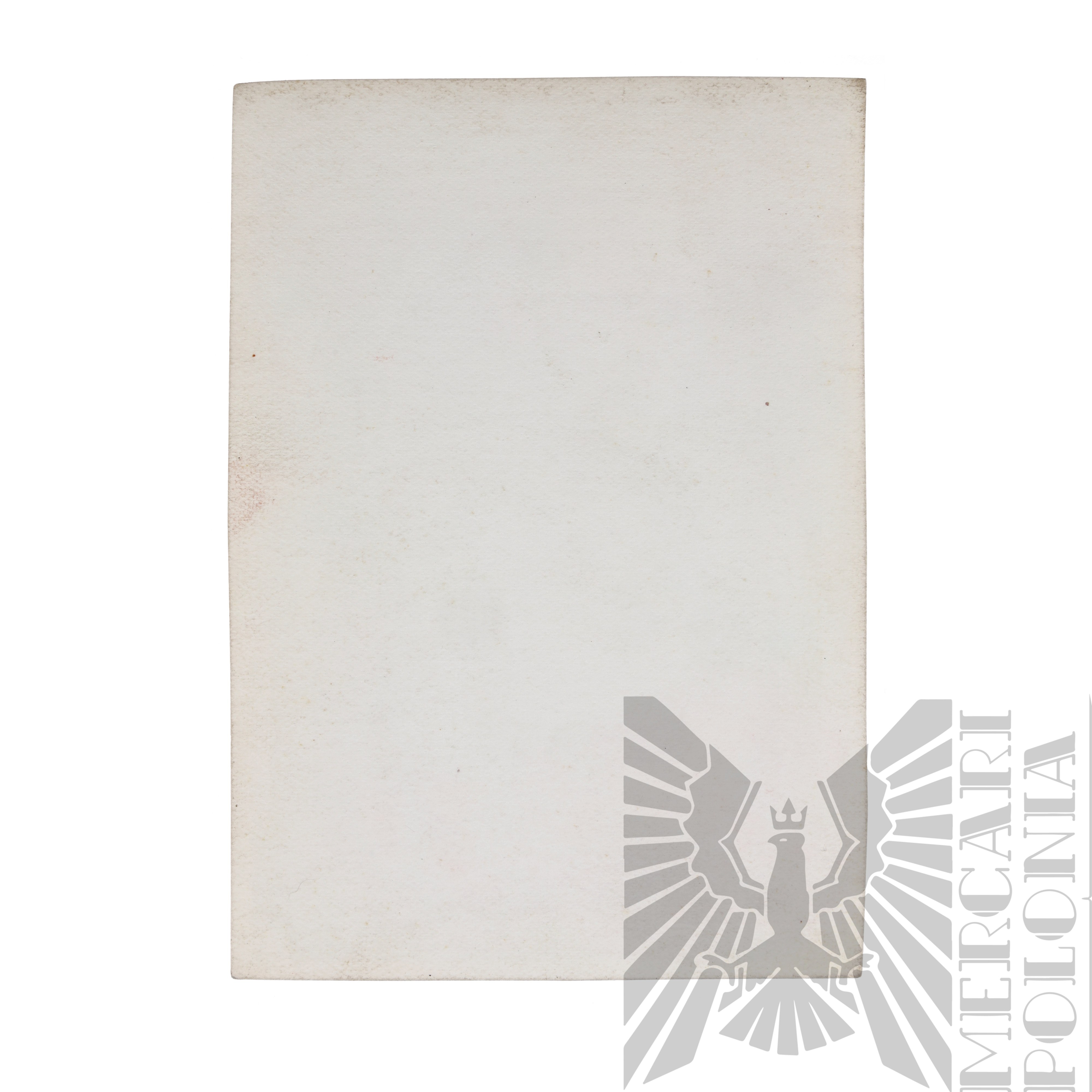 Fotografia portretowa ukazująca plutonowego 1 Brygady Grenadierów w mundurze Battledress. Na kieszeni doskonale widoczna odznaka pamiątkowa 2 Dywizji Strzelców Pieszych. Na rękawie kurtki mundurowej naszywka 1 Brygady Grenadierów. Na piersi widoczne baretki Krzyża Walecznych i Krzyża Zasługi.