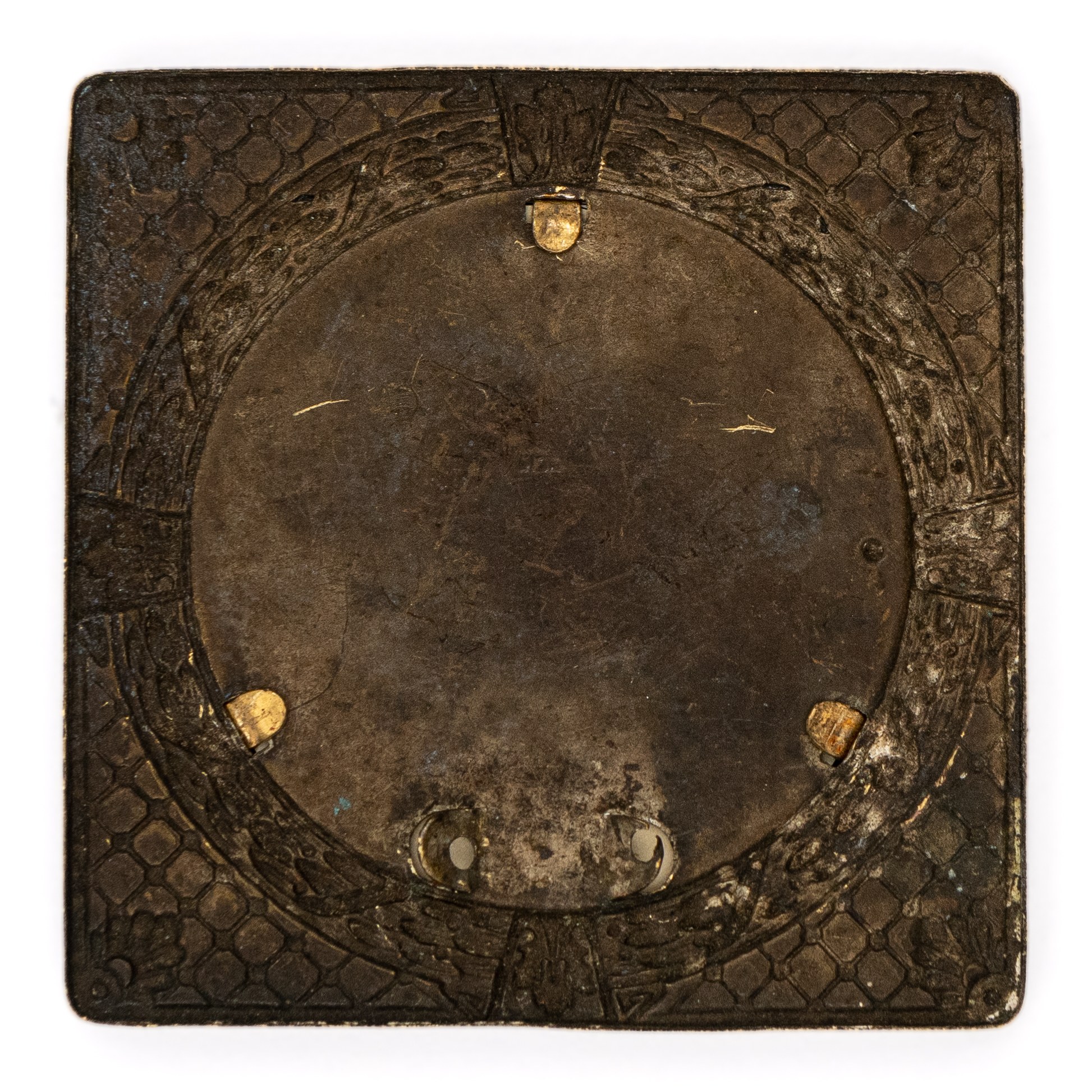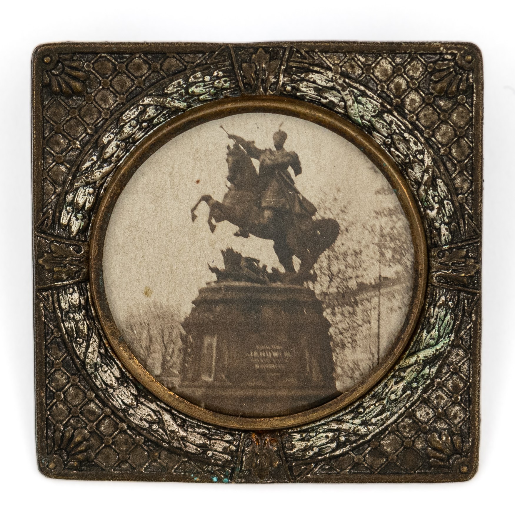Ramka ze zdjęciem pomnika Jana III Sobieskiego we Lwowie. 54 x 54mm, zdjęcie średnica 32mm. Wykonana z mosiądzu. Rewers z kontrą. Ciekawa pamiątka. Stan bardzo dobry.