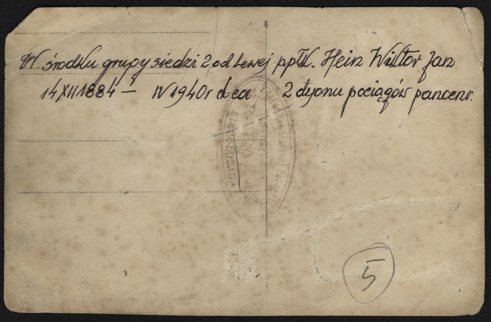 Fotografia opisana na rewersie: "W środku grupy siedzi 2 od lwej ppłk. Hein Wiktor Jan (14. XII. 1884-IV. 1940 d-ca 2 dyonu pociągów pancernych."