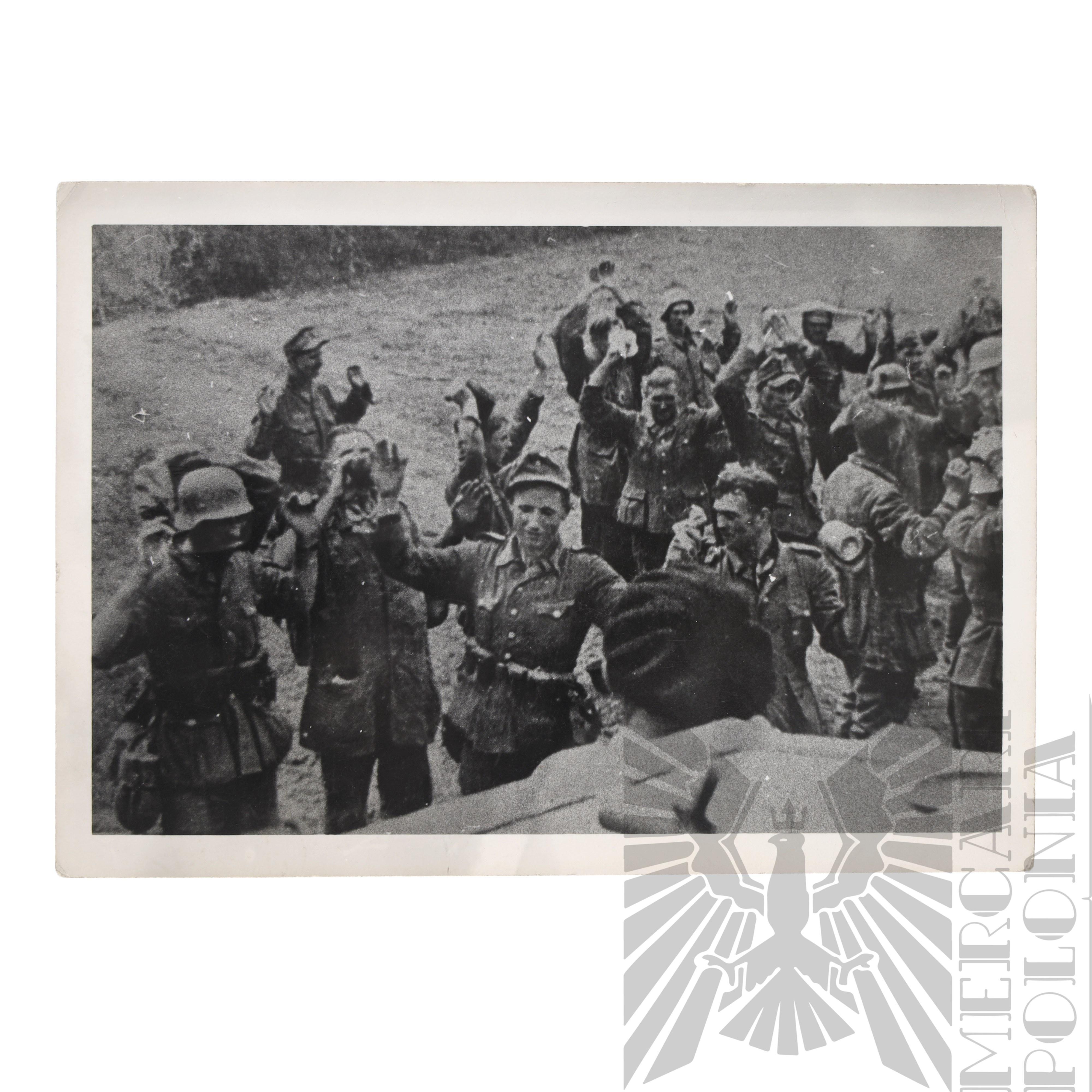 Fotografia pierwszych jeńców niemieckich wziętych do niewoli przez polskich żołnierzy podczas walk w Normandii.