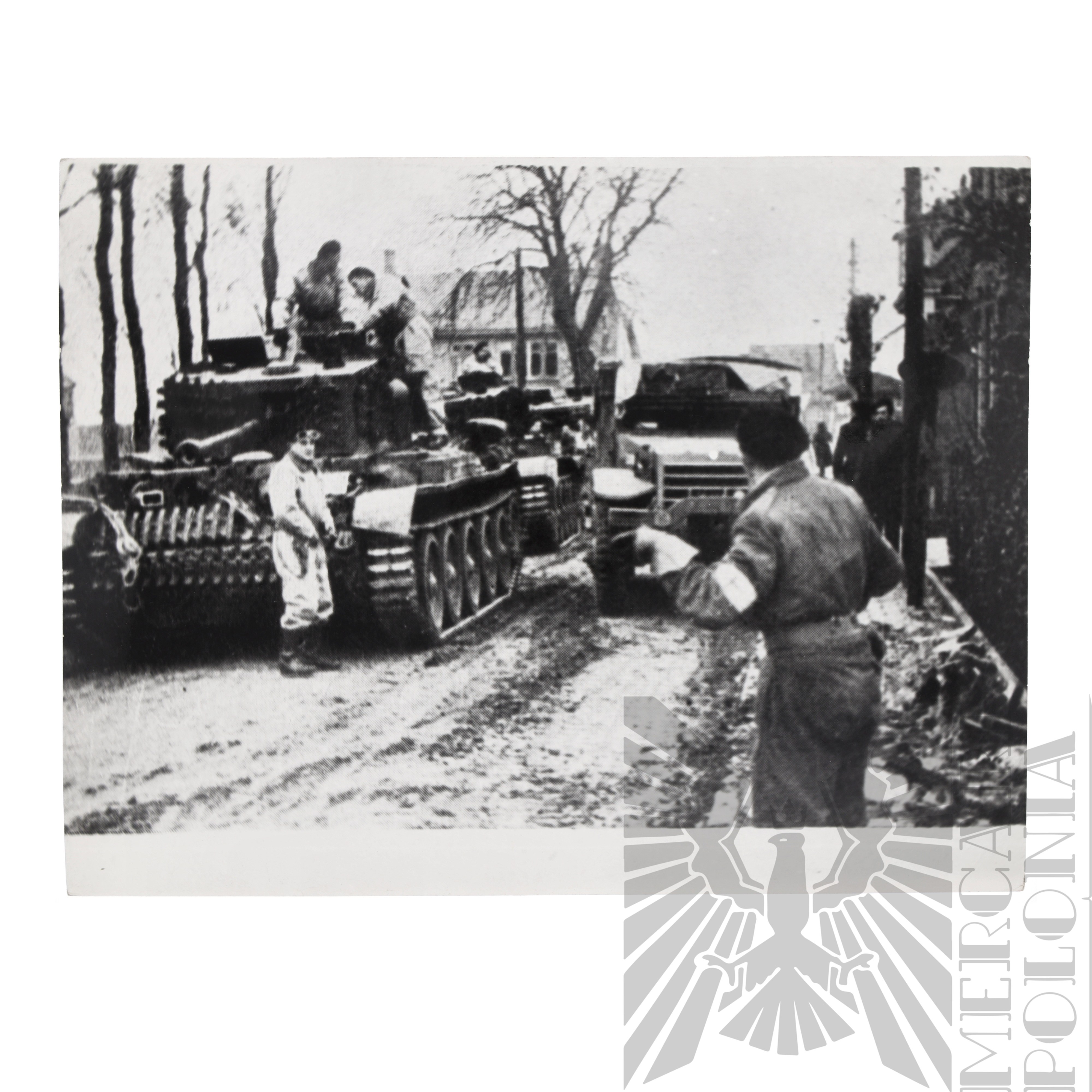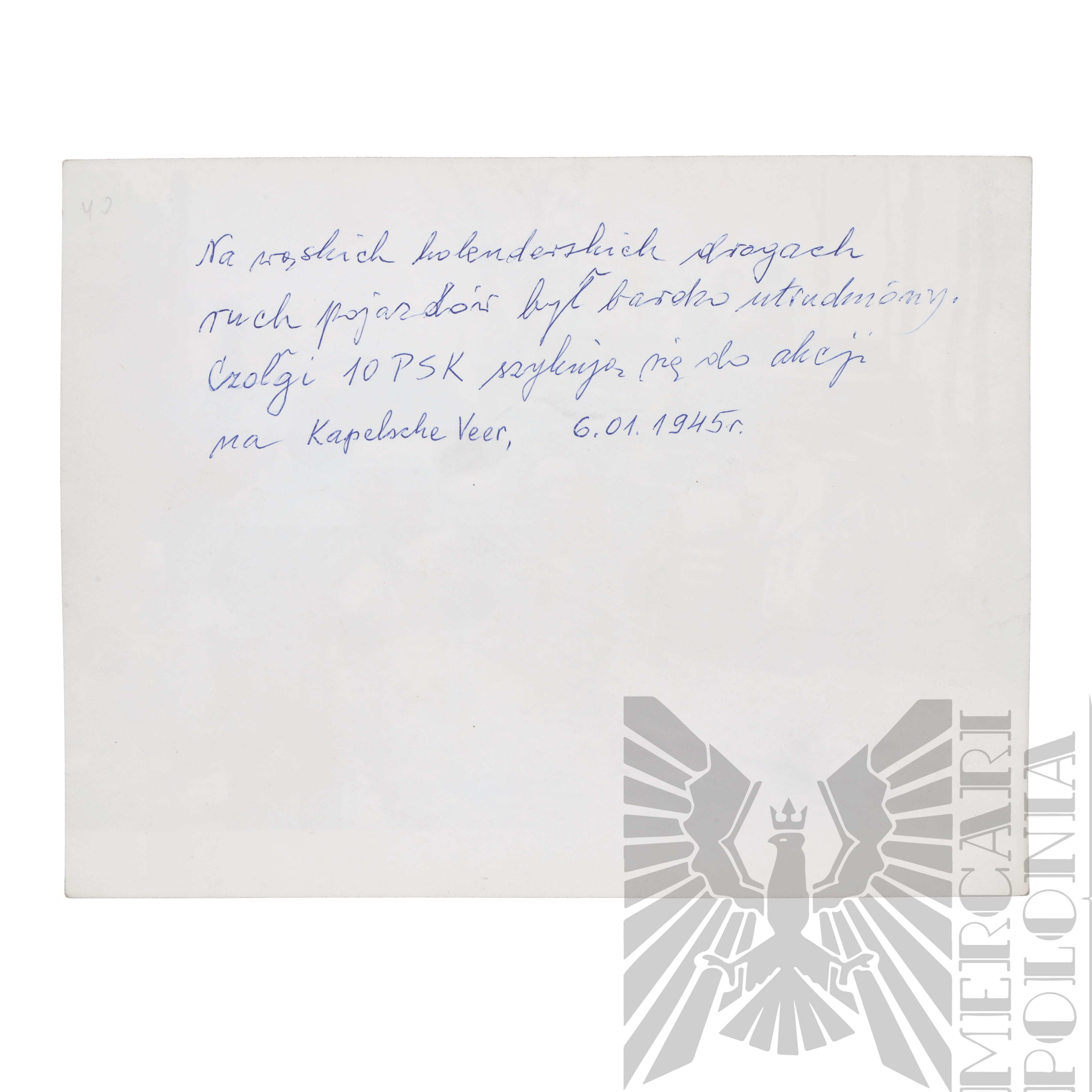 Fotografia ukazująca pojazdy 10 Pułku Strzelców Konnych podczas przegrupowania do akcji w Holandii, fotografia opatrzona podpisem: “Na wszystkich holenderskich drogach ruch pojazdów był bardzo utrudniony. Czołgi 10 PSK szykują się do akcji na Kapelsche Veer, 6.01.1945 r.”
