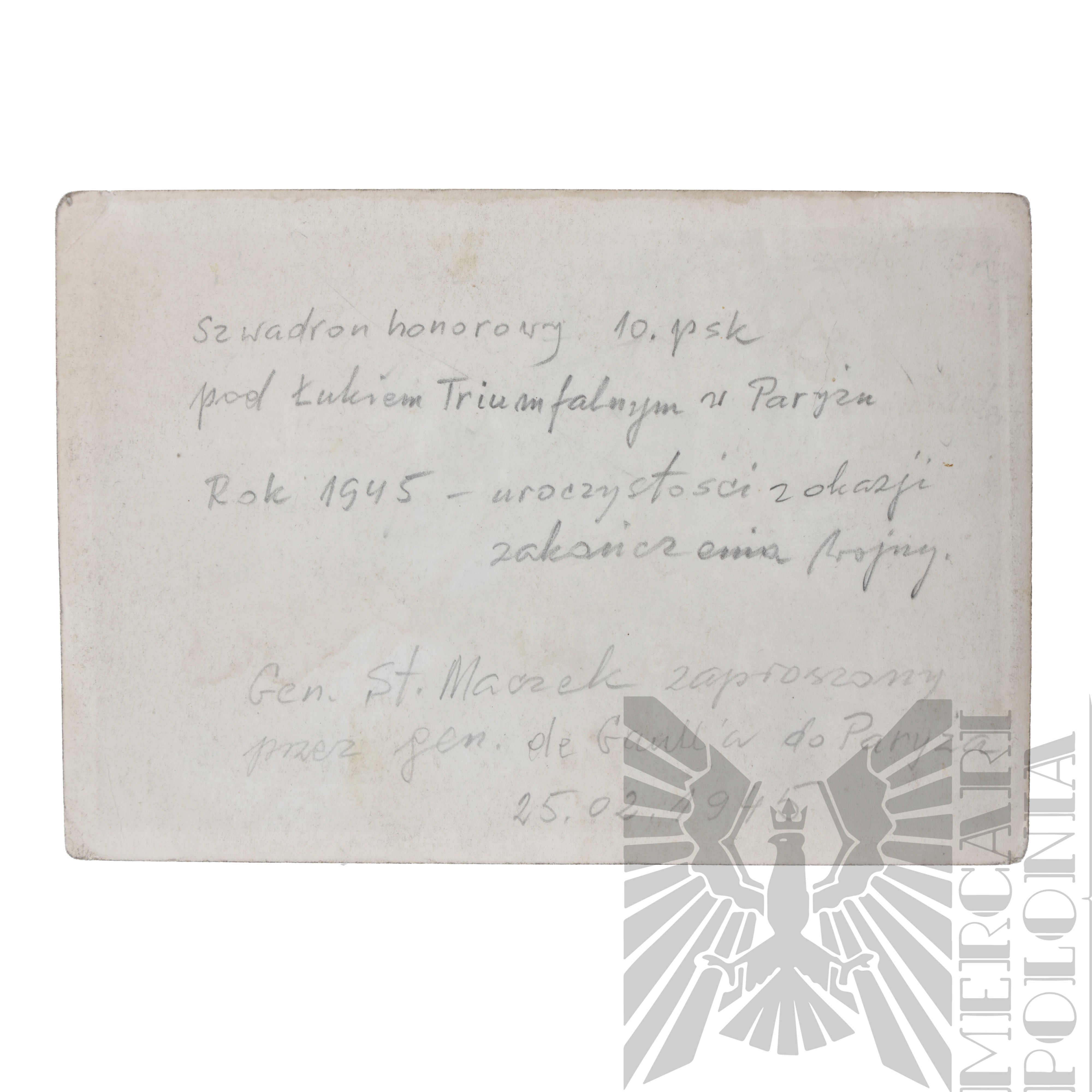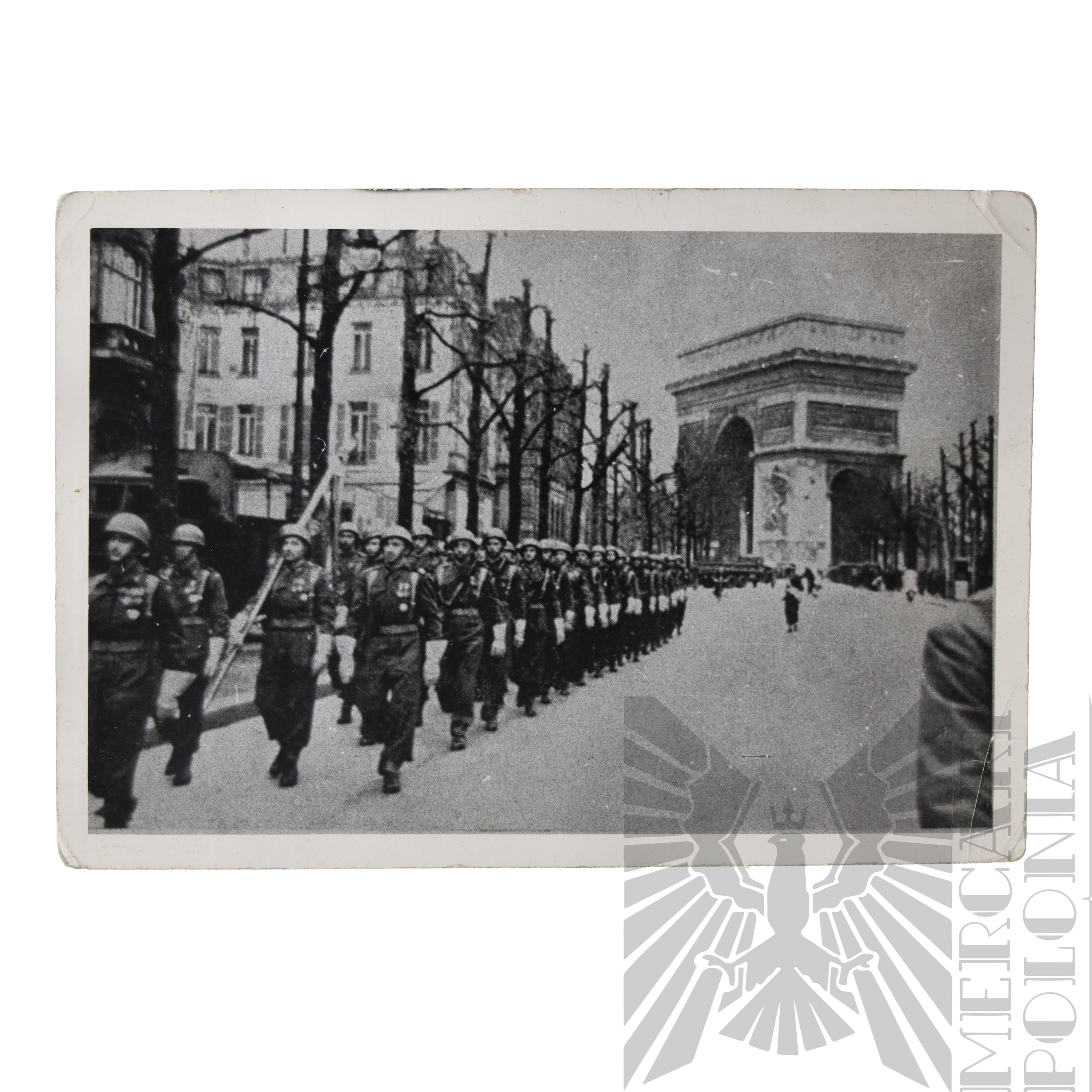 Fotografia żołnierzy 10PSK podczas defilady w Paryżu w 1945 roku, w tle widoczny Łuk Tryumfalny.