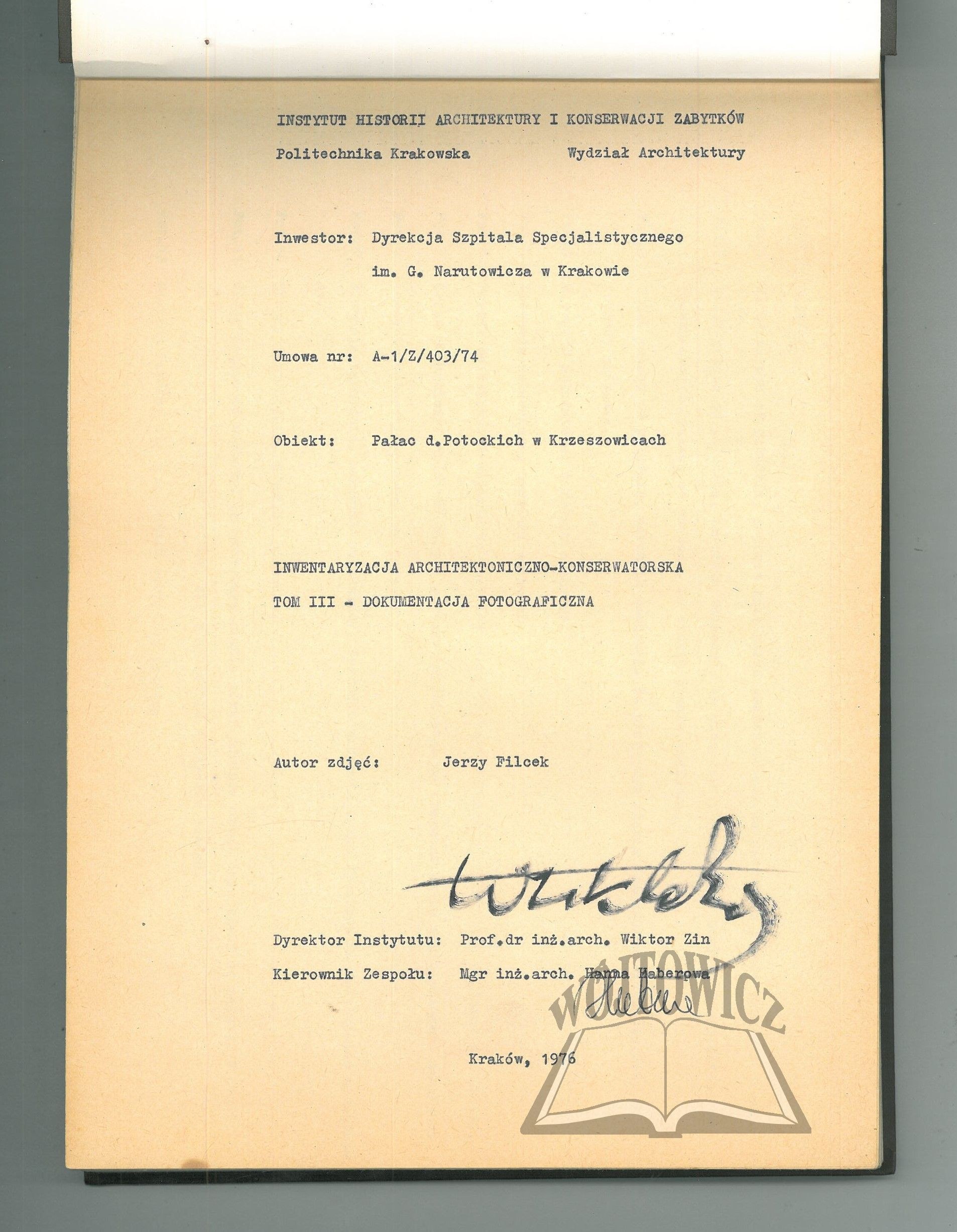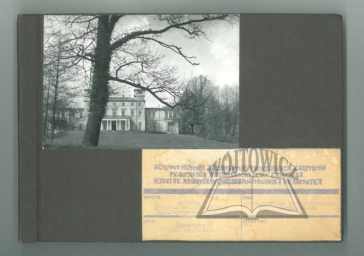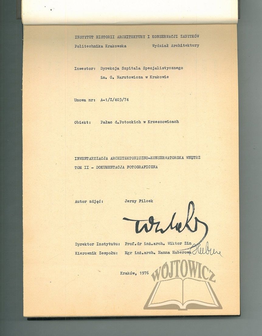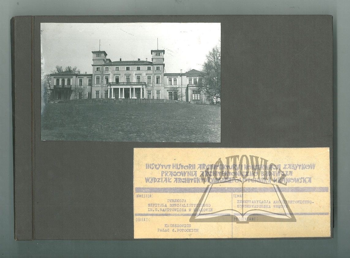 Tom 2 i 3: Dokumentacja fotograficzna. Instytut Historii Architektury i Konserwacji Zabytków. Politechnika Krakowska. Wydział Architektury. Inwestor: Dyrekcja Szpitala Specjalistycznego im. G. Narutowicza w Krakowie. Obiekt: Pałac d. Potockich w Krzeszowicach. Autor zdjęć: Jerzy Filcek. Dyrektor Instytutu: prof. dr inż. arch. Wiktor Zin. Kierownik Zespołu: Mgr inż. arch. Hanna Haberowa. Kraków 1976. 4 podł., [1], 4, 38 zdjęć naklejonych na twardy karton; [1], 3, 32 zdjęcia naklejone na twardy karton, opr. pł. oryg.