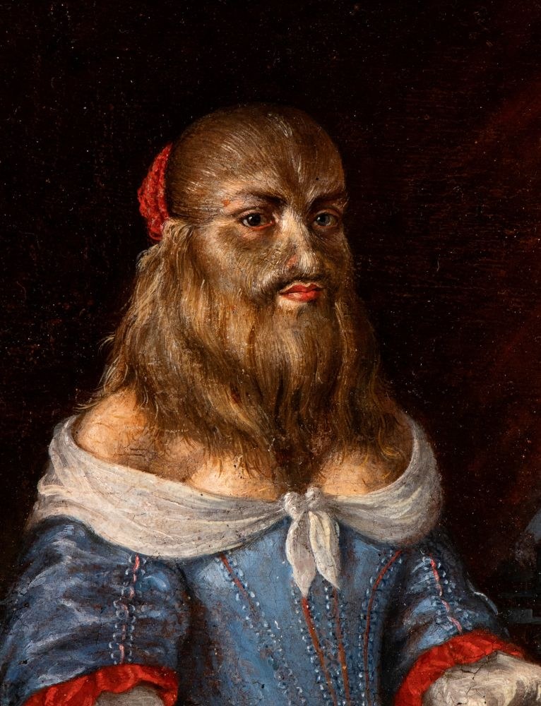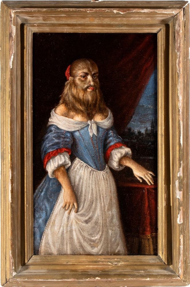 The painting depicts a portrait of Barbara Urslerin, also known as Barbara van Beck, who was born in Augsburg in 1629. Affected by hypertrichosis, she was exhibited from childhood in travelling shows across Europe. Despite this, she received an education that enabled her to learn several languages and to play the harpsichord. An educated woman and musician, she married Johan Michael van Beck, who also became her manager. Celebrated throughout Europe, she was portrayed in various paintings and engravings, including a 17th-century work held at the Wellcome Collection in London, which depicts her with dignity and grace, highlighting her status as a respected and admired woman despite her physical condition. The last recorded account of her life dates to 1668 in London.