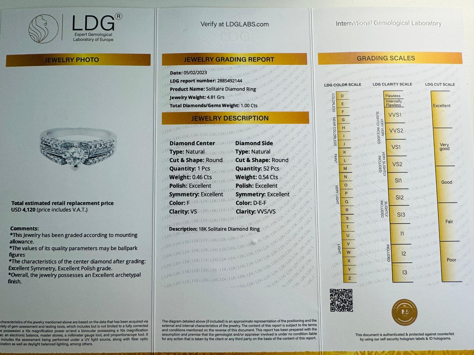 18K WHITE GOLD RING - 4.81 GR WITH DIAMONDS: CENTRAL BRILLIANT PEITRA COLOR F VS 1-0.46 CT + SIDE BRILLIANTS D-F VVS-VS 0.54 CT SIZE: 6.5 LD GR CERTIFICATE - DH-R768 - AUCTION COMMISSION 25%