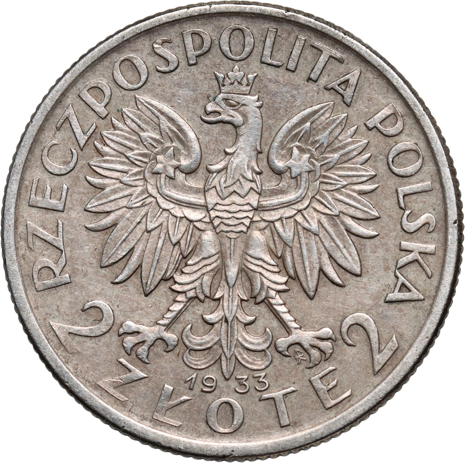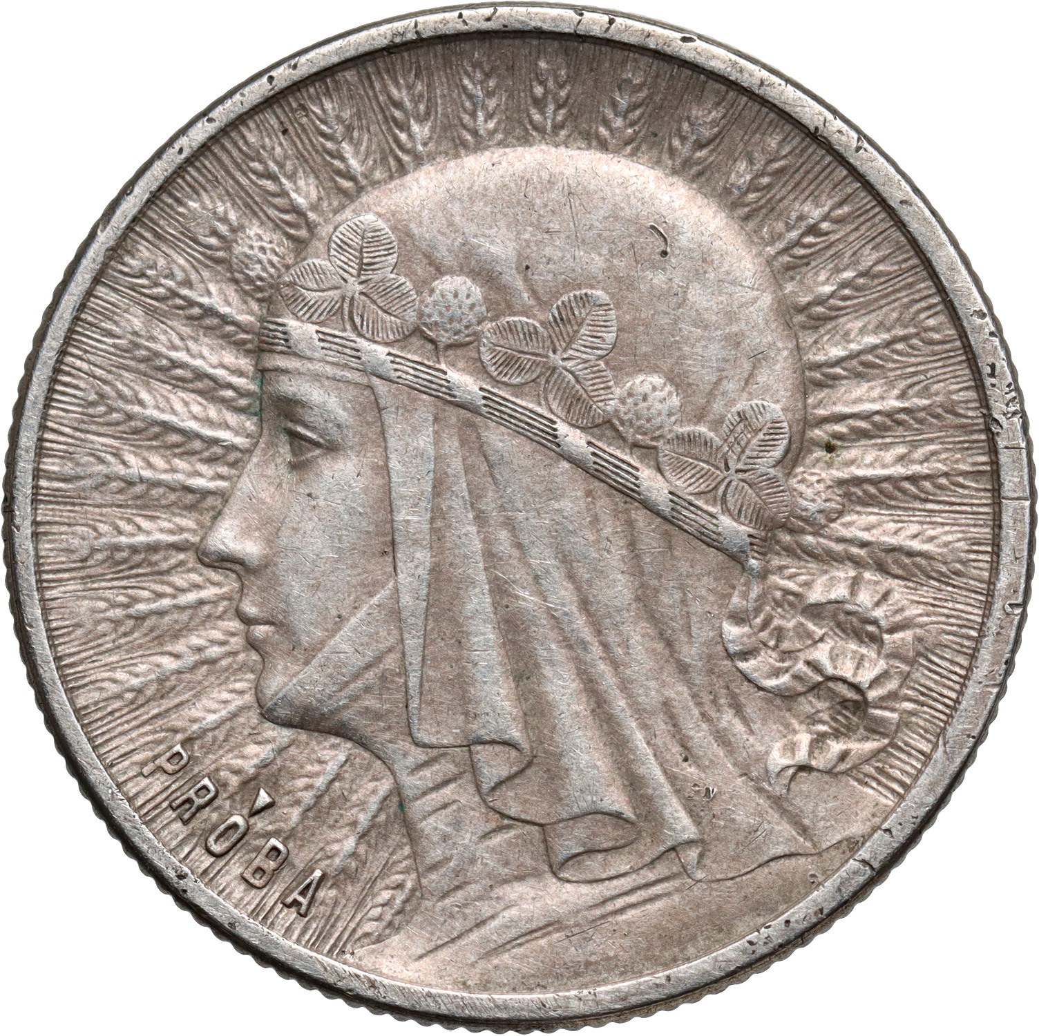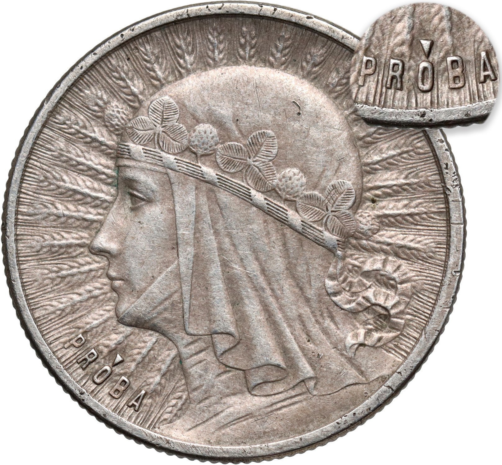 Srebro, waga 4,42 g, nakład 110 sztuk. Na rewersie wypukły napis PRÓBA. Rzadka moneta próbna z okresu II RP.