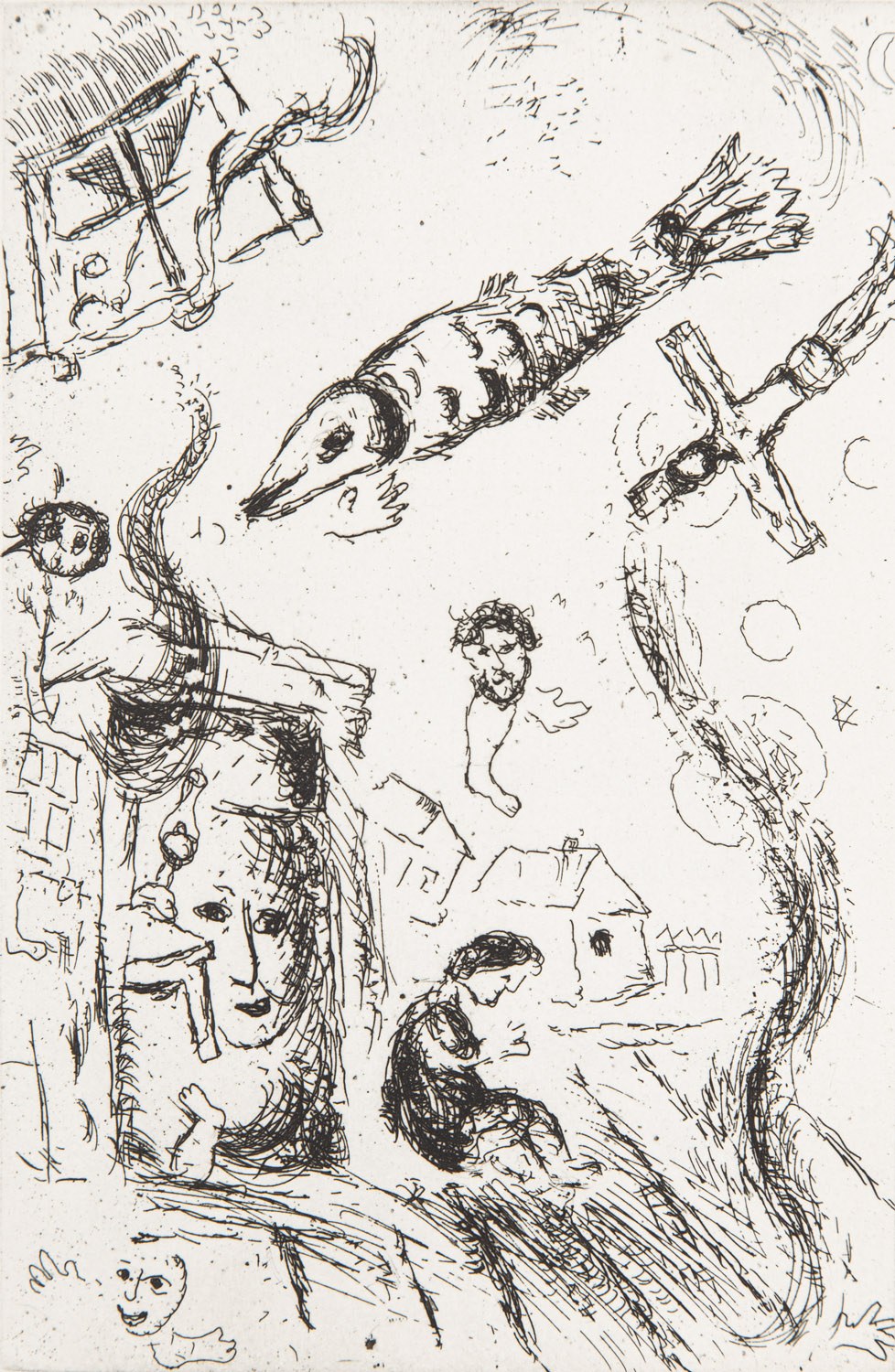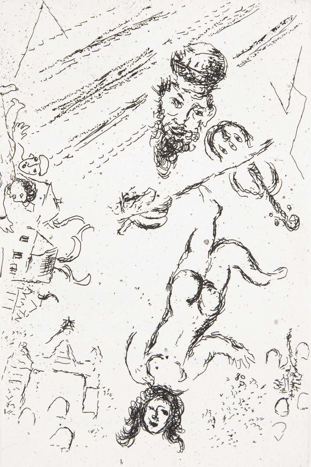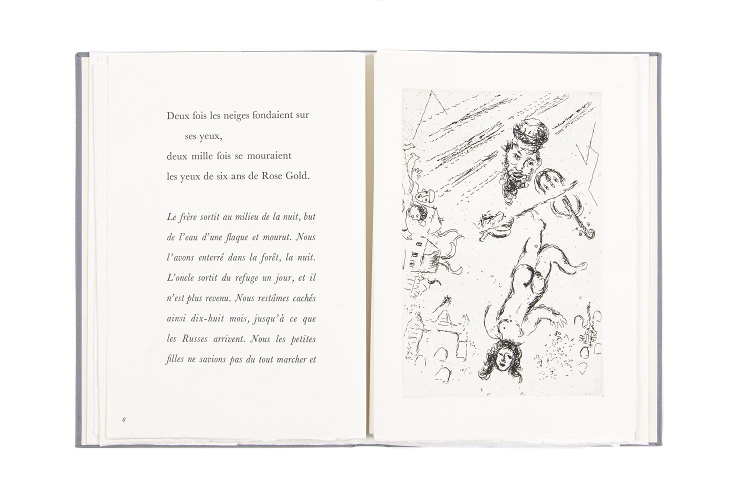 Maeght Éditeur, Paryż 1969, wydanie numerowane 51/150 (całkowite wydanie 190 egz.) na Vélin de Rives. Z 5 akwafortami autorstwa Marca Chagalla. 31 stron w luźnych podwójnych kartkach. Odręczny podpis artysty i autora. Papierowa okładka, szara lniana teczka z wytłoczonym złotym tytułem na grzbiecie i szara lniana wkładka