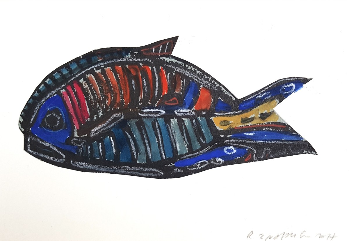 technika mieszana (karton, wycinanka, collage, tusz, kredka akwarelowa, pastel), papier, 15 x 21 cm, sygn. p.d.: R. Znajomski 2017