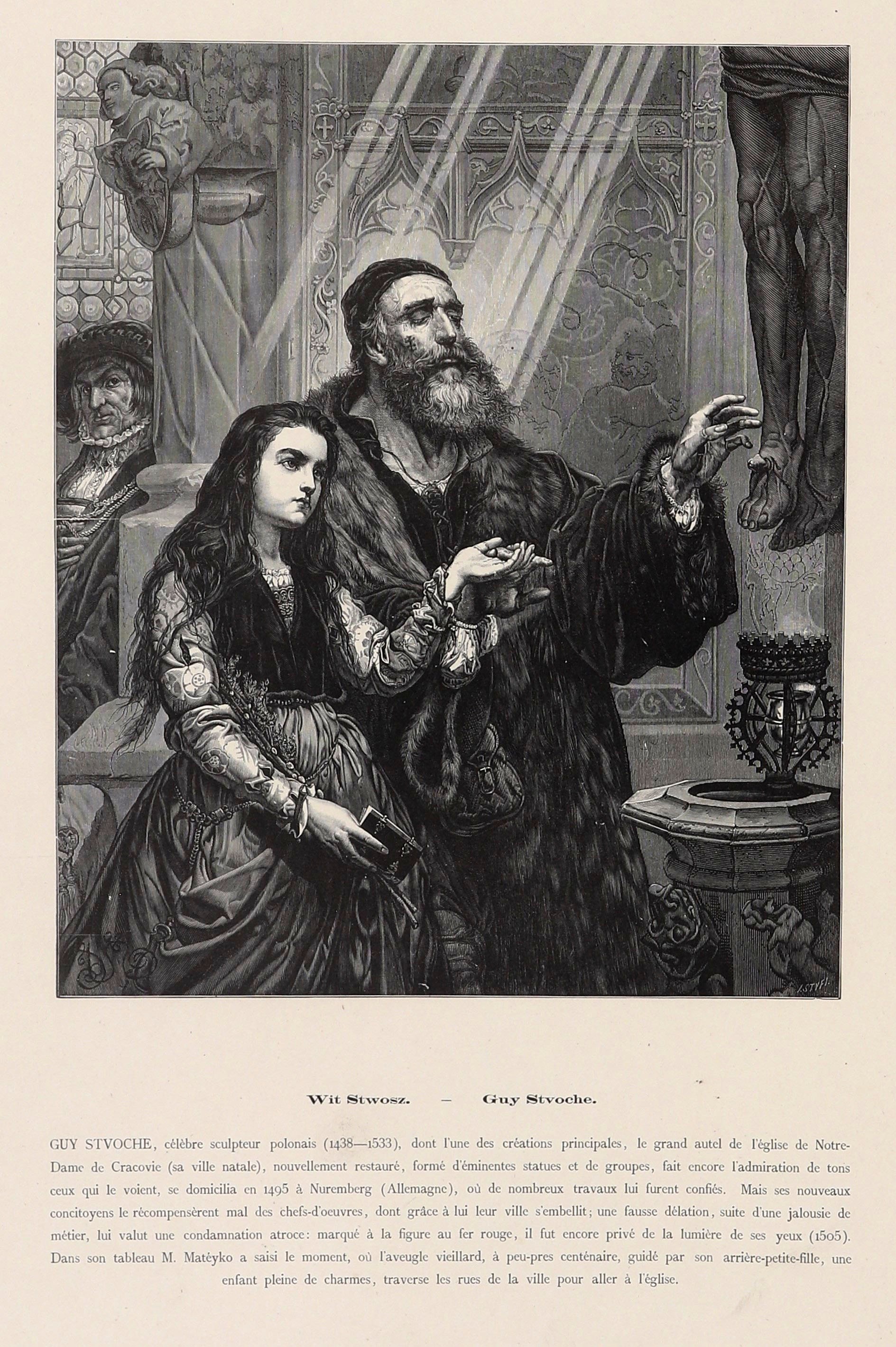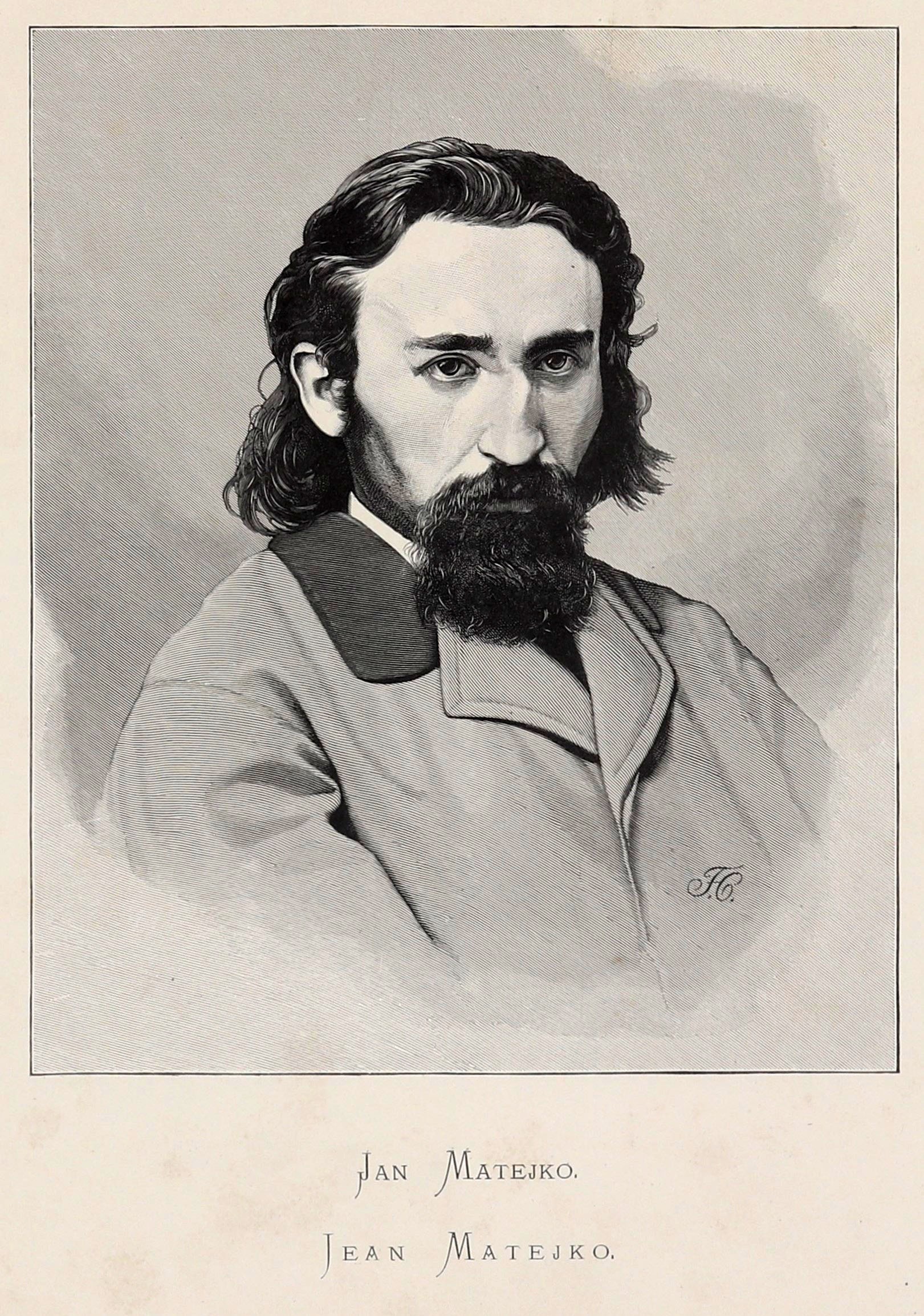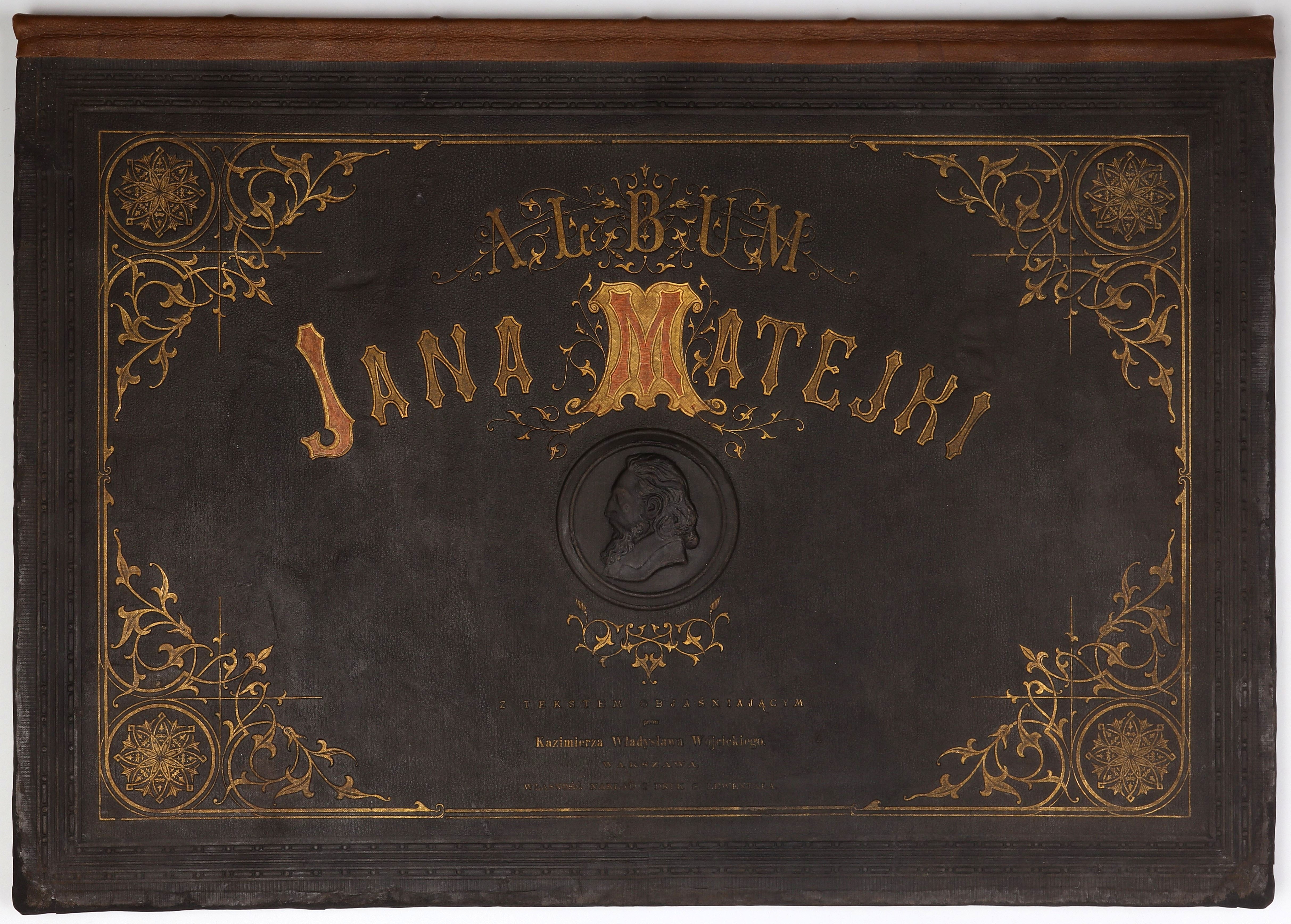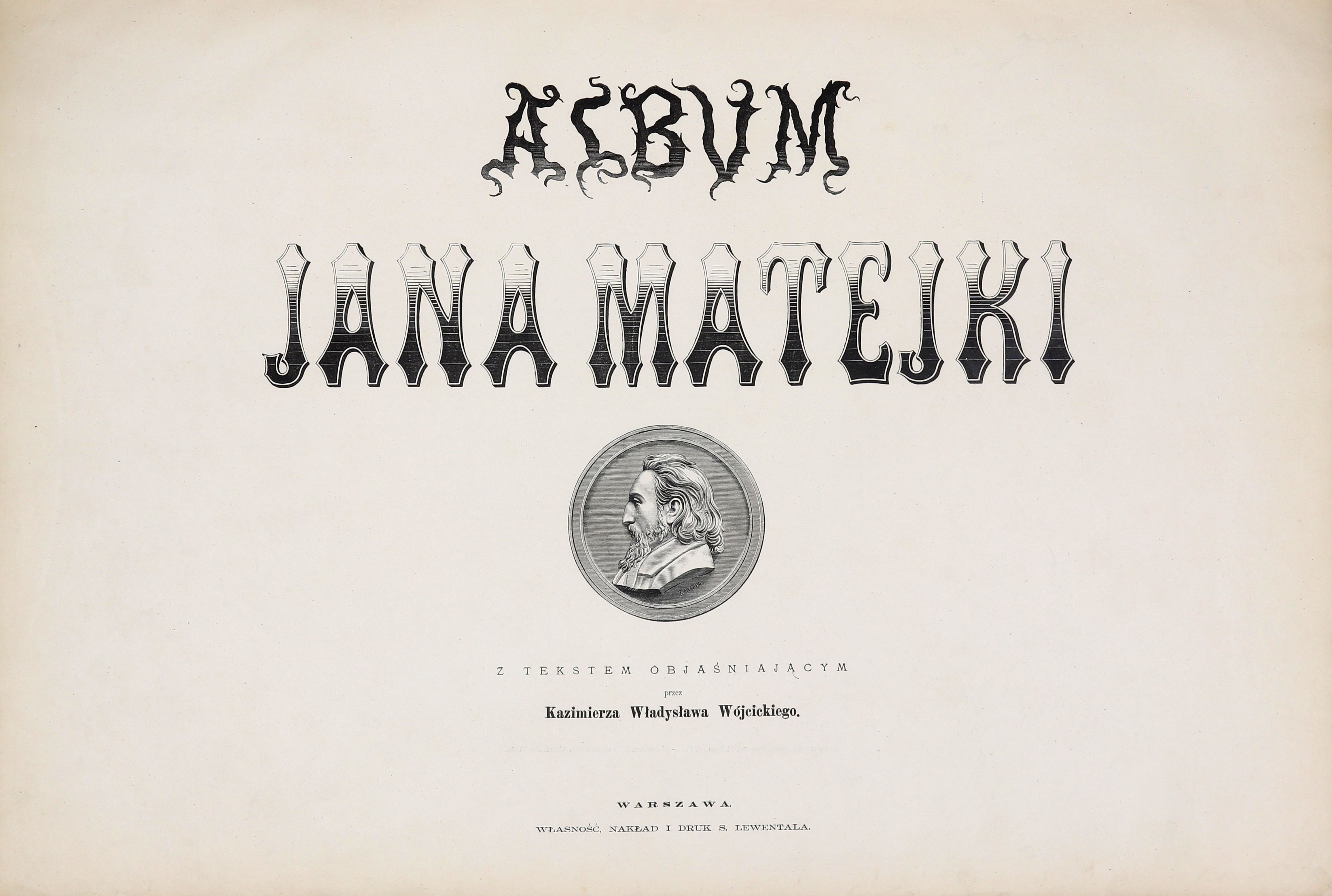MATEJKO Jan. Album Jana Matejki z tekstem objaśniającym Kazimierza Władysława Wójcickiego, nakład i druk Salomona Lewentala, Warszawa 1873-1876, 49 k. tabl. ryc.; format 460x660 mm. Publikacja ukazywała się w latach 1873-1876 jako pojedyncze zeszyty, które później oprawiono w jedną całość. Album zawiera 49 tablic, w tym jedną nienumerowaną z portretem Matejki; każdą z tablic poprzedza tekst objaśniający autorstwa Kazimierza Władysława Wójcickiego (1807-1912). Tablice drzeworytnicze rytowane przez różnych artystów. Przedstawiają one m.in. Kazanie Skargi, Stańczyka, Rejtana, Batorego pod Pskowem, Unię lubelską, Kopernika, Wernyhorę, Śmierć Przemysława, Iwana Groźnego, a także portrety postaci historycznych oraz ludzi Matejce współczesnych czy widoki budowli i detali architektonicznych, m.in. Krakowa, Lwowa, Żółkwi, Wiśnicza, zamku w Podhorcach etc. Spis ilustracji i autorów rycin znajduje się na końcu albumu. Jan Matejko sam wykonywał rysunki na klockach drzeworytniczych za wyjątkiem dwóch, których autorami byli Julian Maszyński (1847-1901) i Stanisław Witkiewicz (1851-1915). Rytowali je: Piotr Dyamentowski (czynny 1871-1878), Edward Gorazdowski (1843-1901), Gustaw Hähle (artysta niemiecki), Józef Holewiński (1848-1917), Michał Kluczewski (czynny 1869-1875), Kazimierz Krzyżanowski (czynny 1860-1878), Aleksander T. Regulski (1839-1884), Julian Schübeler (czynny 1865-1889), Jan Styfi (1839-1921), Andrzej Zajkowski (1851-1914), Franciszek Szymborski (?-1872), Feliks Zabłocki (1846-1874). Twarda oprawa, tłoczone ornamenty i napisy., st. bdb.; EFEKTOWNY, KOMPLETNY EGZEMPLARZ.