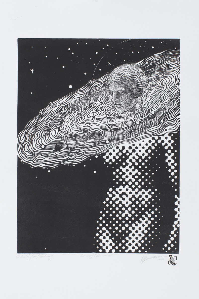 linoryt, papier, 40x30 cm, sygn. u dołu: Galaktyka/Galaxy linoryt/linocut Barmusiewicz 2021