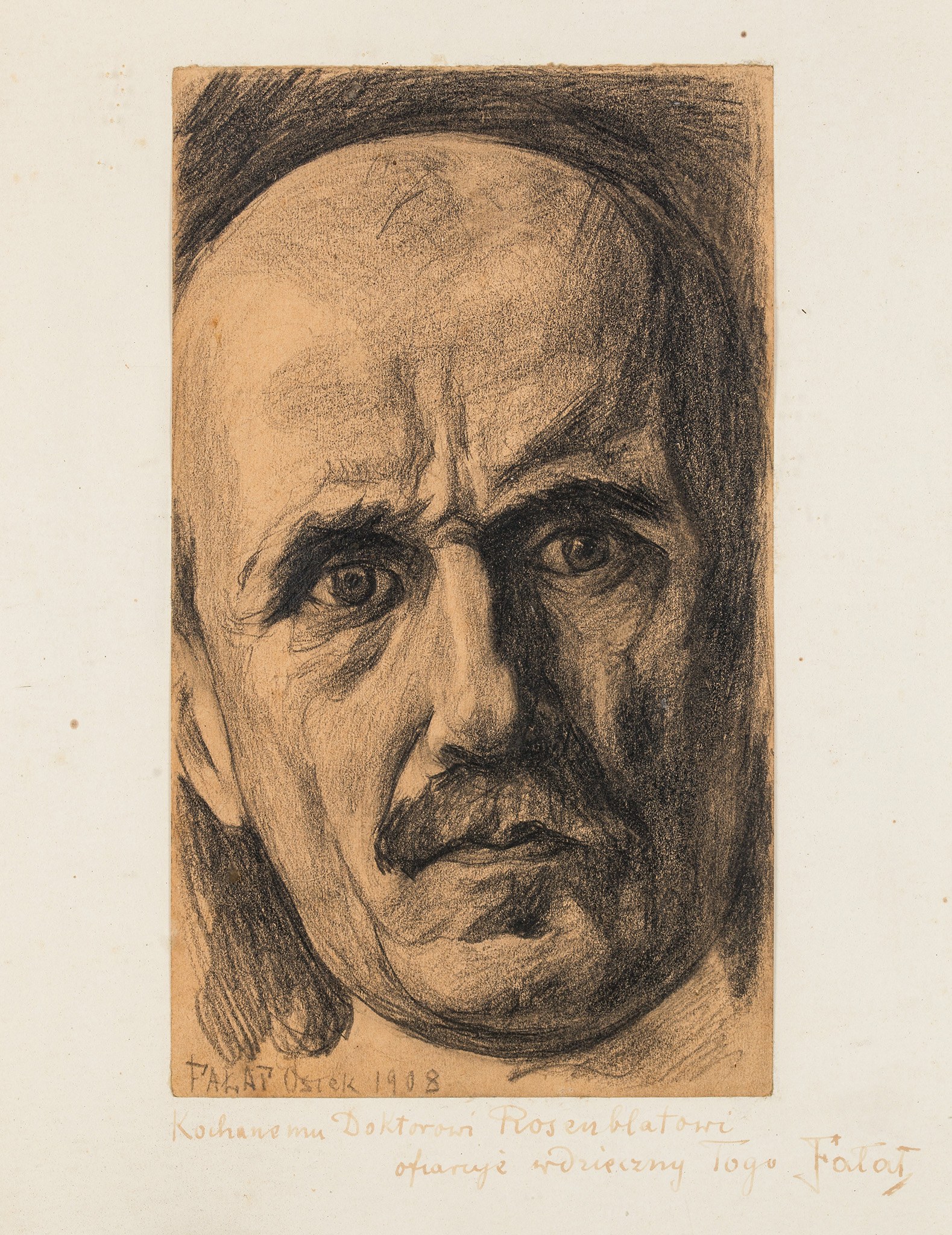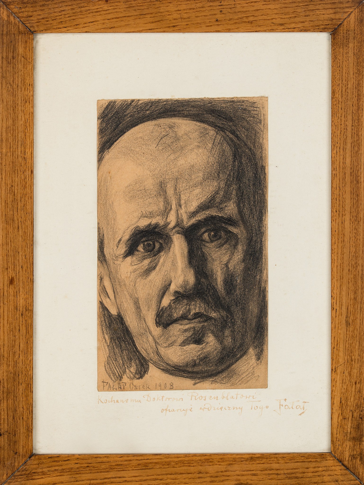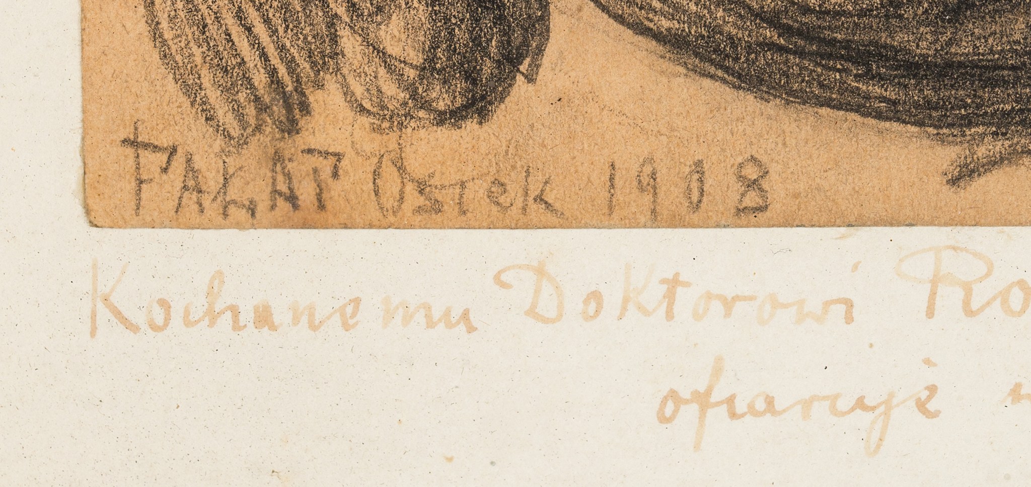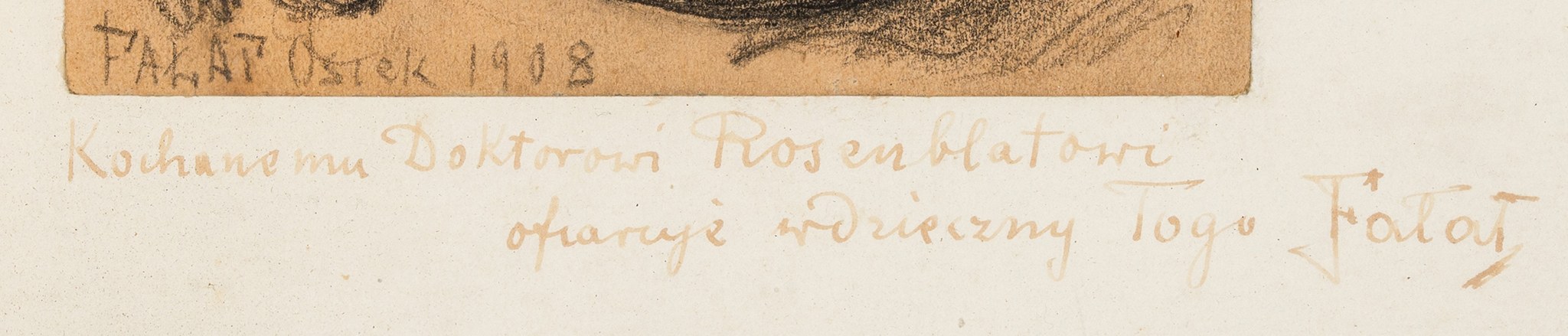 U dołu, poniżej rysunku odręczna dedykacja syna artysty dla zaprzyjaźnionego lekarza: "Kochanemu Doktorowi Rosenblatowi | ofiaruje wdzięczny Togo Fałat".