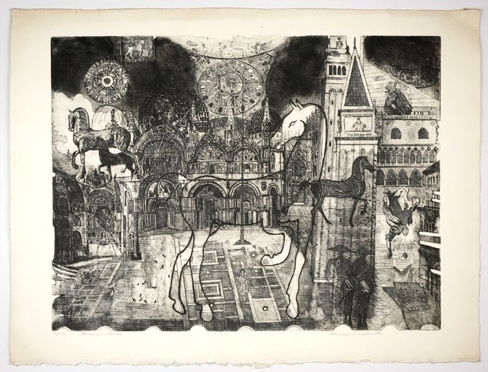 Akwaforta z akwatintą form. 49,4x65 na ark. 59,5x78,2 cm. W prawym dolnym narożniku autorska dedykacja na płycie: "Oldze, żonie mojej dedykuję - Konrad". Ołówkowe sygnatury na dolnym marginesie: "1963. Konie Św. Marka", "Konrad Srzednicki" oraz oznaczenie odbitki autorskiej "E. d'A". Górny margines lekko zakurzony, poza tym stan dobry.