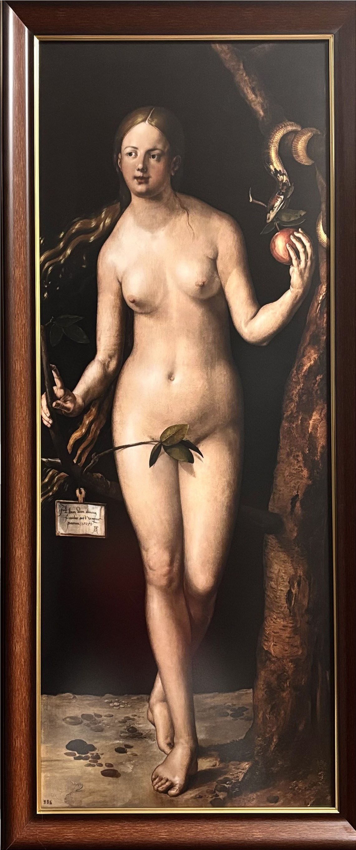 Na gałązce trzymanej przez Ewę w obrazie z 1507 roku rzeczywiście wisi tabliczka, na której znajduje się sygnatura Albrechta Dürera oraz data "1507". To ważny element tych obrazów, charakterystyczny dla wielu dzieł Dürera. Umieszczenie sygnatury w tak widocznym miejscu podkreślało jego status artysty i świadomość własnej wartości.