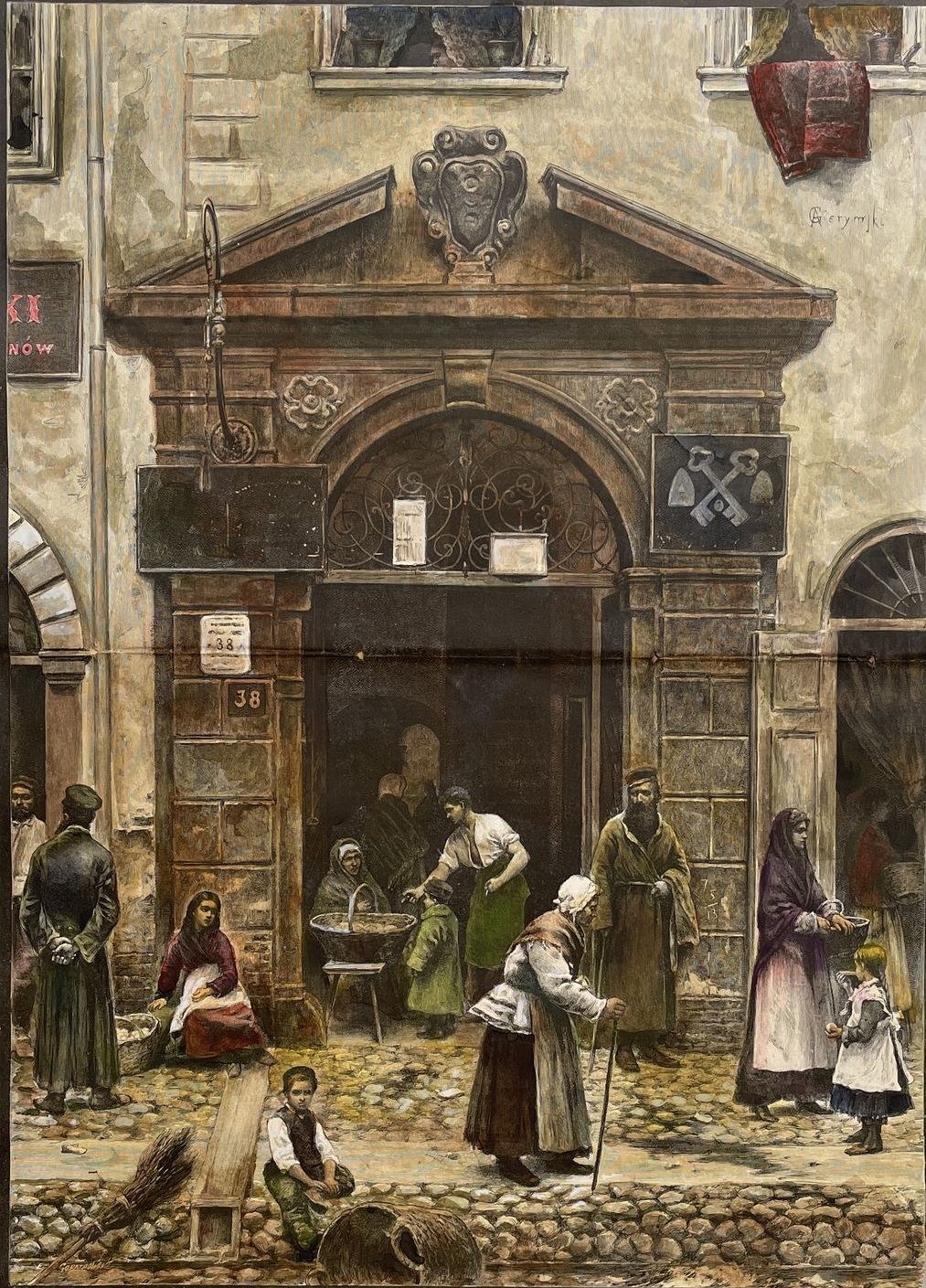 STARE MIASTO. Rys. Aleksander Gierymski. Ryt. E. Gorazdowski. Drzeworyt o wym. 29 x 40 cm, wym. z passepartout 39 x 50 cm. Ślad złożenia. Prezentowany drzeworyt pochodzi z drugiej poł. XIX w. z „Tygodnika Illustrowanego”. Kolorowano ręcznie akwarelą.