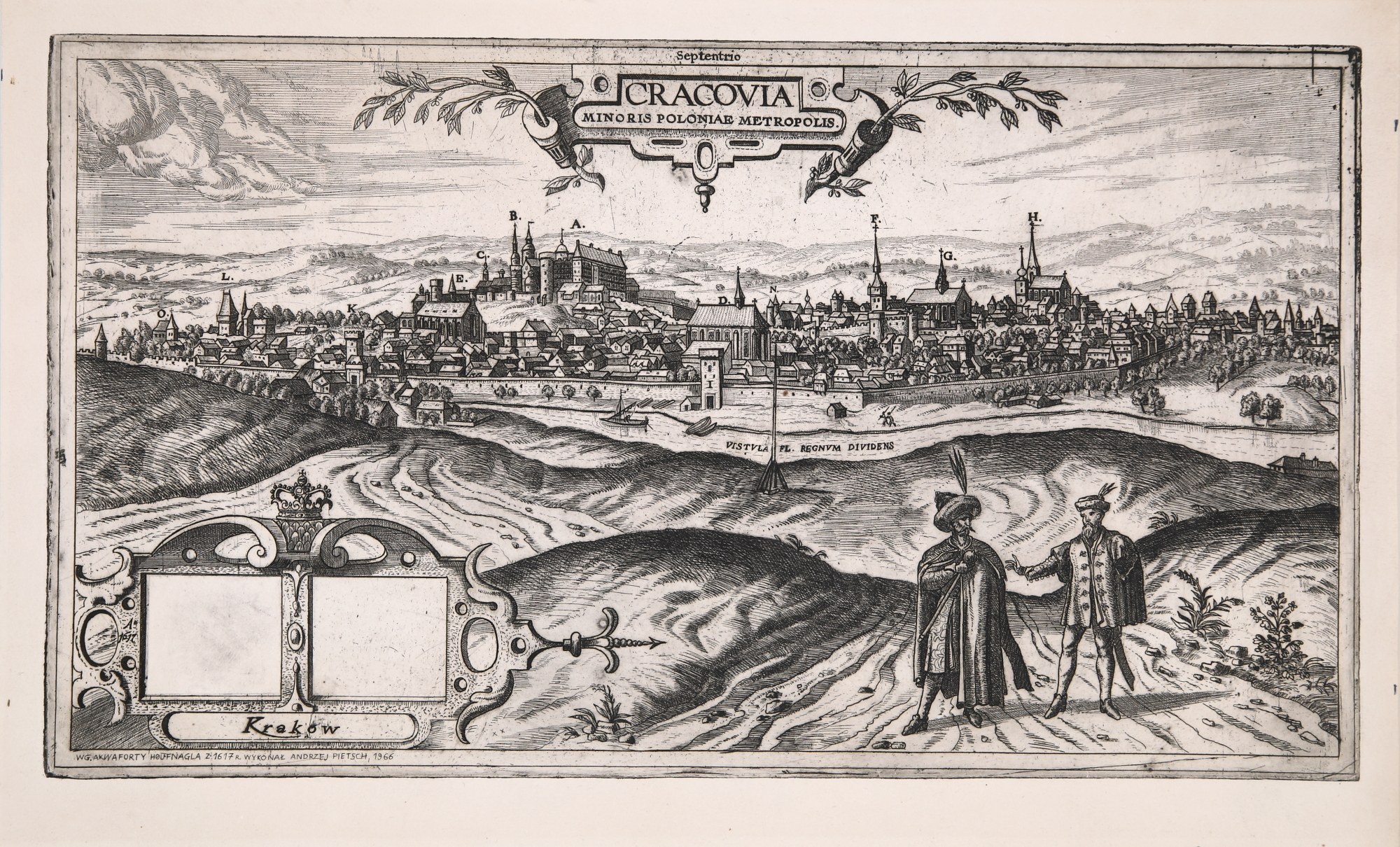 Mocna, intensywna odbitka. Widok Krakowa od południa, z Kopca Krakusa według oryginalnej grafiki: CRACOVIA MINORIS POLONIAE METROPOLIS z: Georg Braun, Franz Hogenberg, "Civitates orbis terrarum", t.VI "Theatri praecipuarum totius mundi...., Kolonia 1617