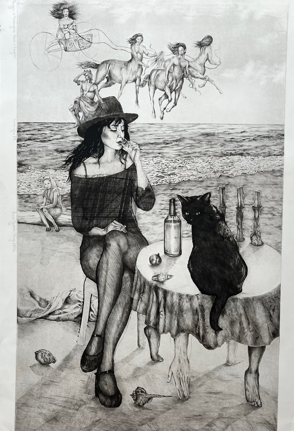 Anna Janusz-Strzyż (1968), Przyjęcie w towarzystwie uczuć i zmysłów, sucha igła, A.P. 98x67cm, 2001, grafika wykonana techniką suchej igły, egzemplarz autorski. Surrealistyczny obraz pełen nieoczywistych symboli, nawet czarny kot nie jest w tym kontekście jednoznaczną przepowiednią. Lewy boczny margines: Przyjęcie w towarzystwie uczuć i zmysłów, sucha igła, A.P. 98x67cm, 2001 r. Stan bardzo dobry, bez oprawy. Galeria może zrealizować oprawę grafiki na zlecenie i koszt nabywcy.