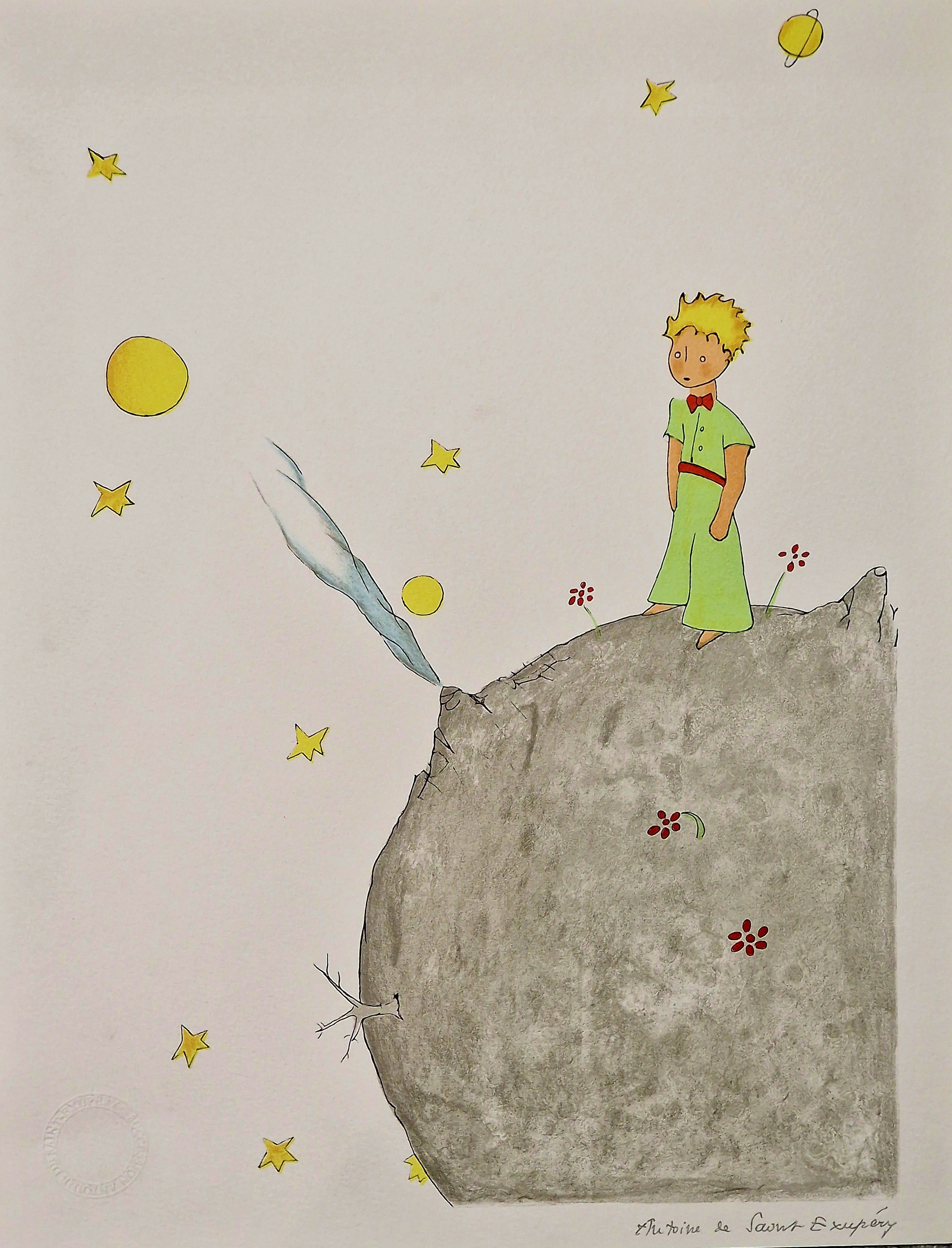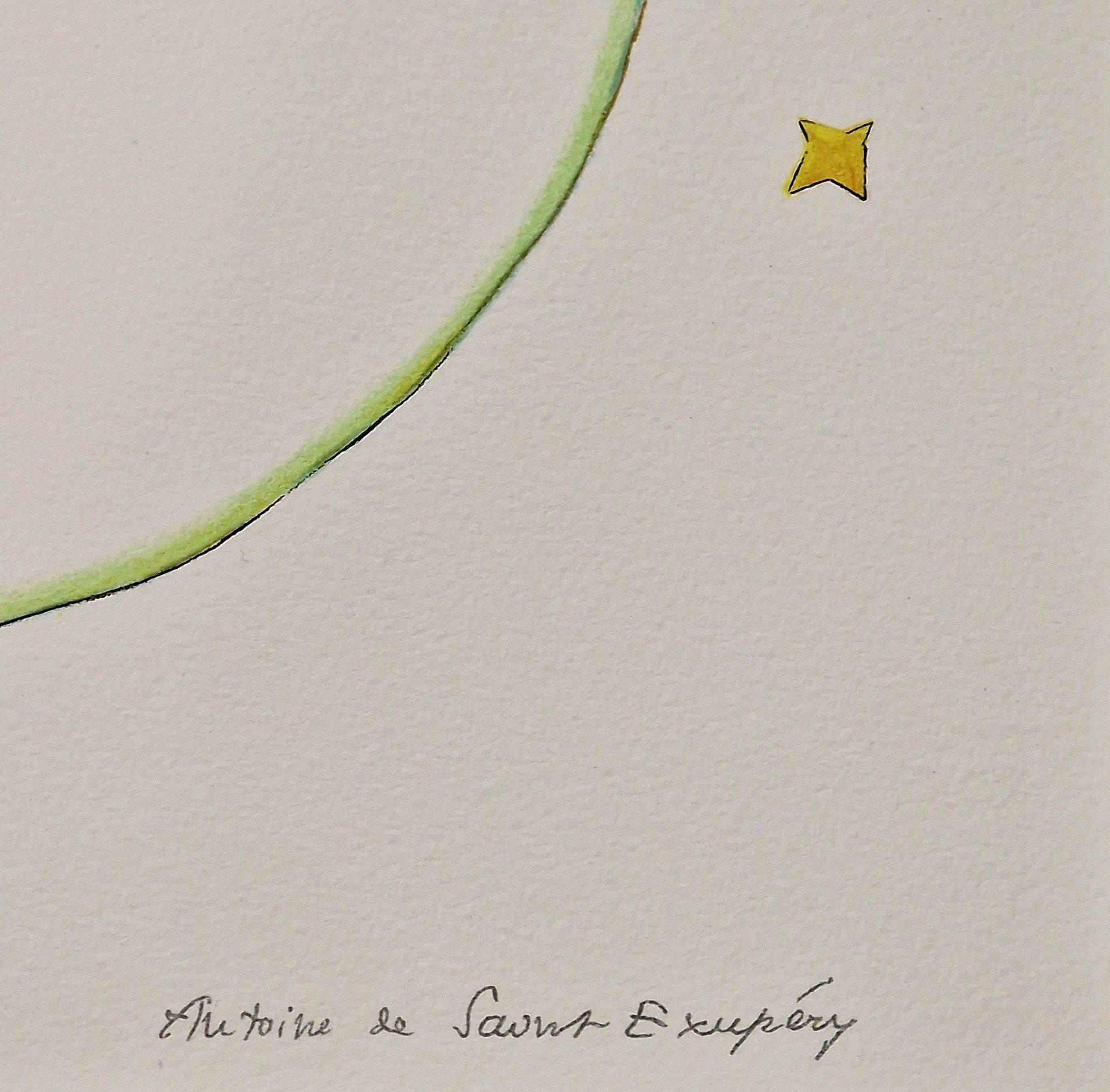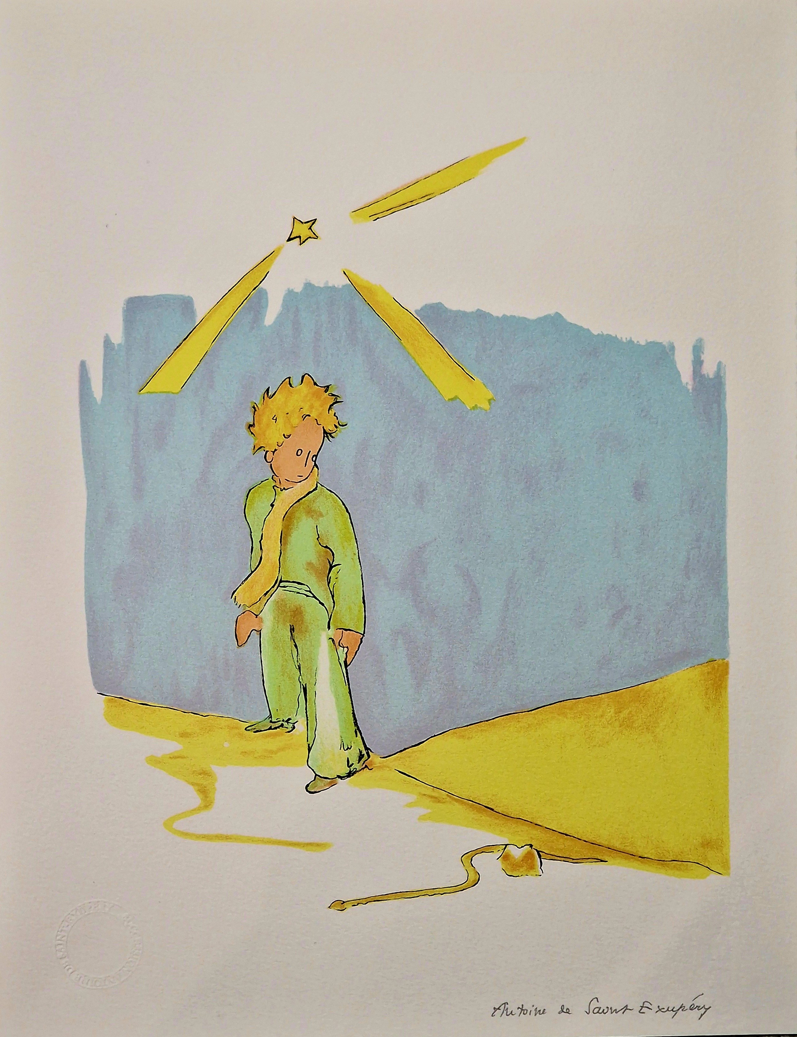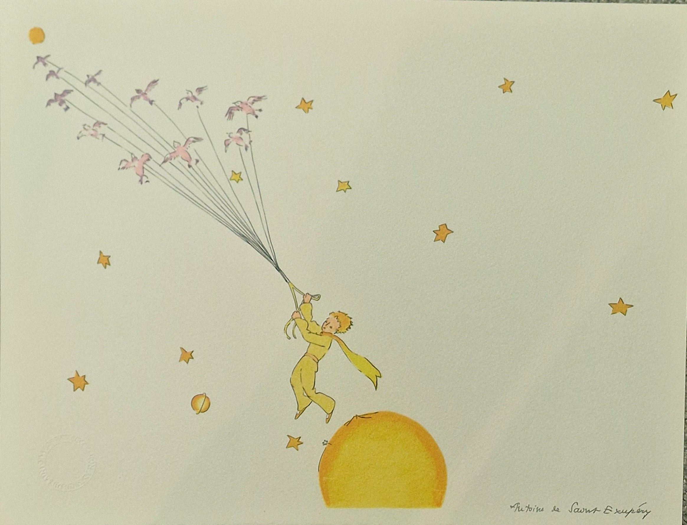 Litografie barwne, papier welinowy Arches ze znakiem wodnym ; 40 x 30 cm, faksymile podpisu autora p.d., sucha pieczęć licencyjna l.d.: „SUCCESSION ANTOINE DE SAINT-EXUPERY”. Do zestawu załączona książka wyd.2024,