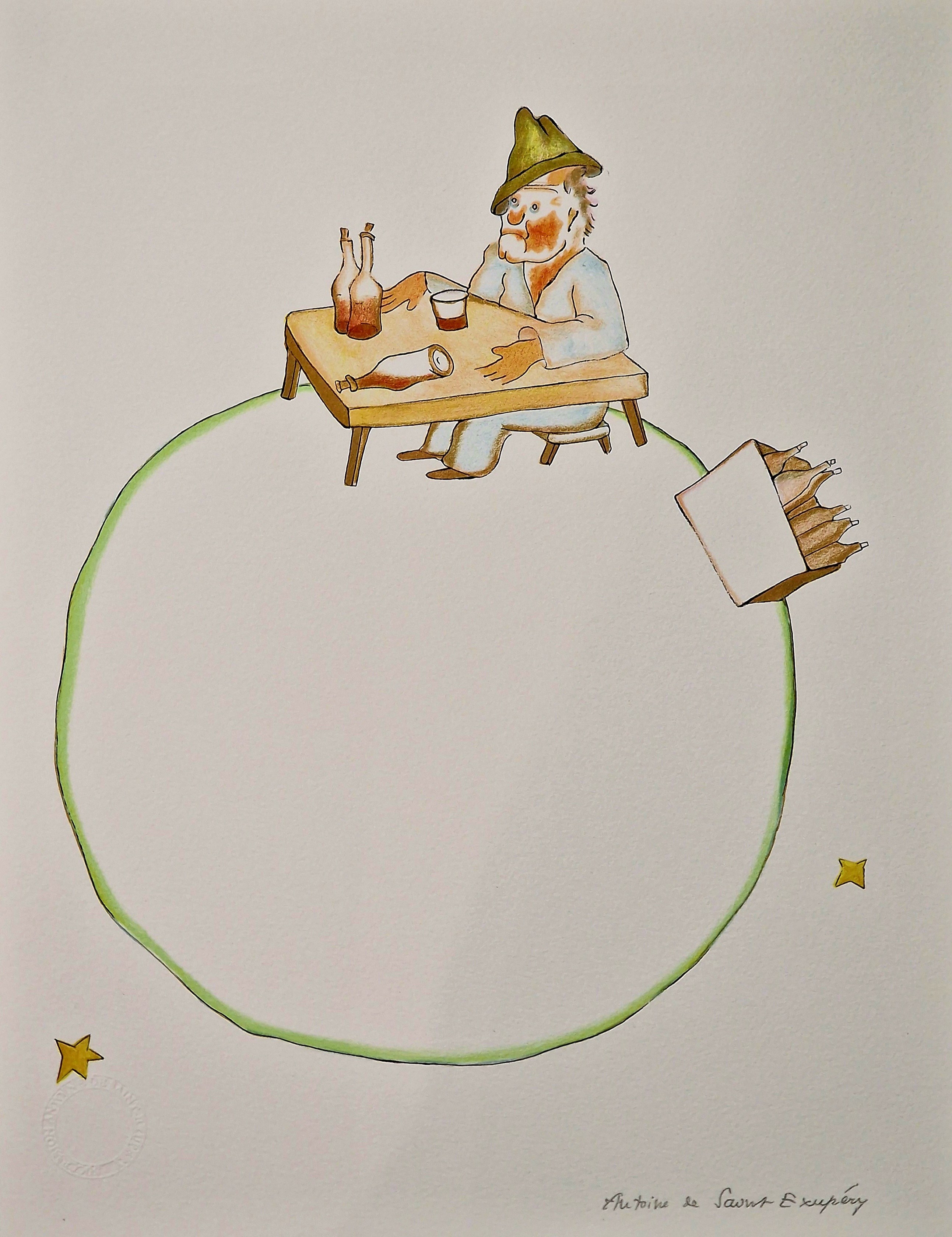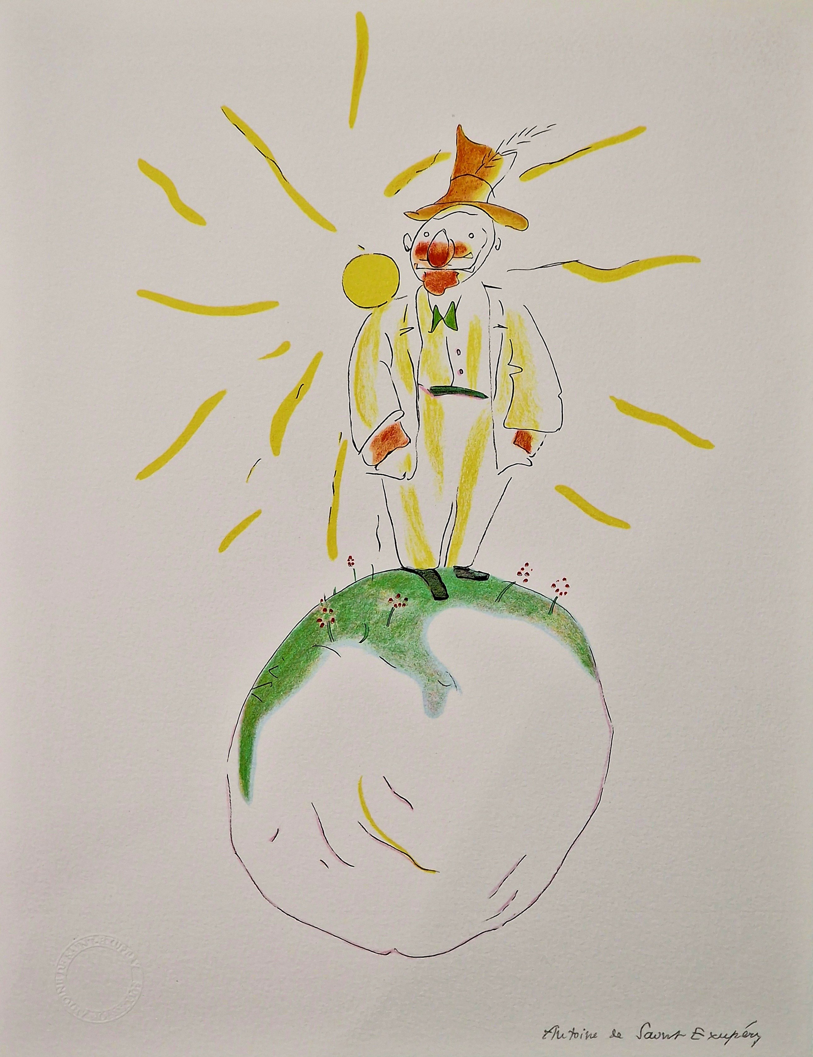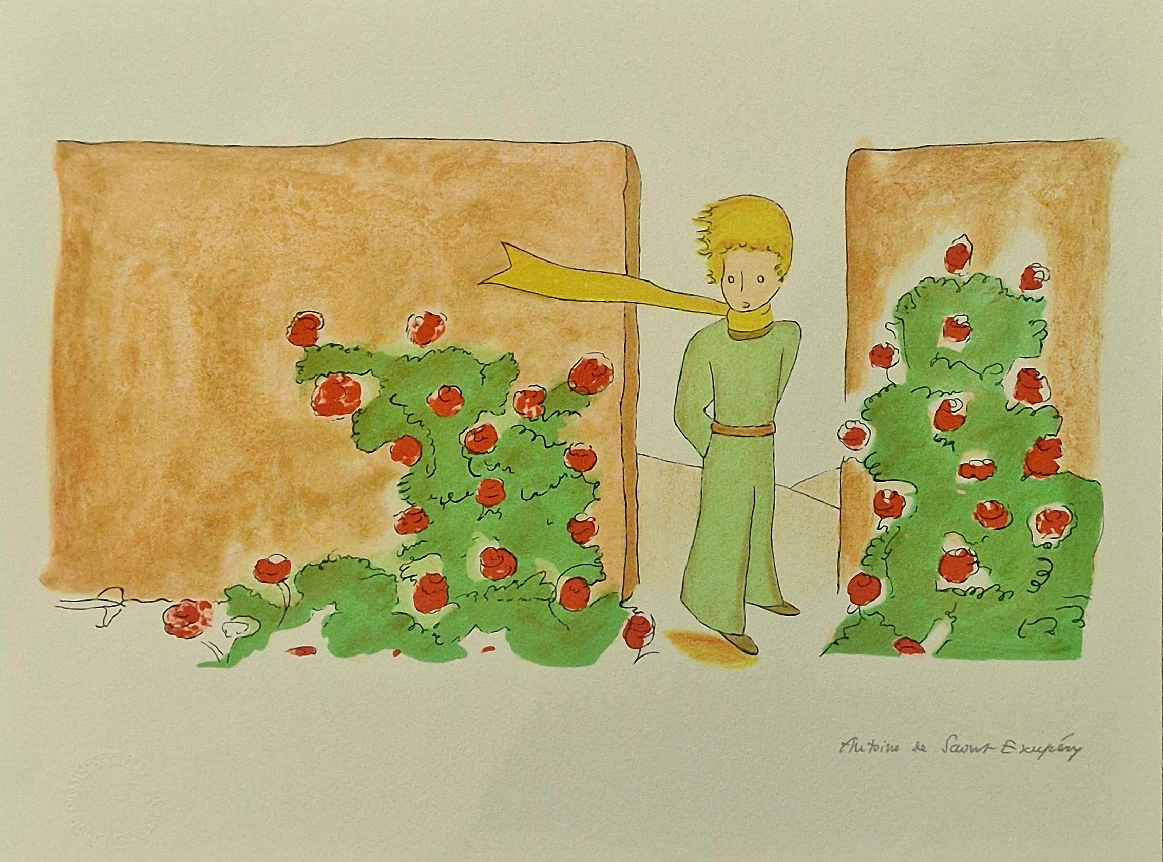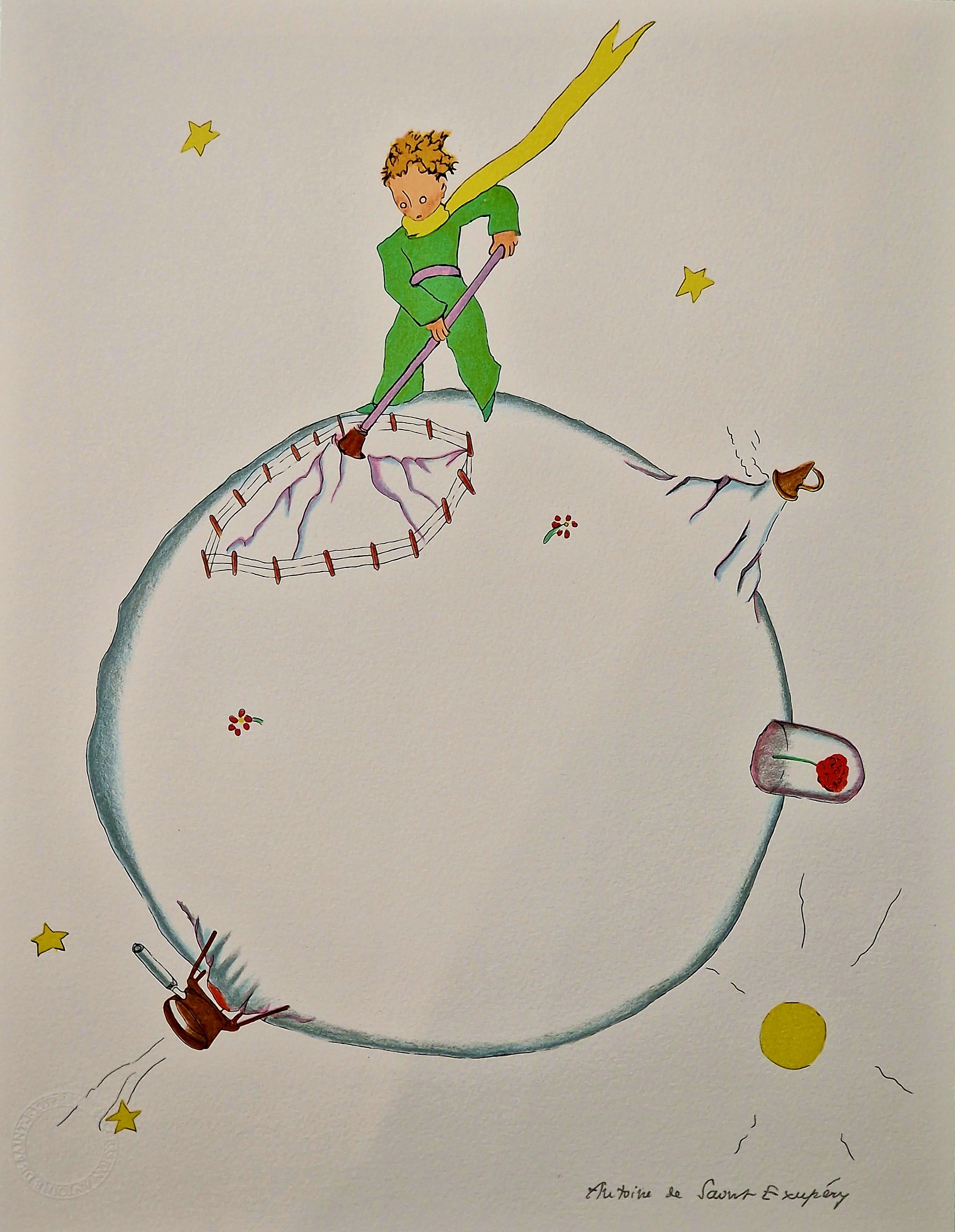Litografie barwne, papier welinowy Arches ze znakiem wodnym ; 40 x 30 cm, faksymile podpisu autora p.d., sucha pieczęć licencyjna l.d.: „SUCCESSION ANTOINE DE SAINT-EXUPERY”. Do zestawu załączona książka wyd.2024,