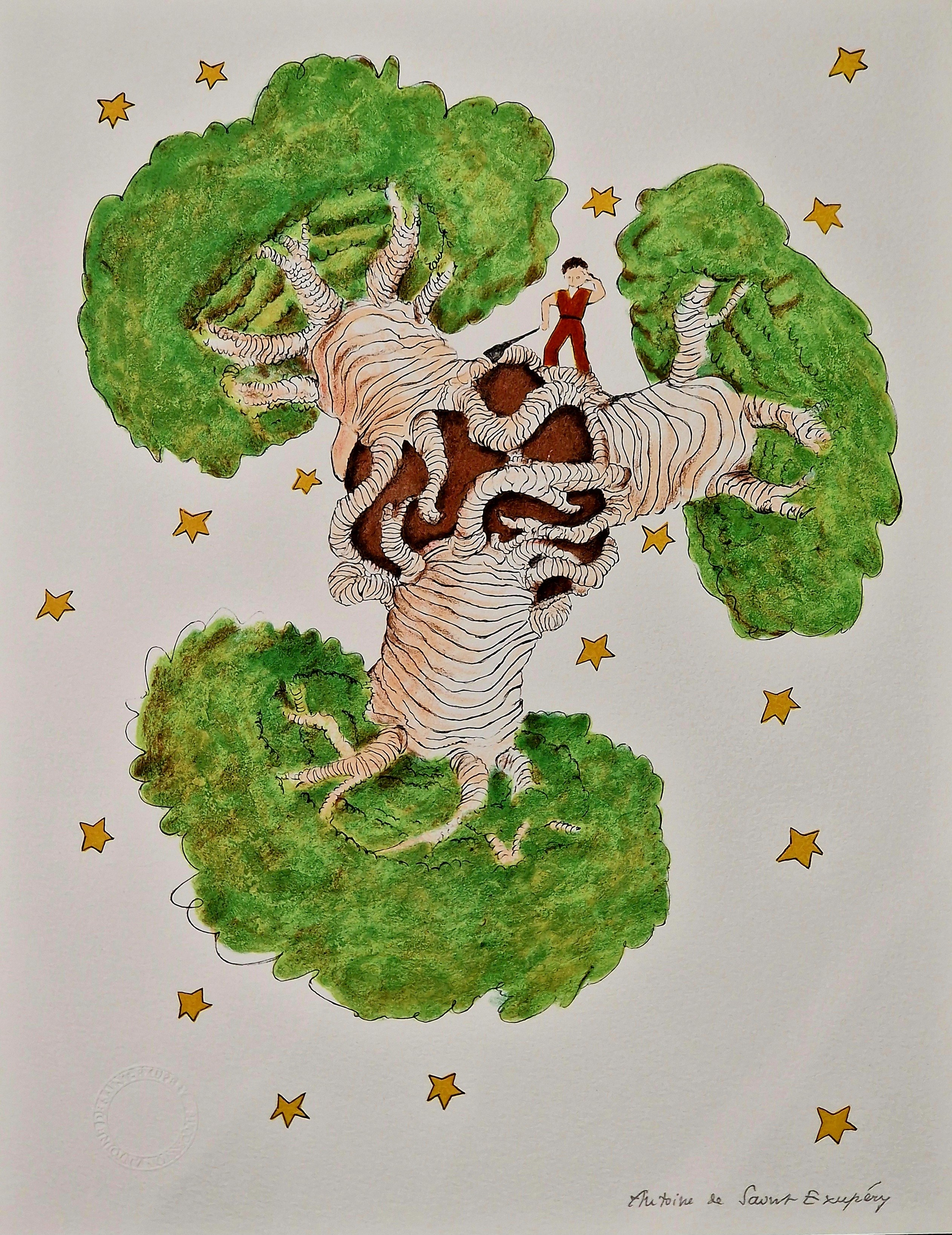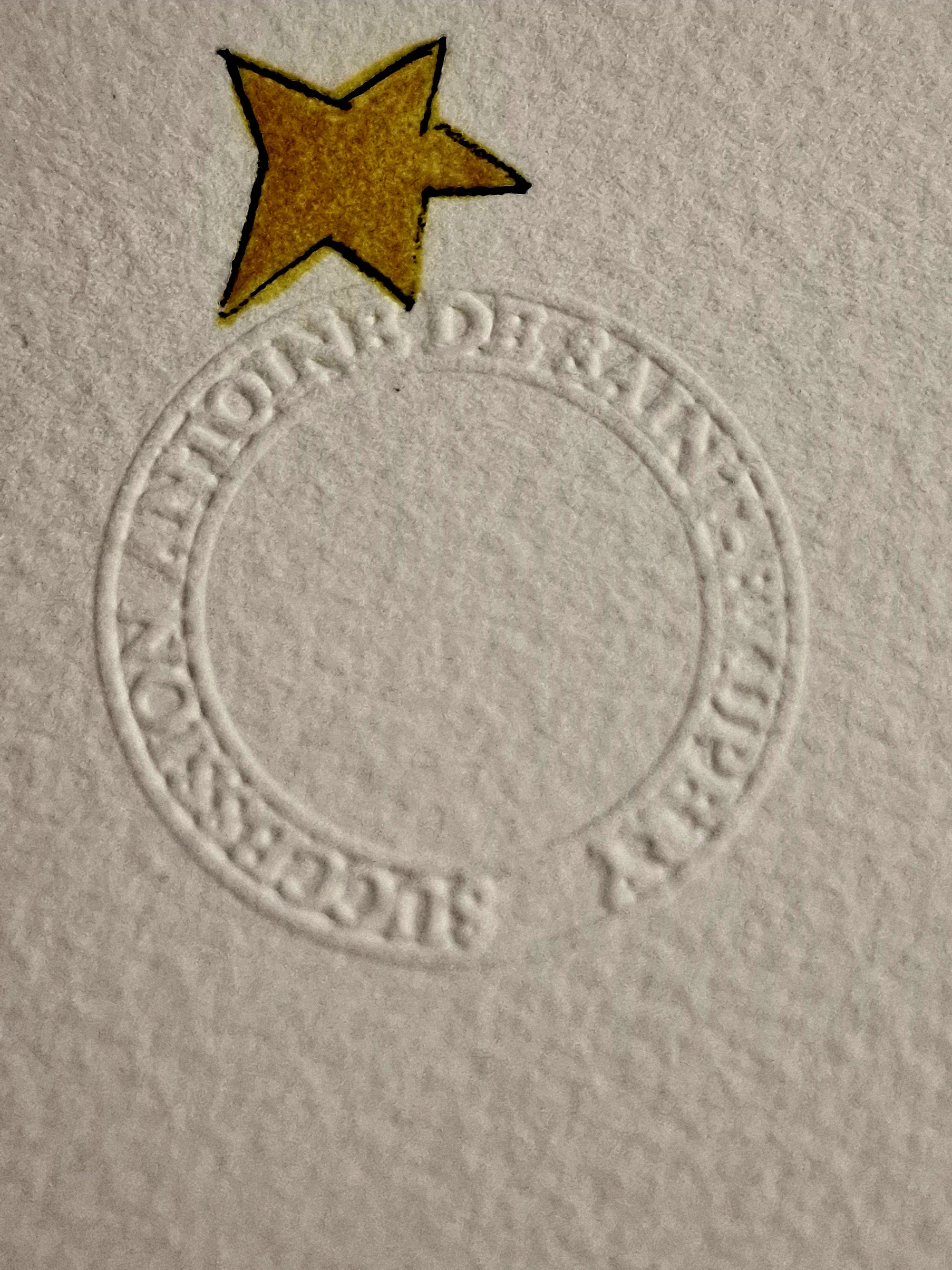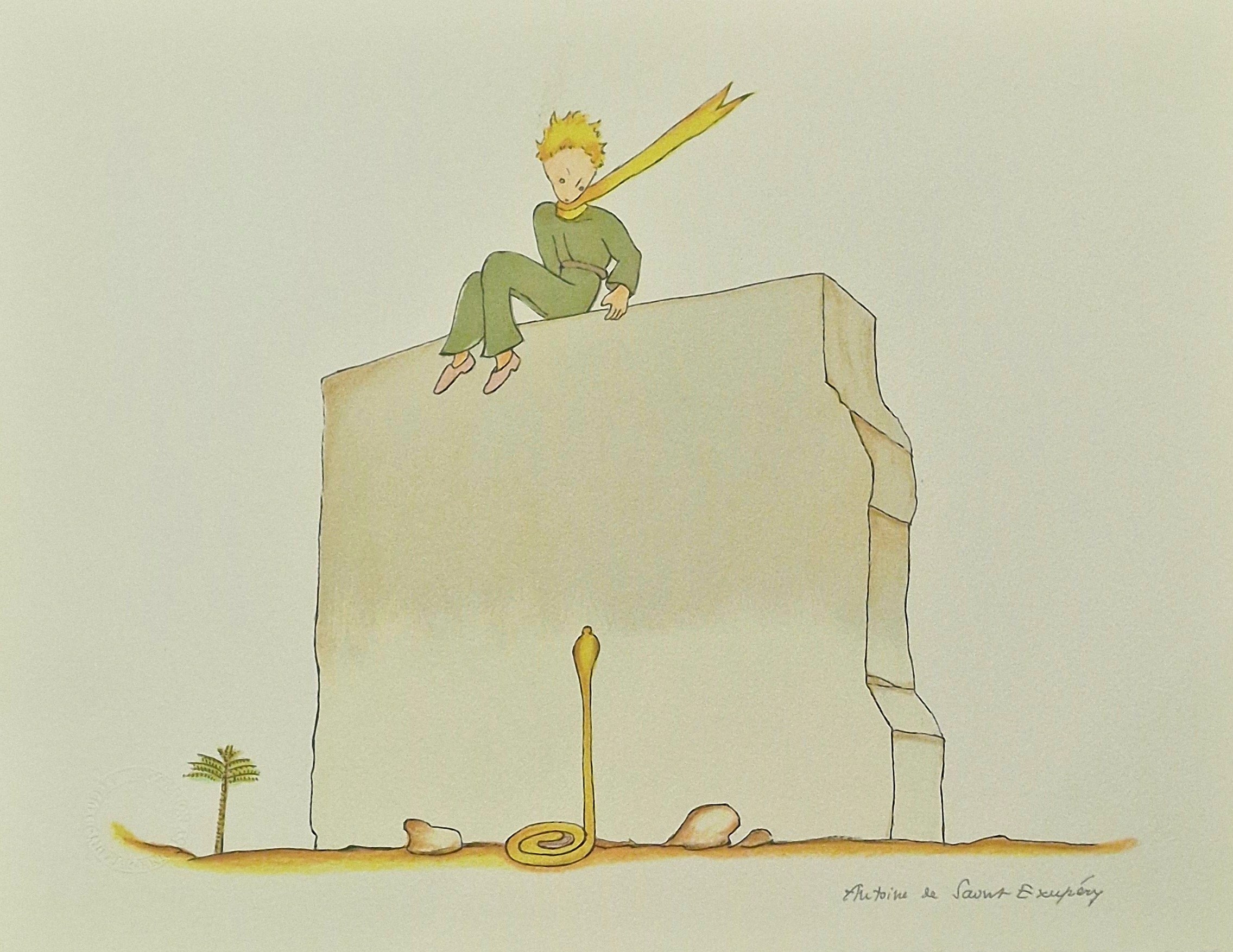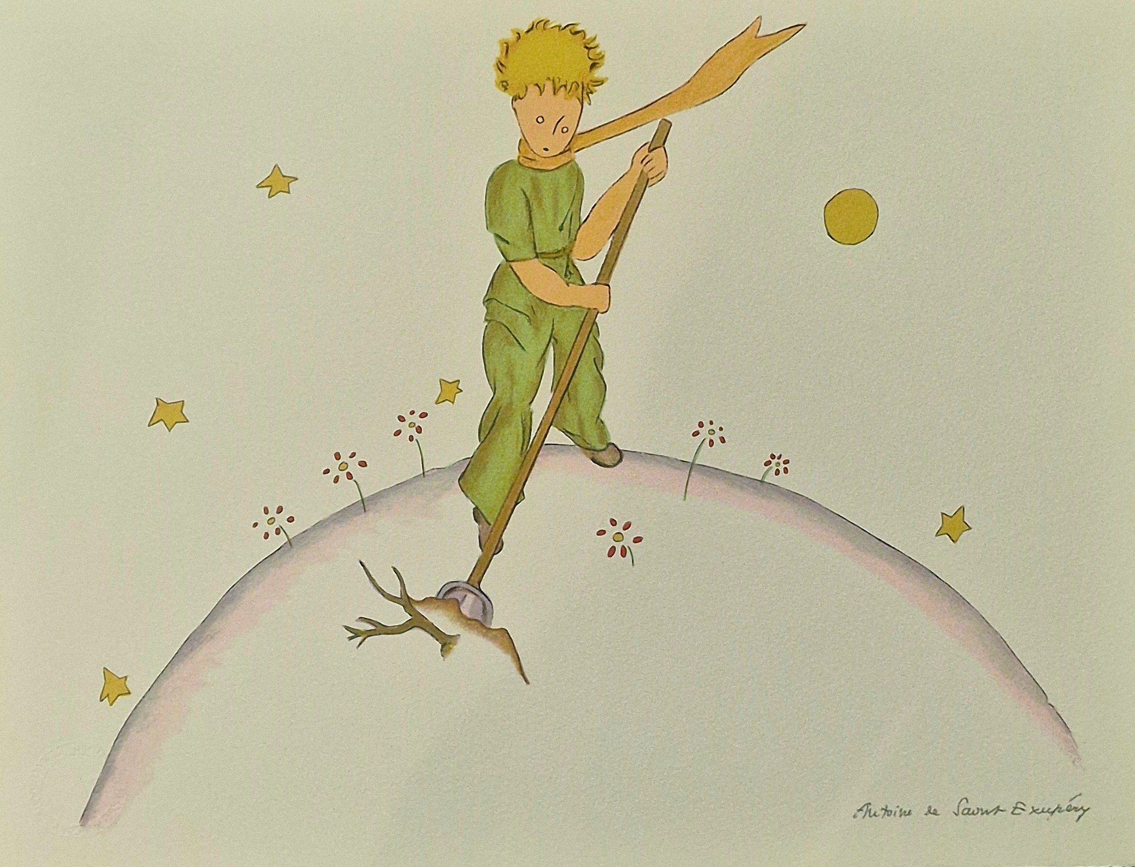 Litografie barwne, papier welinowy Arches ze znakiem wodnym ; 40 x 30 cm, faksymile podpisu autora p.d., sucha pieczęć licencyjna l.d.: „SUCCESSION ANTOINE DE SAINT-EXUPERY”. Do zestawu załączona książka wyd.2024,