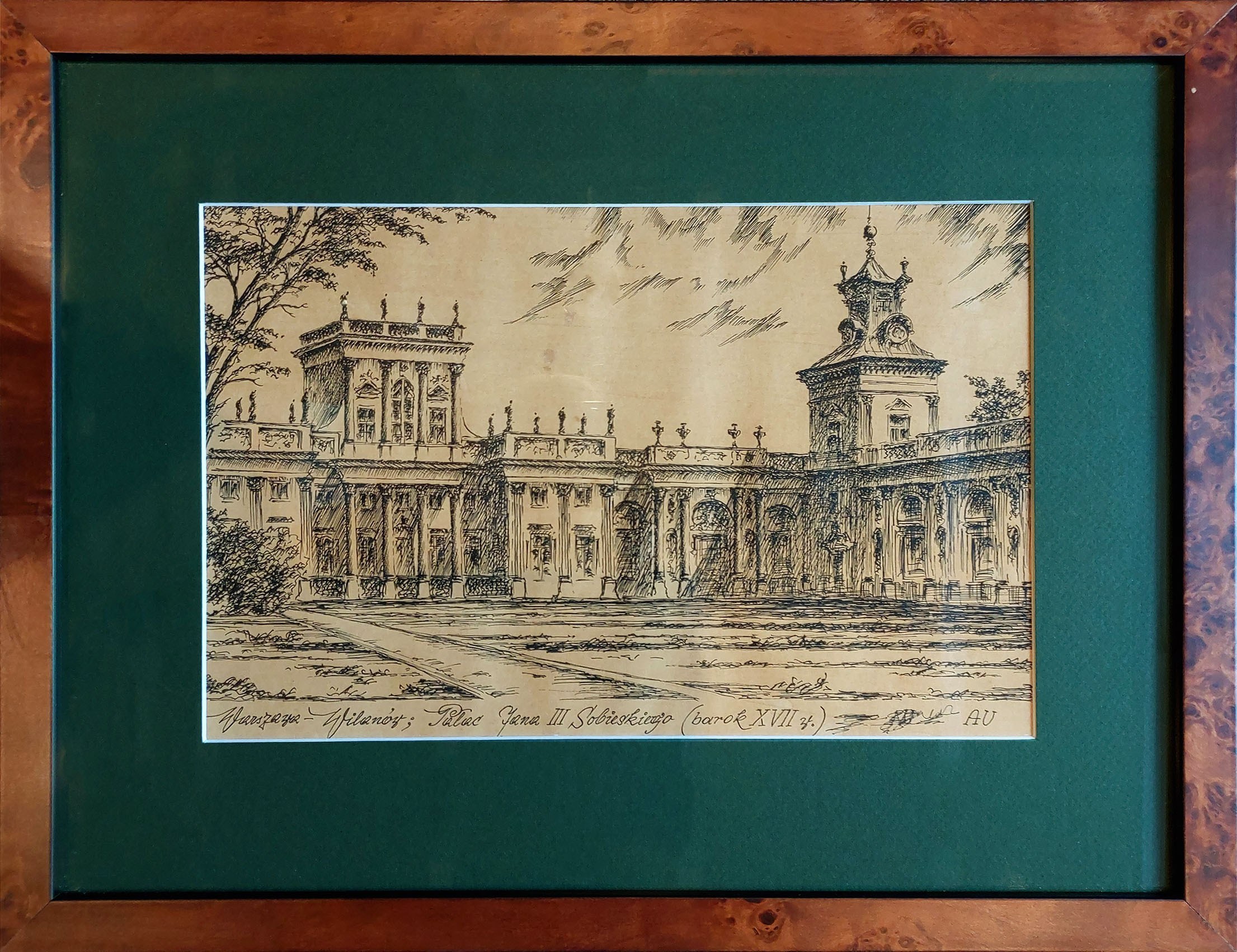 pod kompozycją kaligrafowany napis tuszem: „Warszawa – Wilanów; Pałac Jana III Sobieskiego (barok XVII w.)
