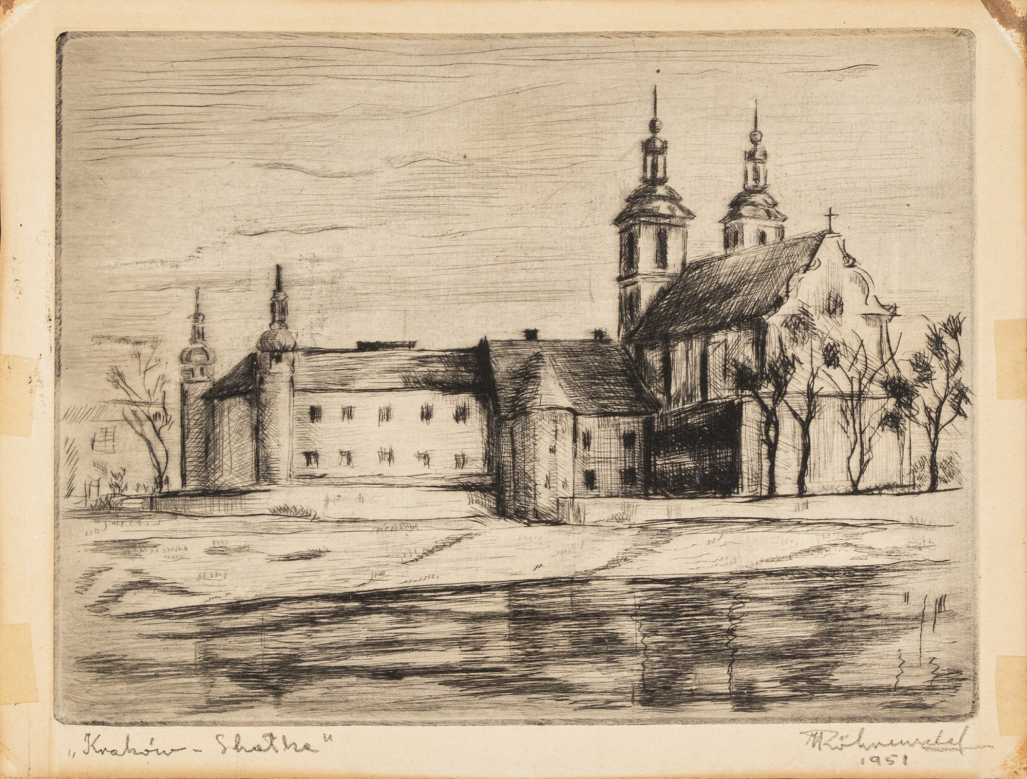 Grafika zakwaszona, na marginesach (poza kompozycją) podklejenia taśmą klejącą.