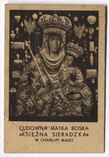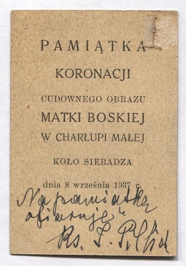 Obrazek form. 8,7x5,8 cm. Obrazek wydany z okazji koronacji obrazu w Charłupi Małej koło Sieradza 8 IX 1937 (o czym informuje tekst na odwrocie. Tamże odręczna dedykacja ks. J. Pillicha (?). Zaplamienie narożnika na odwrocie.