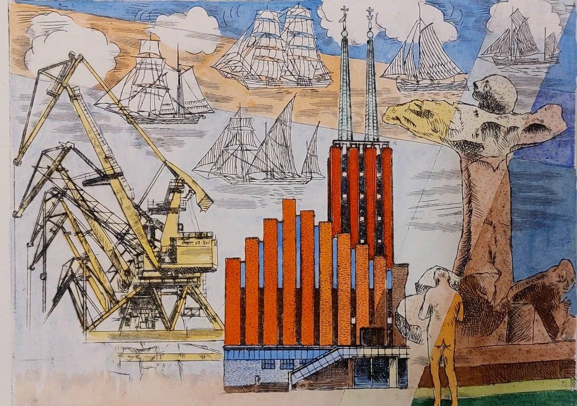 Grafika w passe-partout, wymiary w świetle oprawy: 22x29cm, sygnowana, technika- suchoryt- akwarela.