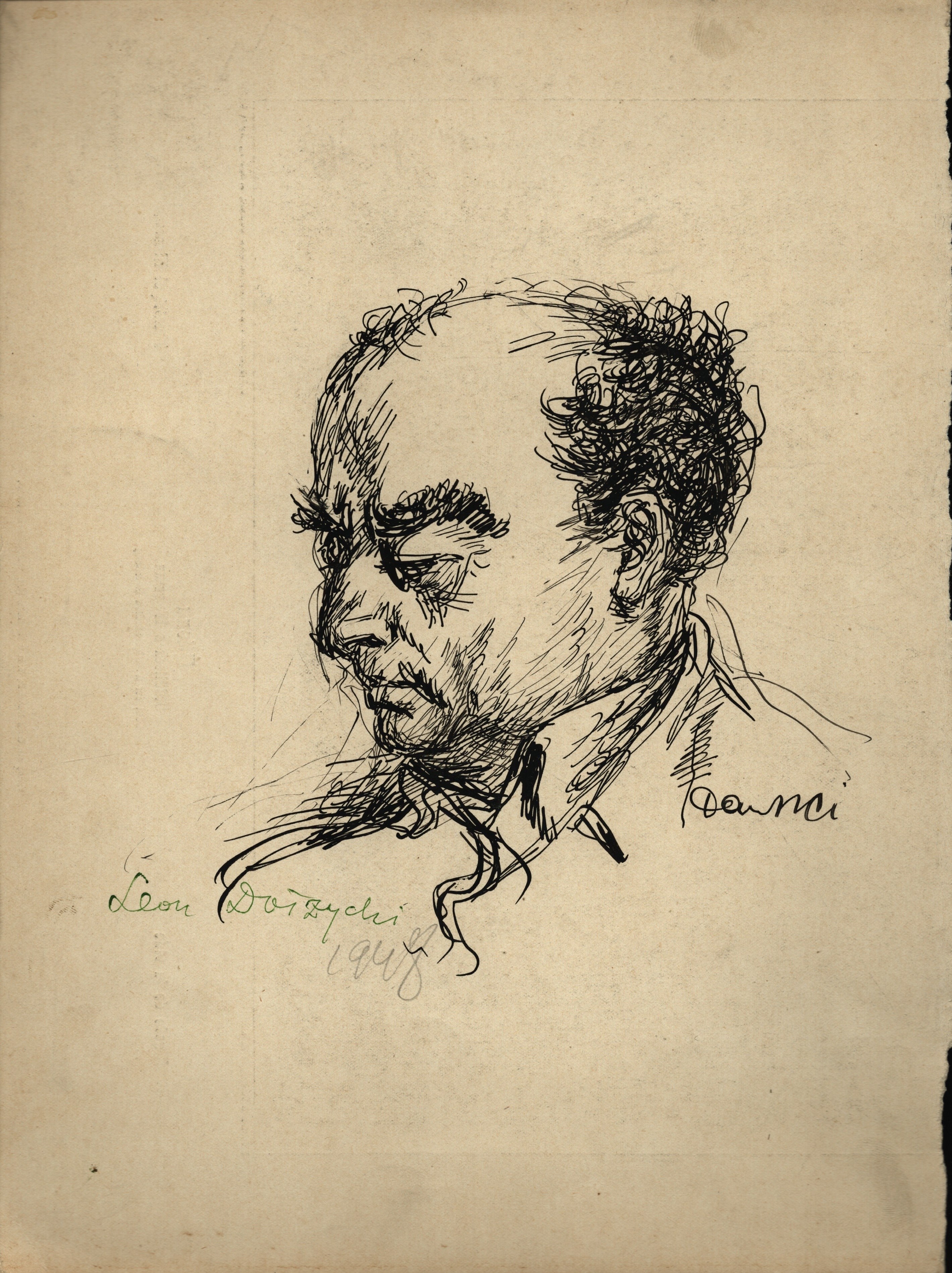 Rysunek tuszem, papier. Wym. 36,3 x 28 cm (arkusz). Sygnowany p.d.: 'Dawski' oraz opisany l.d. "Leon Dołżycki 1948".