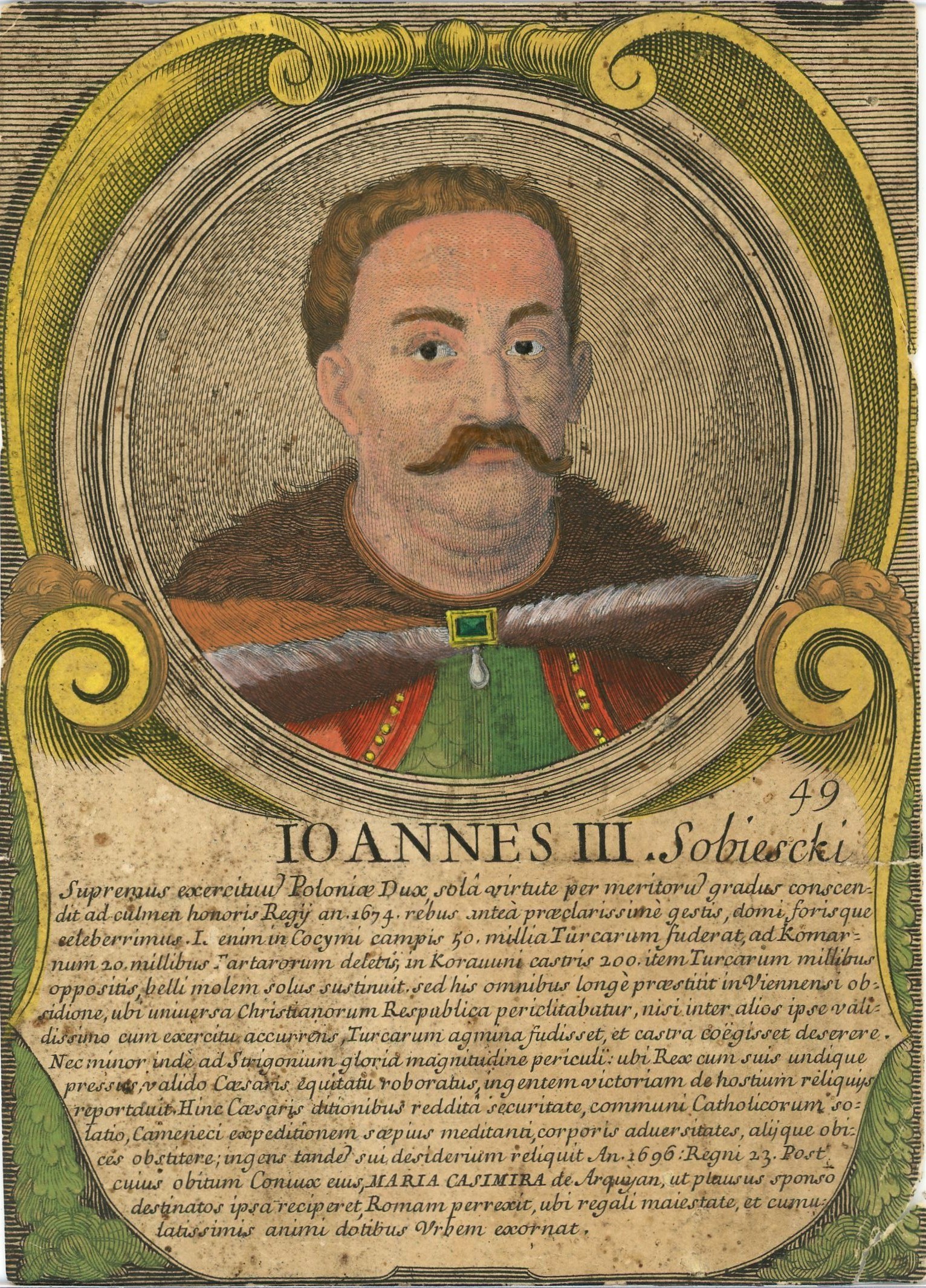Wym.: 130 x 180 mm. Miedzioryt ręcznie kolorowany w epoce. Pochodzi z "Ducum Regumque Polonorum a Lecho ad Augustum effigies", Rzym, 1702. Nieznaczne uszkodzenia krawędzi i rogów, podklejenia na odwrocie, poza tym stan dobry. Bardzo rzadkie, dotychczas nieznane w wersji kolorowanej.
