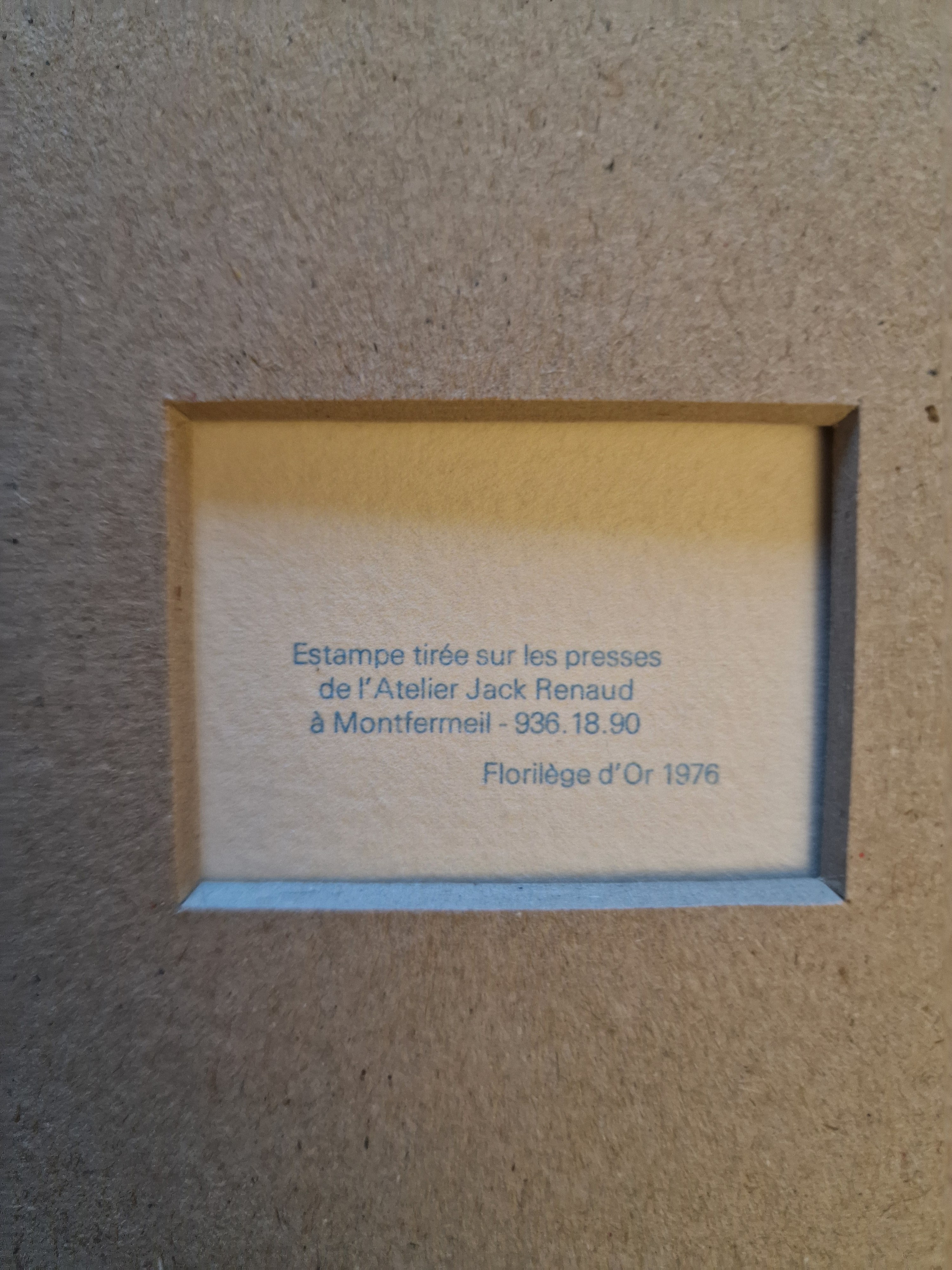 Litografia, papier 33 x 38 cm w świetle passe – partout o wym. 43 x 51 cm; limitowana edycja 300 egz.; na odwrociu typograficznie: “estampe tirée sur les presses / de l'Atelier Jack Renaud / à Montfermeil Florilege d’Or 1976" (wykonano na prasach Atelier Jack Renaud w Montfermeil Złota Antologia 1976);