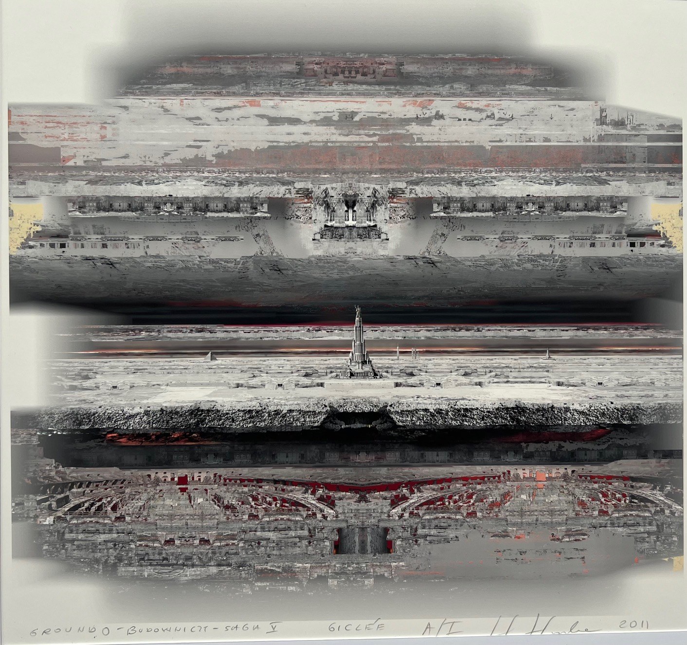 Hanna Haska vel Hanna Krulikowska, Ground 0, Budowniczy-Saga V, technika własna, druk cyfrowy, giclée, odbitka autorska A/I, 30x30 cm, 2011, Grafika jest wykonana techniką własną, druk cyfrowy, giclee, przy użyciu tuszu archiwalnego na płótnie. Praca sygnowana. Artystka tworzy cykle grafik ujętych w teki. Grafiki Hanny Haskiej są opowieścią o cywilizacji, bez podziału na kultury czy kręgi cywilizacyjne. Mówią o człowieku, jego naturze, możliwościach i ograniczeniach, o metafizyce i fizyce istnienia. Pełne są symboli już istniejących użytych w swoich dotychczasowych znaczeniach, ale też nadawanych od nowa przez artystkę. Naturalizm przedstawień jest złudny, bowiem świat wyobrażeń artystki jest bez wątpienia światem symboliczno-surrealnym zawieszonym między przeszłością a przyszłością. Poza przesłaniem intelektualnym grafiki Hanny Haskiej posiadają szlachetność grafiki warsztatowej i powagę charakteryzująca stare ryciny. Artystka od wielu lat jest obecna na rynku sztuki, reprezentowana przez Galerię Kościelak. Prace z tej serii były prezentowane m.in. na Warszawskich Targach Sztuki w edycjach 2021-2023 i znalazły miejsce w wielu prywatnych kolekcjach. Stan bardzo dobry, bez oprawy. Galeria może zrealizować oprawę grafiki na zlecenie i koszt nabywcy.