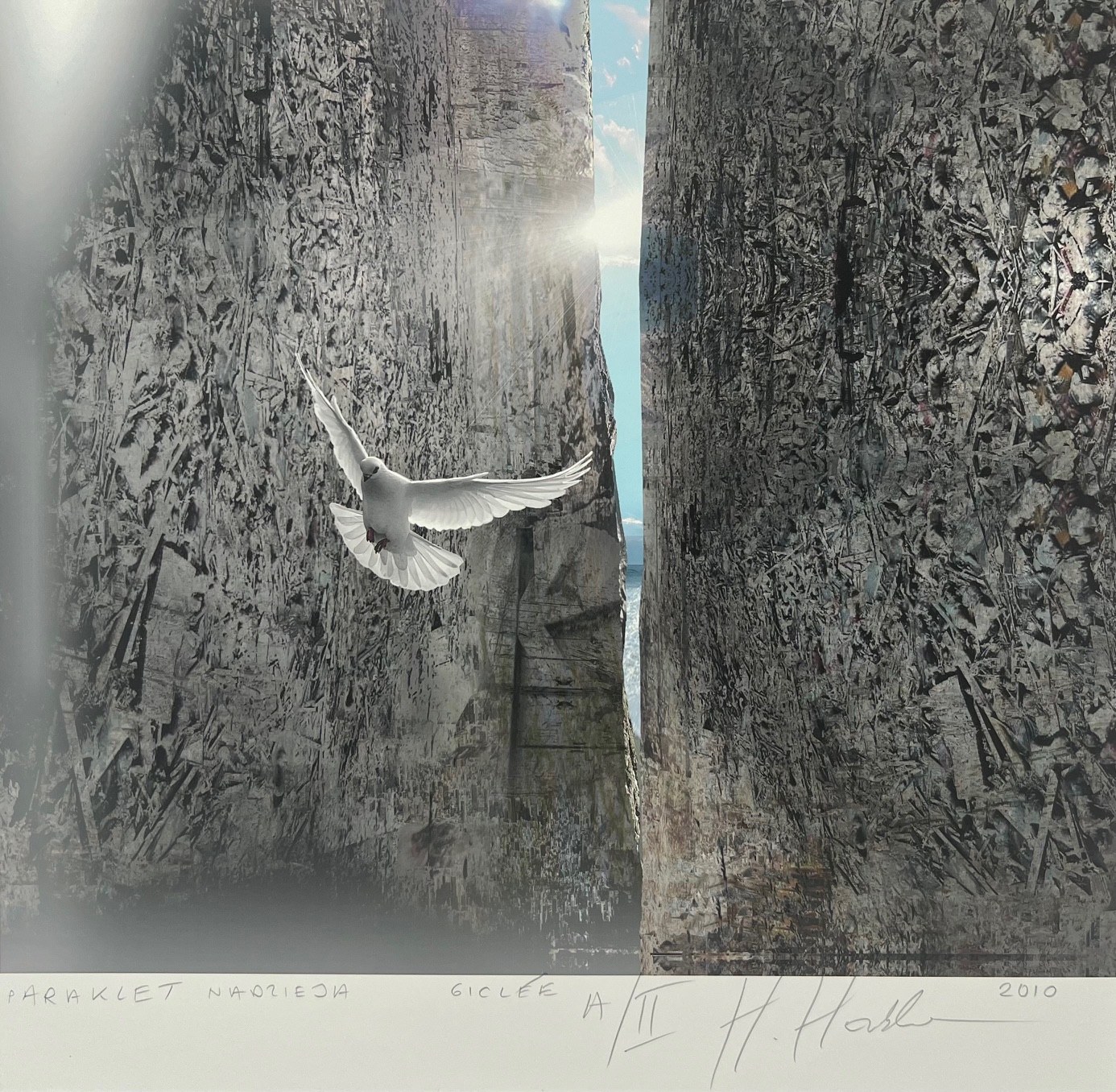 Hanna Haska vel Hanna Krulikowska, Paraklet - Nadzieja, technika własna, druk cyfrowy, giclée, odbitka autorska A/II, 30x30 cm, 2010, Grafika jest wykonana techniką własną, druk cyfrowy, giclee, przy użyciu tuszu archiwalnego na płótnie. Praca sygnowana. Artystka tworzy cykle grafik ujętych w teki. Grafiki Hanny Haskiej są opowieścią o cywilizacji, bez podziału na kultury czy kręgi cywilizacyjne. Mówią o człowieku, jego naturze, możliwościach i ograniczeniach, o metafizyce i fizyce istnienia. Pełne są symboli już istniejących użytych w swoich dotychczasowych znaczeniach, ale też nadawanych od nowa przez artystkę. Naturalizm przedstawień jest złudny, bowiem świat wyobrażeń artystki jest bez wątpienia światem symboliczno-surrealnym zawieszonym między przeszłością a przyszłością. Poza przesłaniem intelektualnym grafiki Hanny Haskiej posiadają szlachetność grafiki warsztatowej i powagę charakteryzująca stare ryciny. Grafika pięknie uzupełnia gabinetowe wnętrze, a także dobrze wygląda z drugą grafiką autorki. Artystka od wielu lat jest obecna na rynku sztuki, reprezentowana przez Galerię Kościelak. Prace z tej serii były prezentowane m.in. na Warszawskich Targach Sztuki w edycjach 2021-2023 i znalazły miejsce w wielu prywatnych kolekcjach. Stan bardzo dobry, bez oprawy. Galeria może zrealizować oprawę grafiki na zlecenie i koszt nabywcy.