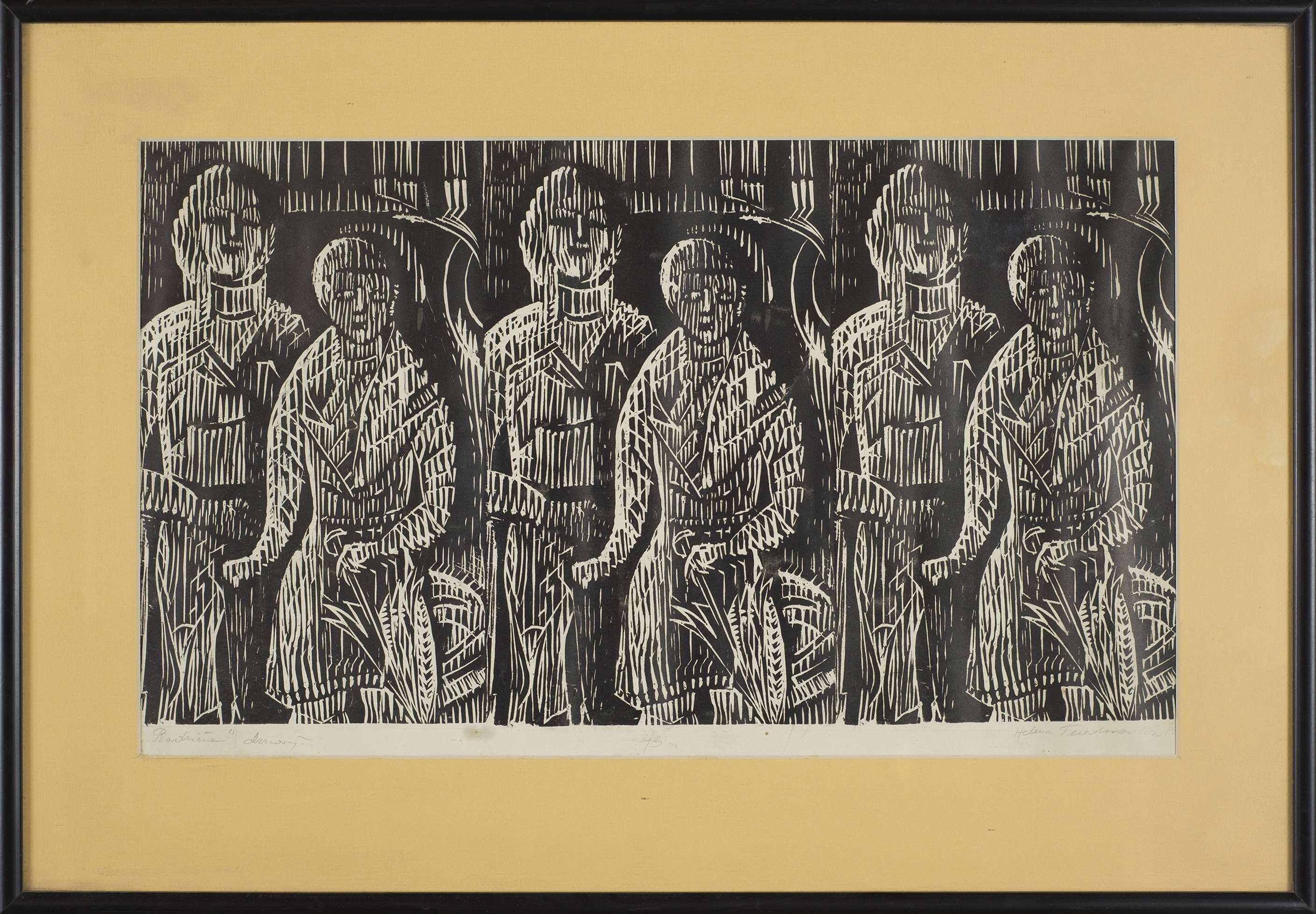 Drzeworyt (fryz odbity trzykrotnie z jednego klocka), 29 x 51,5 cm, papier 34 x 64 cm, sygn. ołówkiem d.: "Rodzina" drzeworyt 2/3 Helena Teodorowicz 1969.