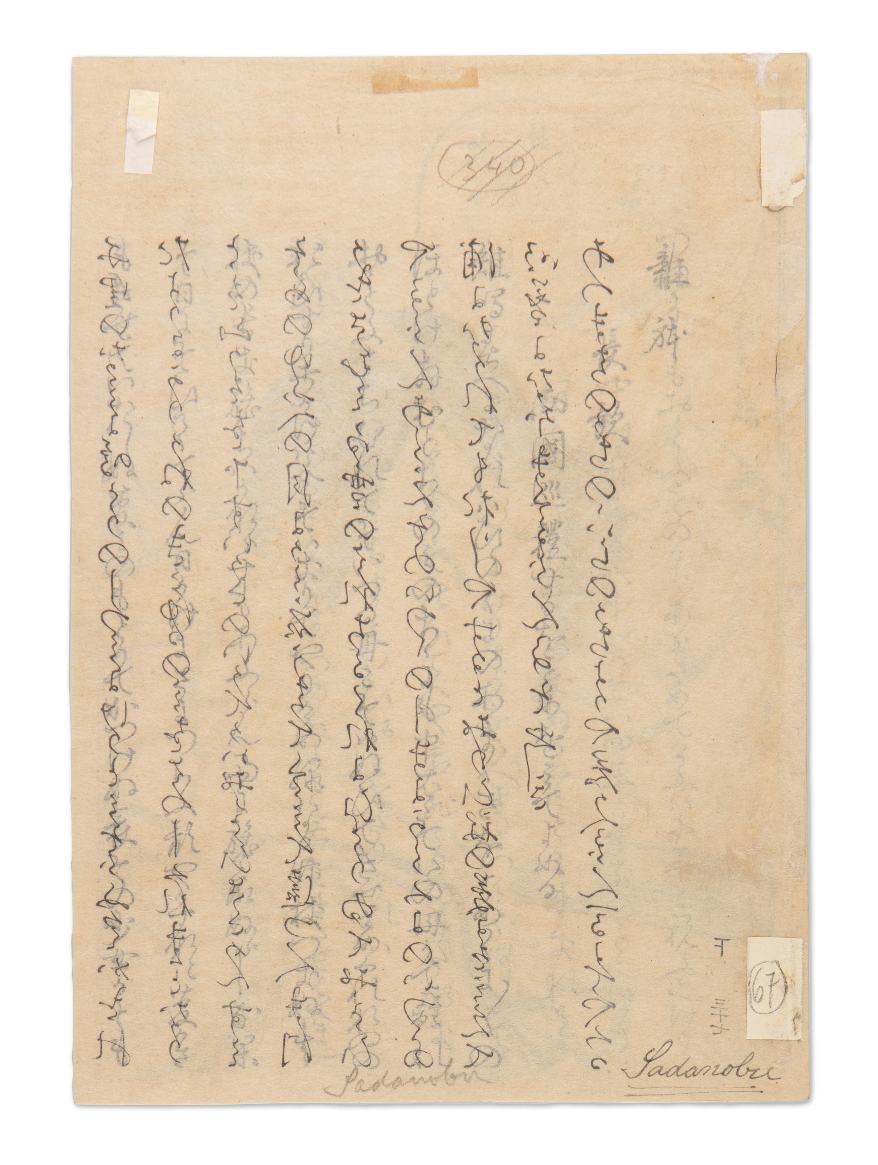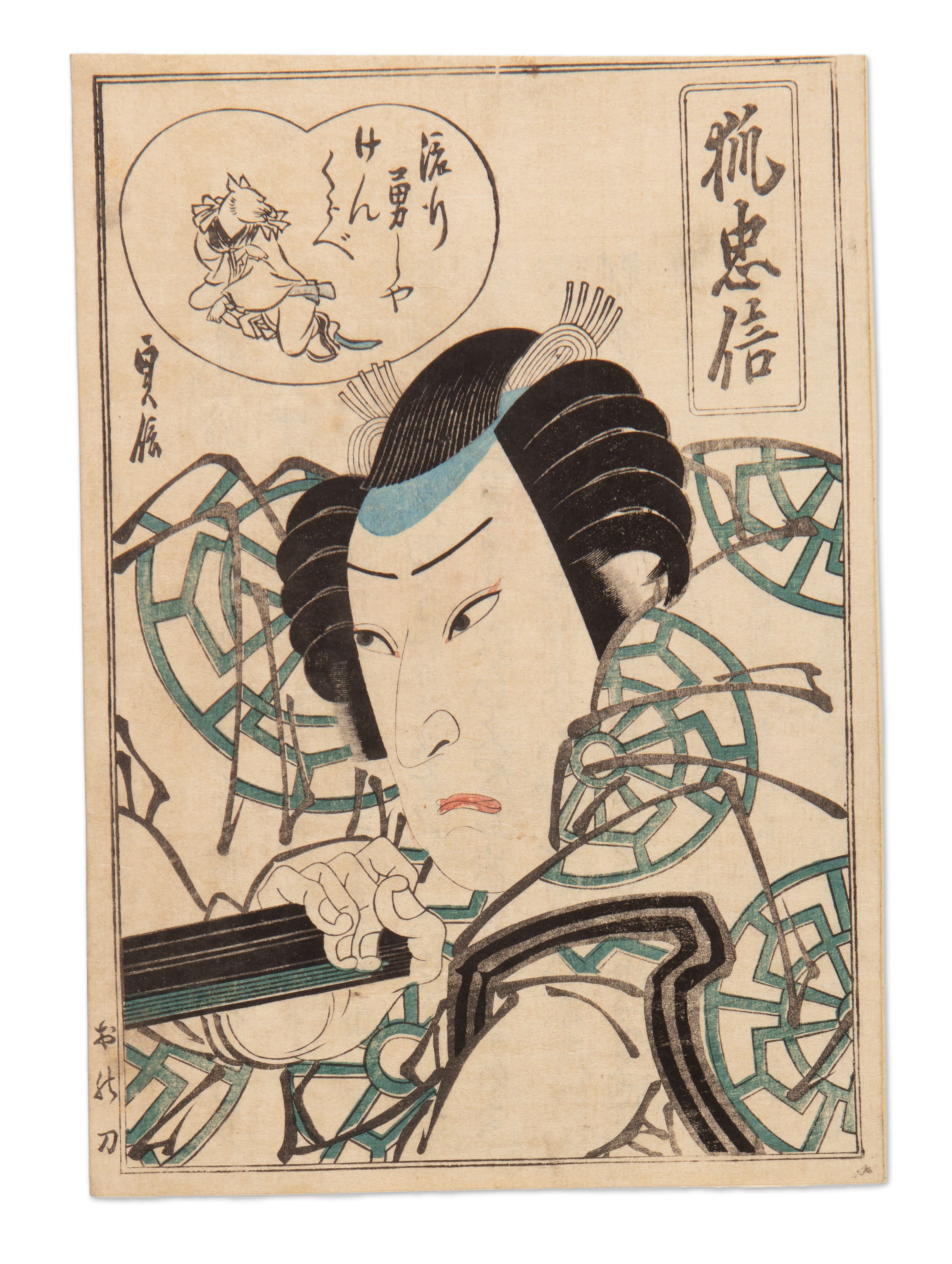 Japanese colored woodblock print (ukiyo-e), depicting the fox spirit character Tadanobu from the famous kabuki drama "Yoshitsune Senbon Zakura" (義経千本桜, "Yoshitsune and a Thousand Cherry Blossoms"). The woodblock print depicts a dramatic actor's portrait (yakusha-e) in a rich costume with distinctive blue and black drawing. The fox spirit is depicted in the upper part of the composition.