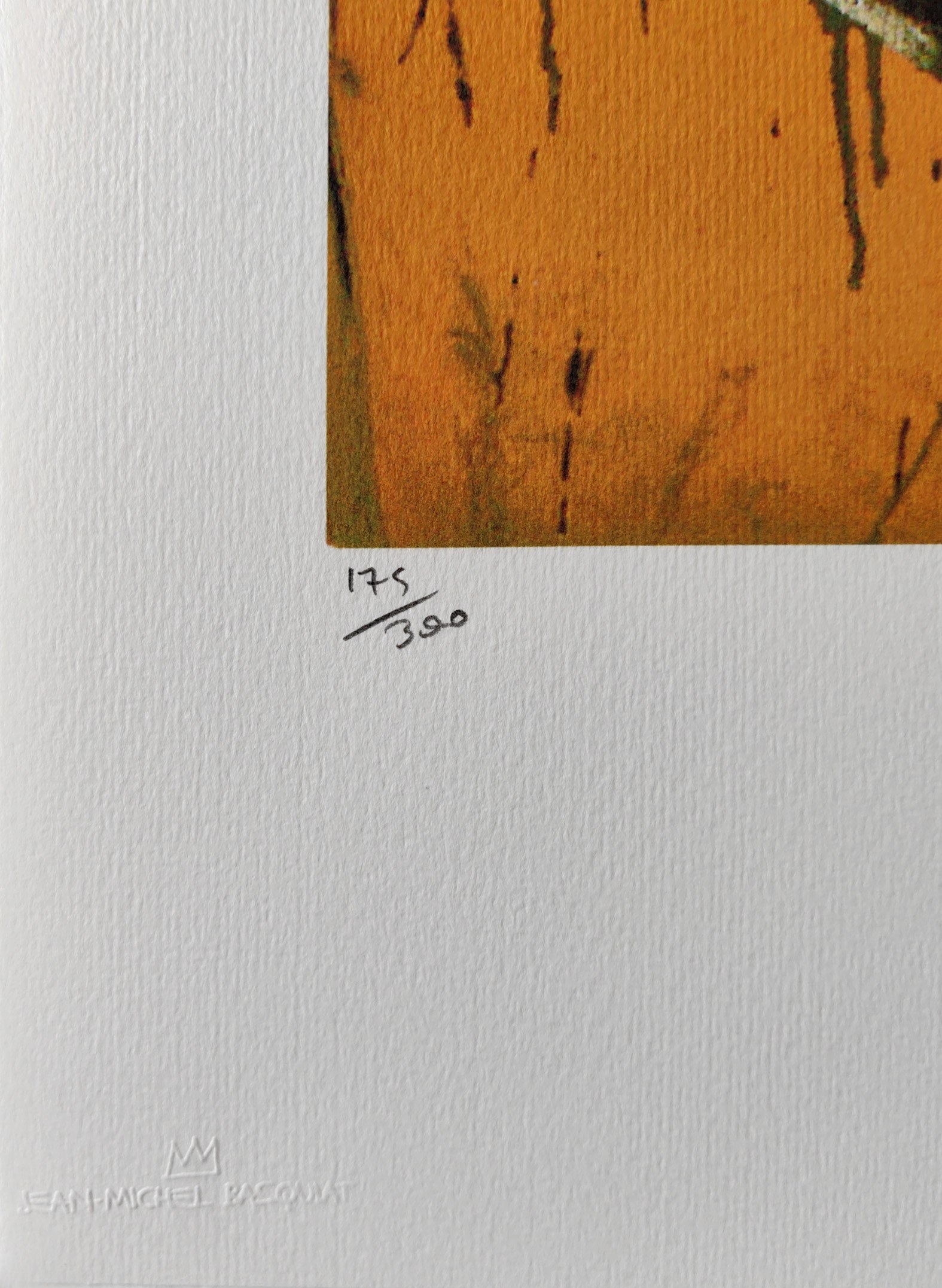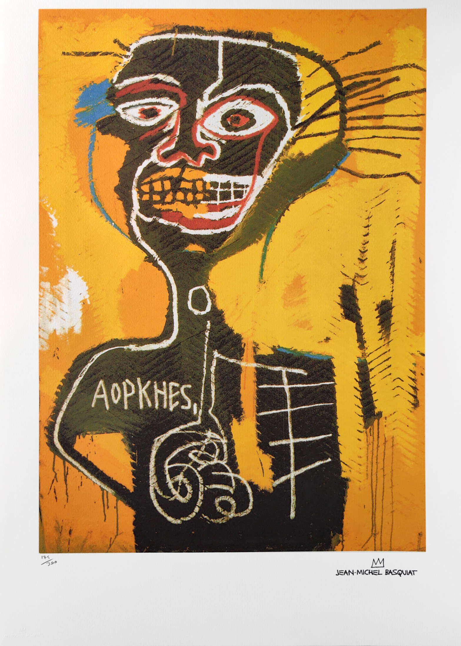 Napis ołówkiem l.d.: 175/300, p.d.: faksymile „Jean Michel Basquiat”.