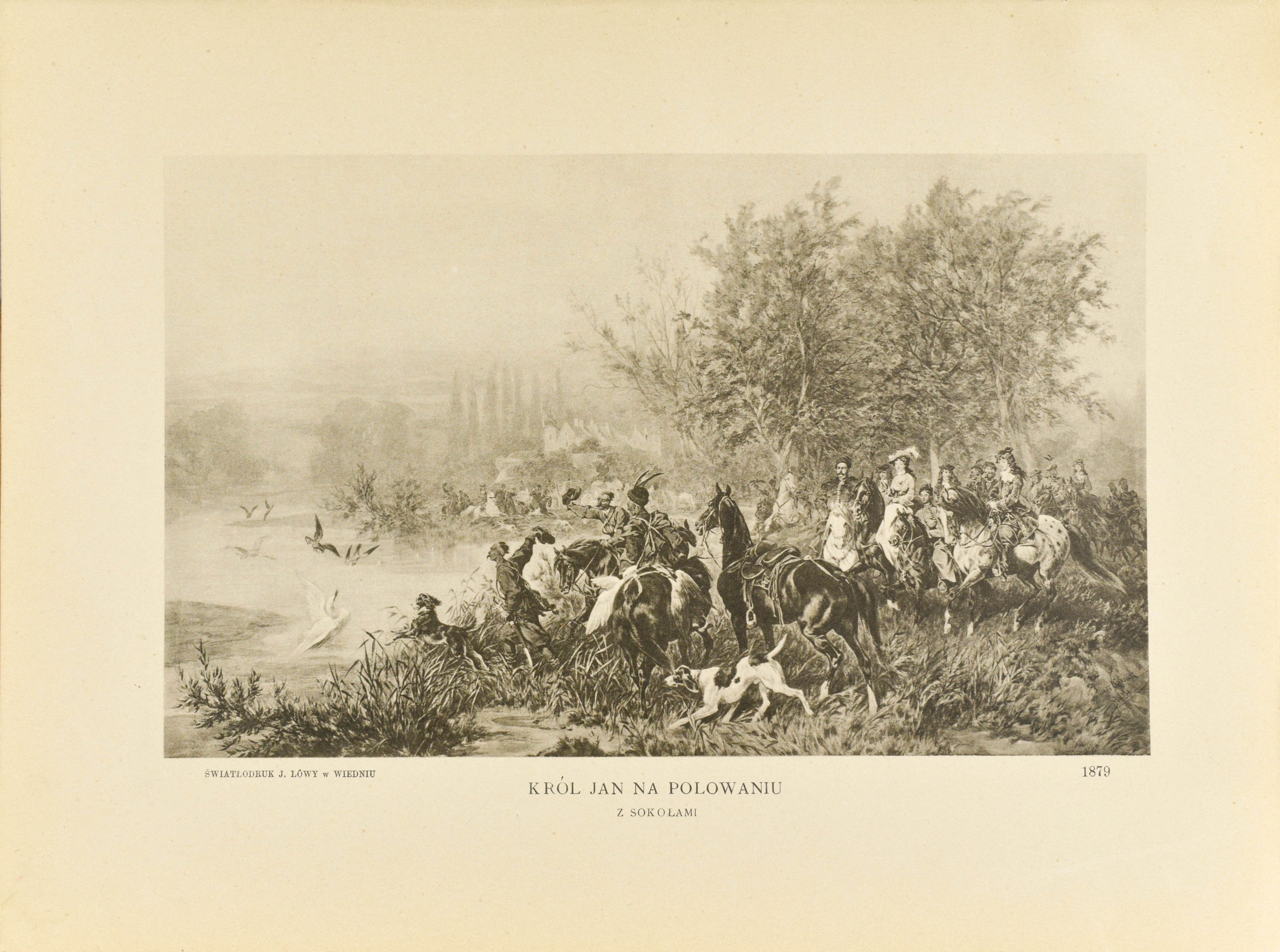 Opisany śr. d.: KRÓL JAN NA POLOWANIU Z SOKOŁAMI, l. d.: ŚWIATŁODRUK J. LOWY w WIEDNIU oraz data p. d.: 1879.
