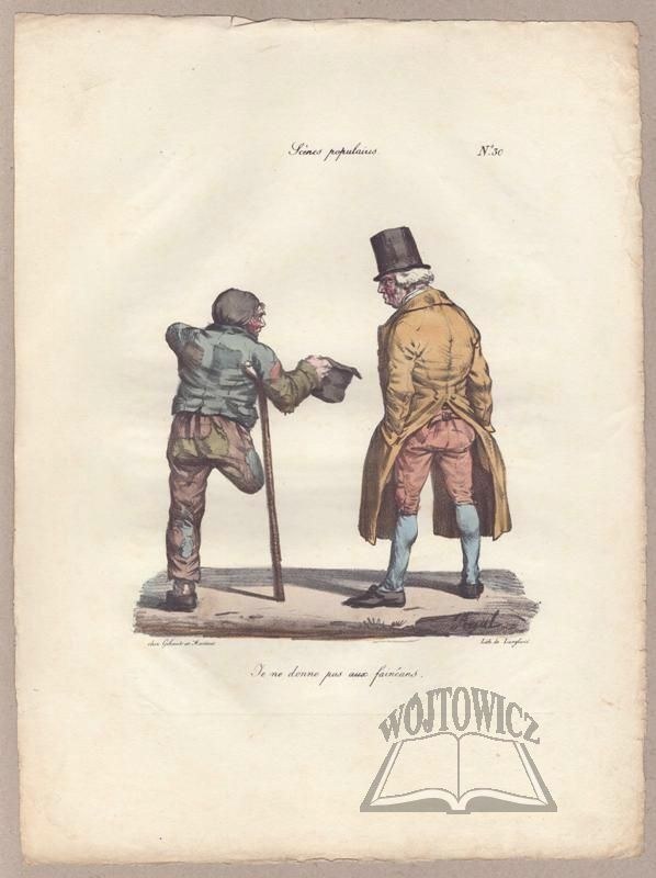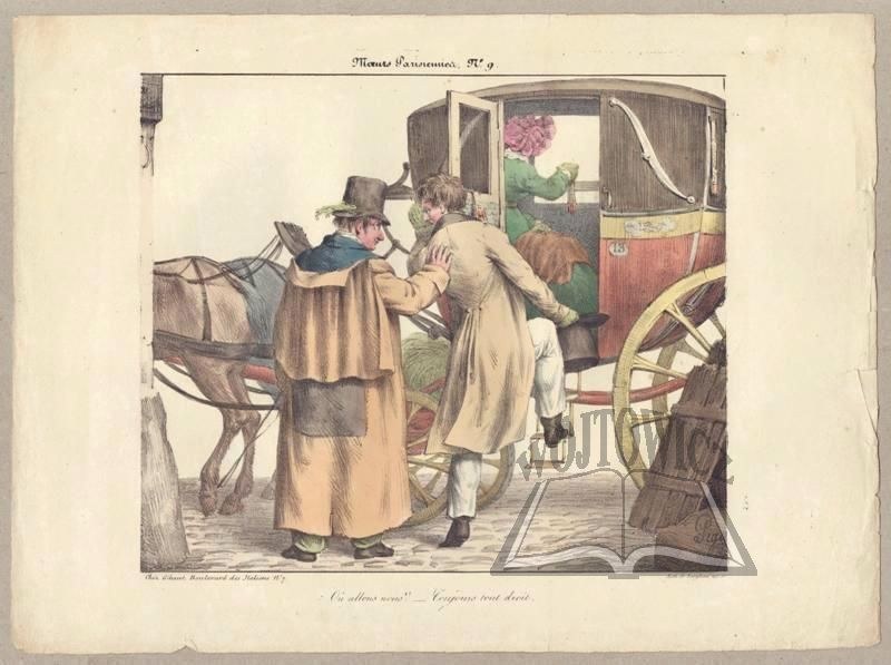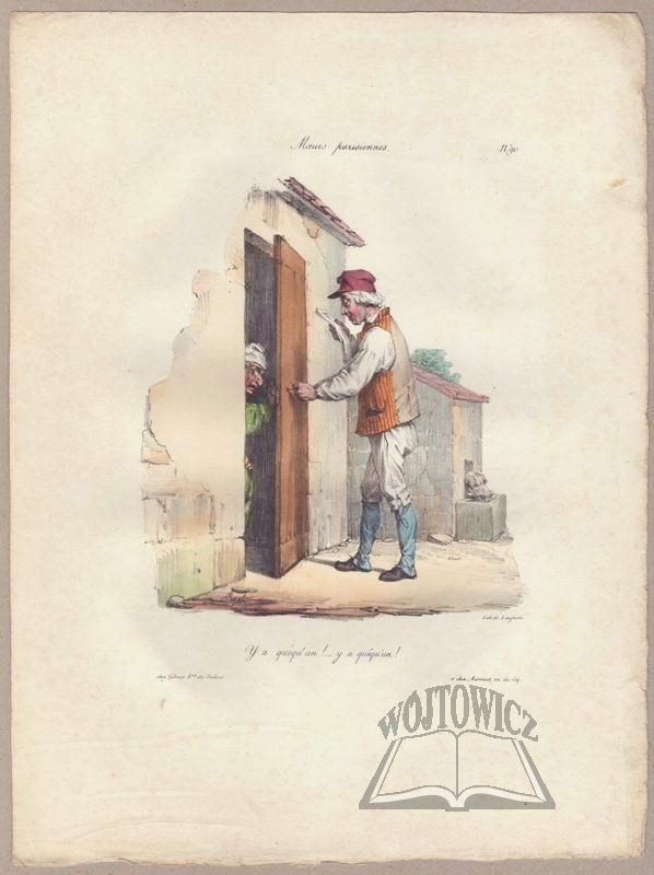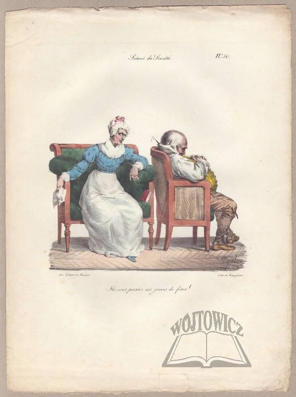 Moeurs parisiennes. (Sceny z życia społecznego). No 5, 9, 15, 18, 22, 30, 44, 46, 47, 51, 53, 82, 87, 90, 92. 94. Scénes de société. No 2, 39, 50. Scénes populaires. No 30. 20 kolor. litografii, wszystkie sygn. na pł.: Pigal. Pod komp. sygn.: chez Gihaut et Martinet, Lith. de Langlumé, poniżej zabawny tekst franc. [Wyd. Paryż, ca 1822-30]. Wym. ark.: 35,6 x 27,2 cm. [1 tabl. obcięta].