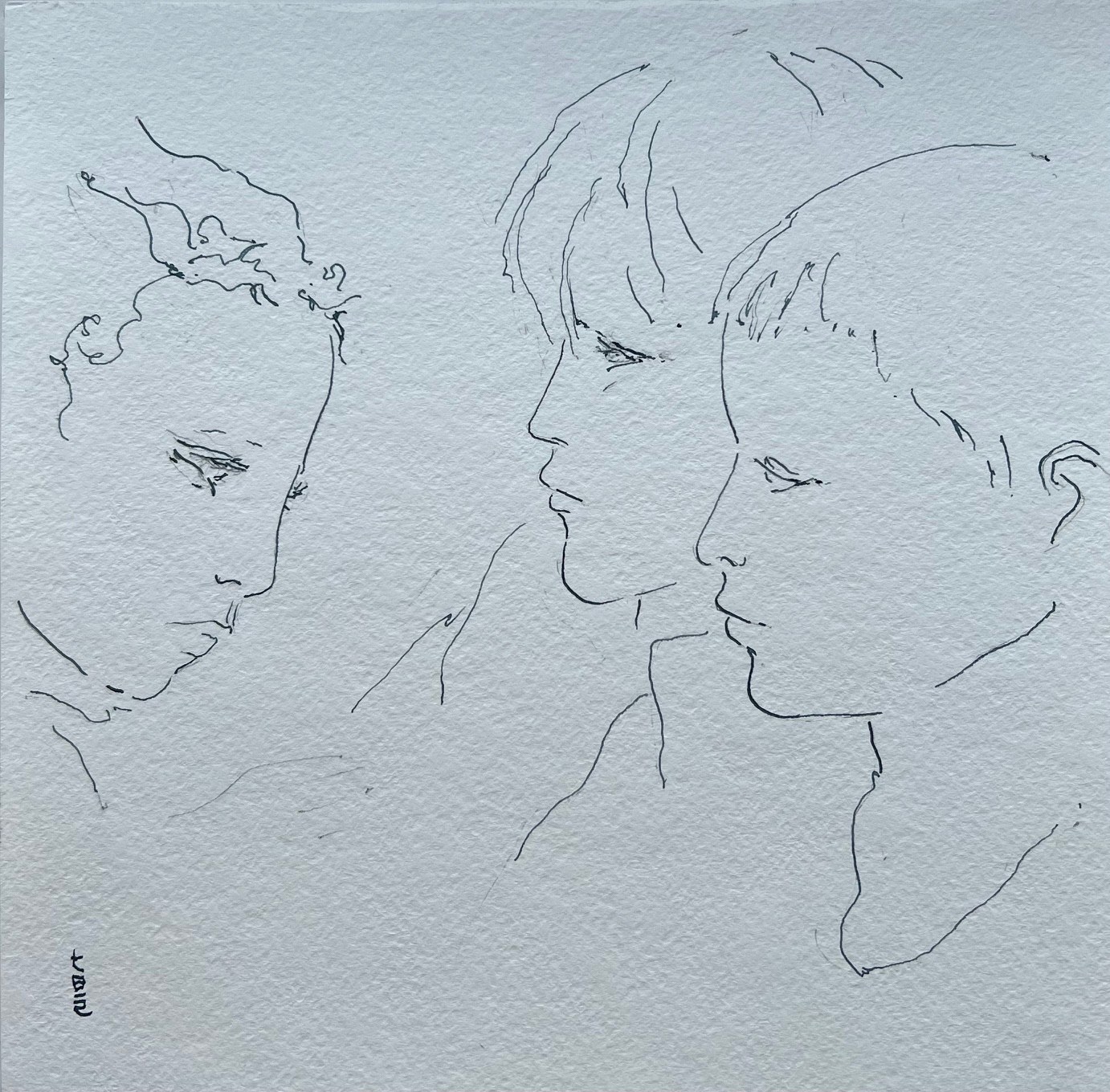 Katarzyna Haber, Dzieci, rysunek piórkiem i tuszem na papierze, 23x23 cm, 2022. Autorka rysuje portrety swoich dzieci, koty, wnętrza, scenki rodzajowe. Tworzone śmiałą linią rysunki piórkiem i tuszem na papierze rysunkowym, brystolu, kartonie budzą skojarzenia z Henri Matissem lub notatkami Józefa Czapskiego, są jednak całkowicie wolne od jakiegokolwiek zapatrzenia się na twórczość innego artysty. Artystka rysując swoje dzieci, wnętrze mieszkania, koty, manifestuje swoją wolność od wszelkich ograniczeń i tworzy notatki ulotnej codzienności oraz ciepło uczuć wobec swoich dzieci. Jest to w pewien sposób „manifest feministyczny” nie obrazoburczy, a bez kompleksów afirmujący macierzyństwo, które nie stoi w sprzeczności z karierą zawodową czy z twórczością kobiety. Stan dzieła bardzo dobry, bez oprawy. Galeria może zrealizować oprawę rysunku na zlecenie i koszt nabywcy.